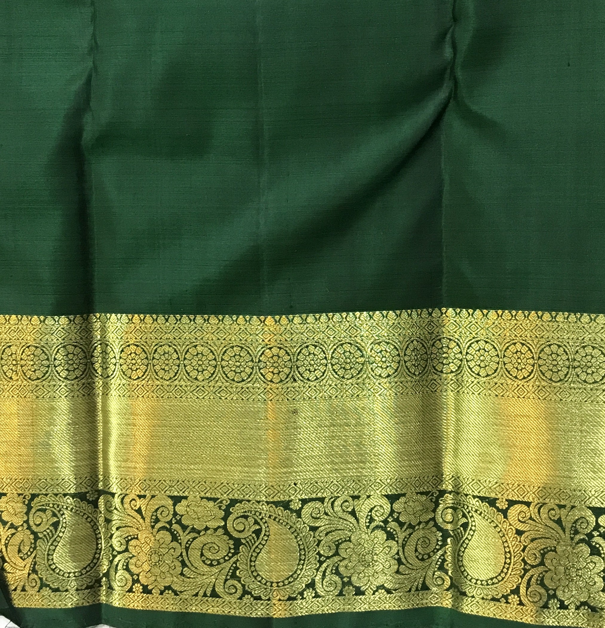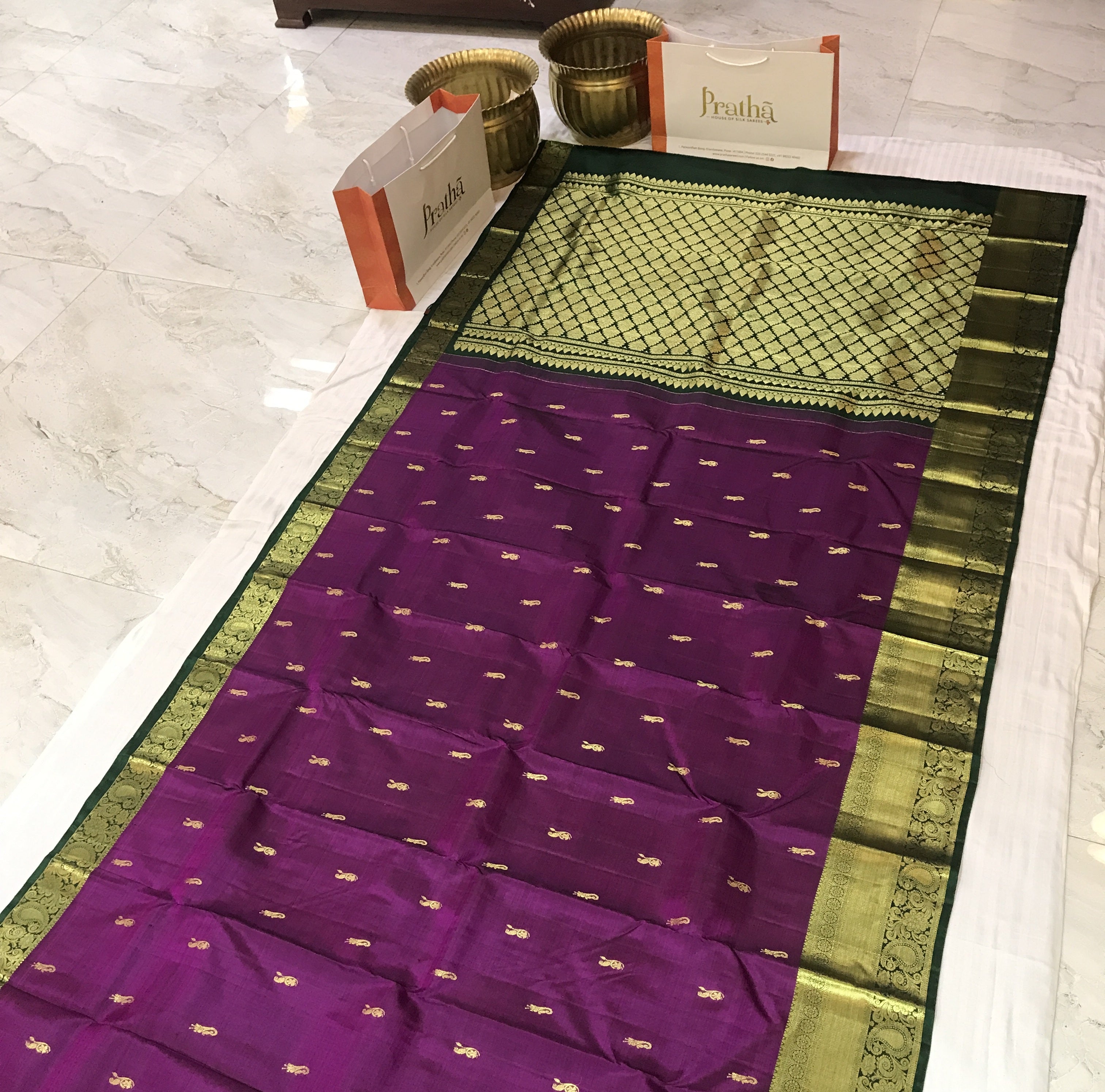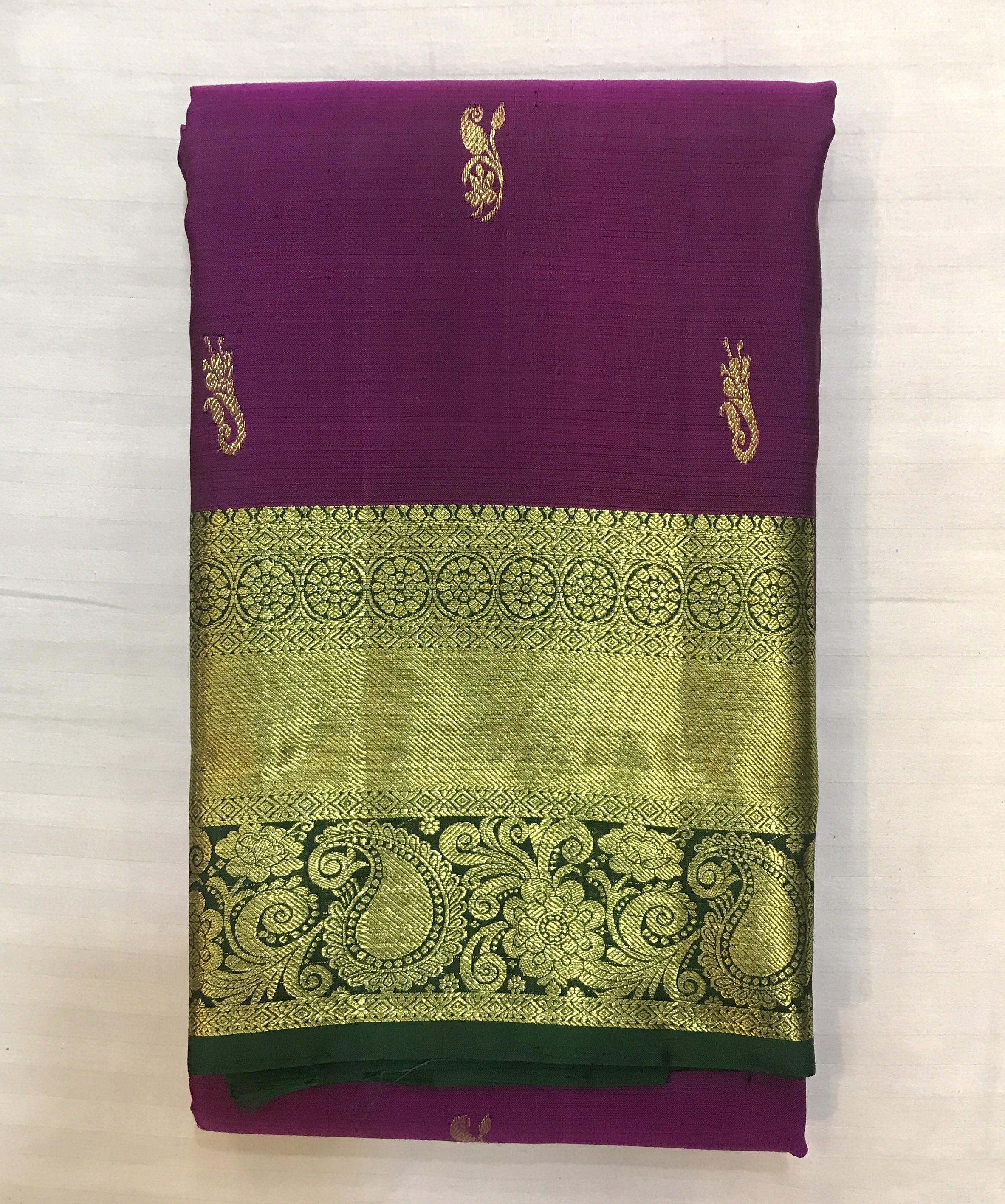 A beautiful shade of magenta and contrast green broad golden zari border pure silk handwoven Kanjeevaram looks great, this one is lustrous and perfectly traditional. The intricate unique shaped butti woven in golden zari with richly woven zari pallu make this weave a classic! This Kanjeevaram will look great in the day as well as at night!