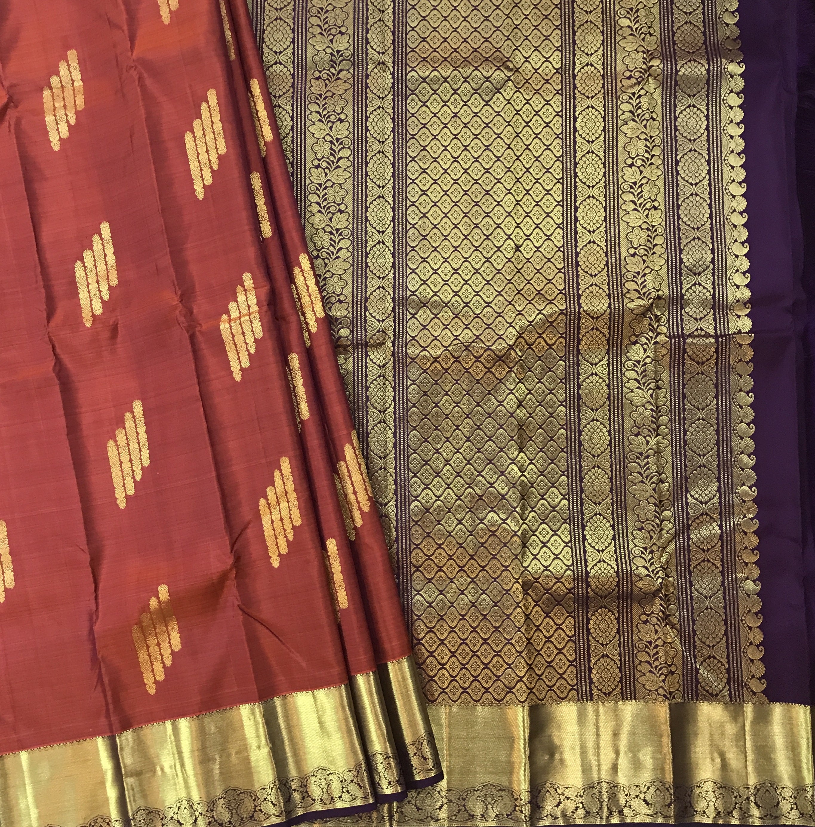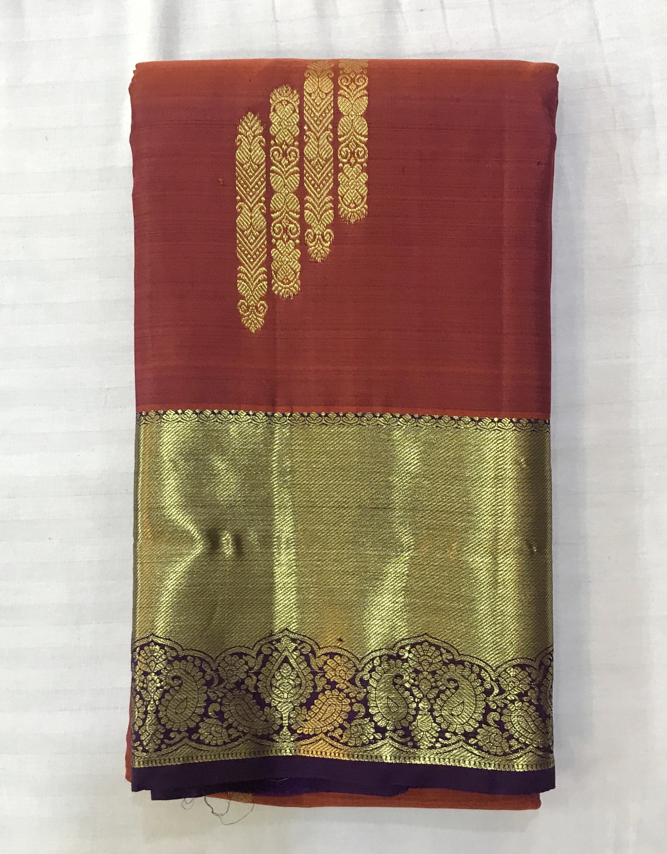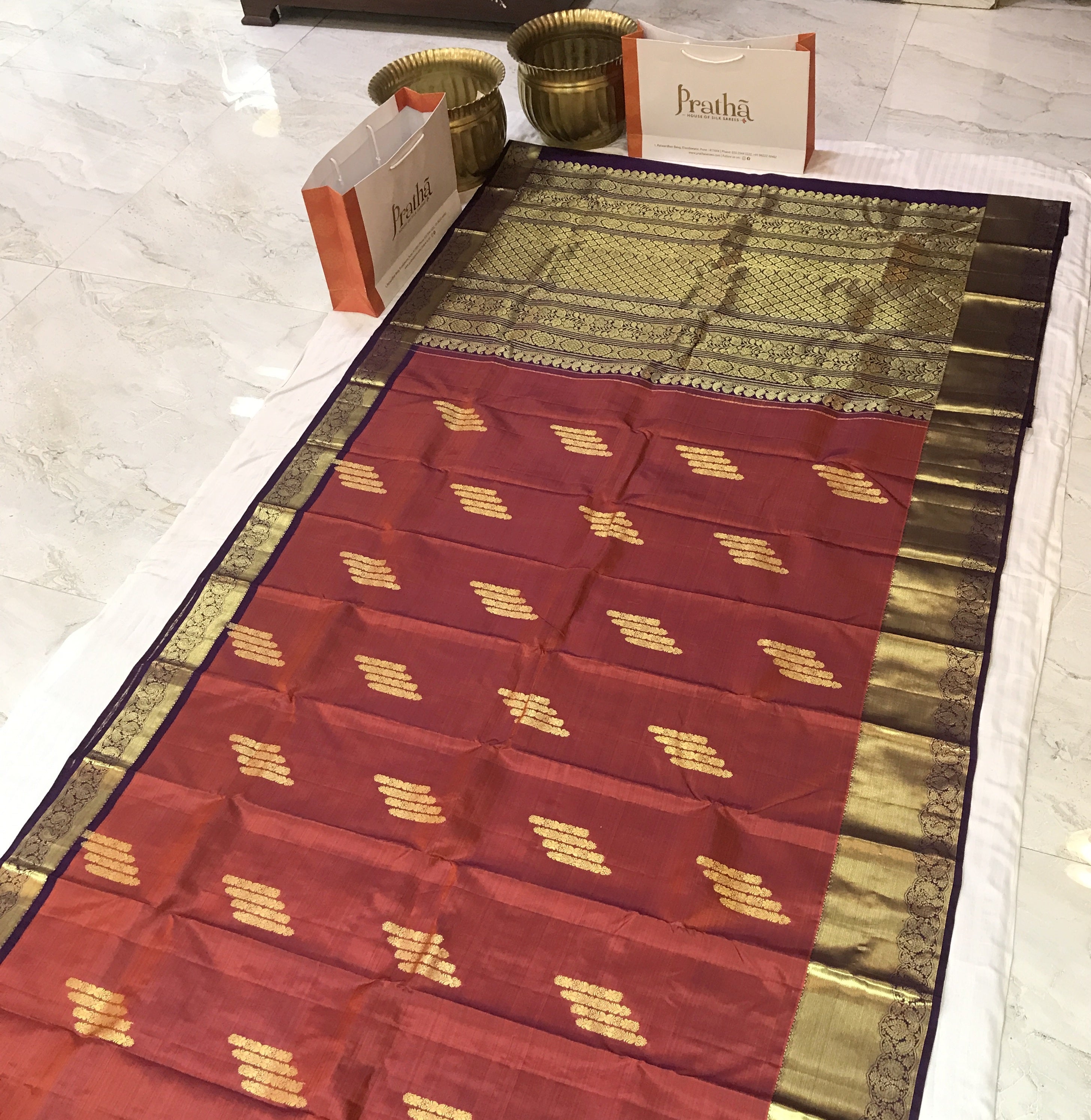 A very beautiful maroon shade of pure silk handwoven Kanjeevaram, this one is perfectly traditional. The delicate butti designs, golden zari border and richly woven Pallu make this weave a classic! Thanks to its beautiful colour with the combination of gold, this Kanjeevaram will look great in the day as well as at night! Do not miss that, this saree has a very beautiful golden zari border looks outstanding when we wear.