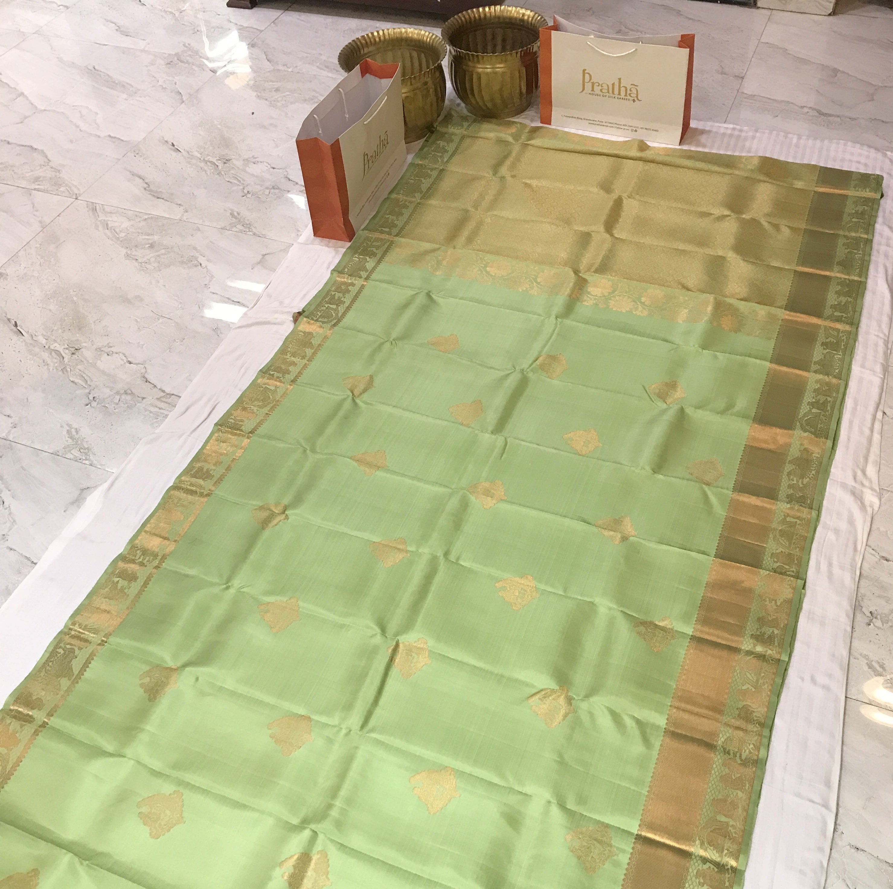 This elegant pista-green pure silk Kanjeevaram saree beautifully captures the charm of traditional craftsmanship with its soft, lustrous finish. The body features delicately woven golden zari buttis in unique floral-inspired shapes, adding a subtle yet striking richness to the serene green base. The saree is framed with a self-coloured golden zari border, intricately detailed to enhance its regal appeal. The highlight of this weave is its richly crafted zari pallu, adorned with fine traditional motifs that elevate the overall grandeur of the saree. Perfectly balanced in colour and design, this Kanjeevaram makes an exquisite choice for both daytime festivities and evening celebrations, offering timeless elegance with every drape.