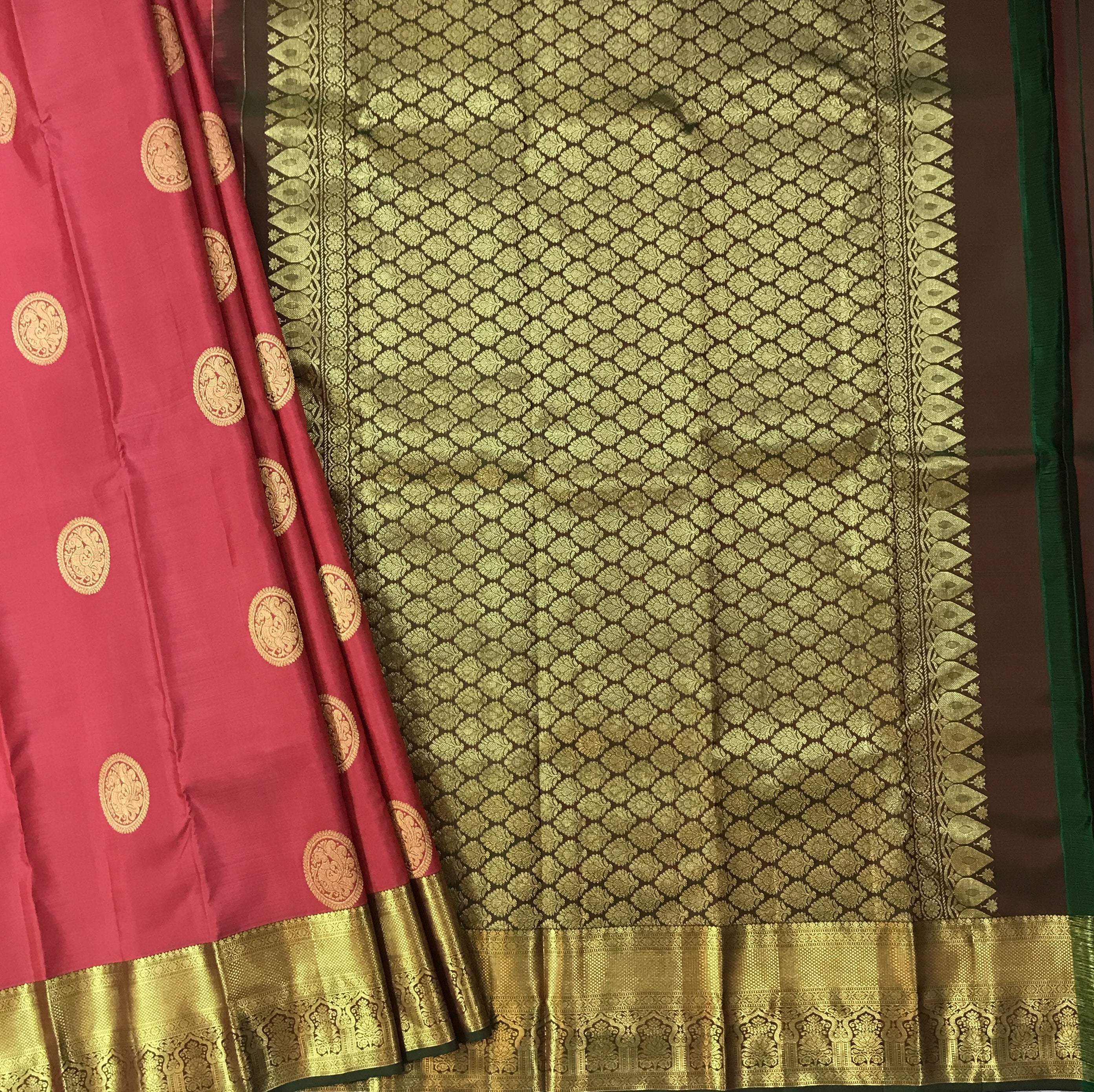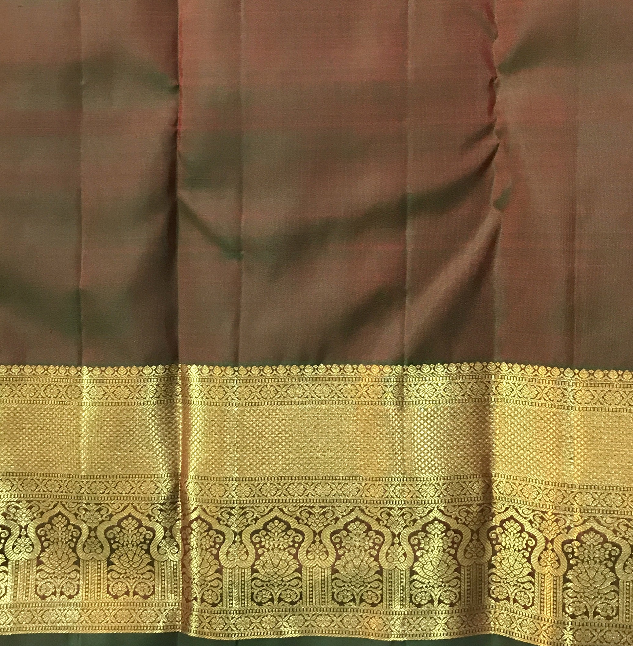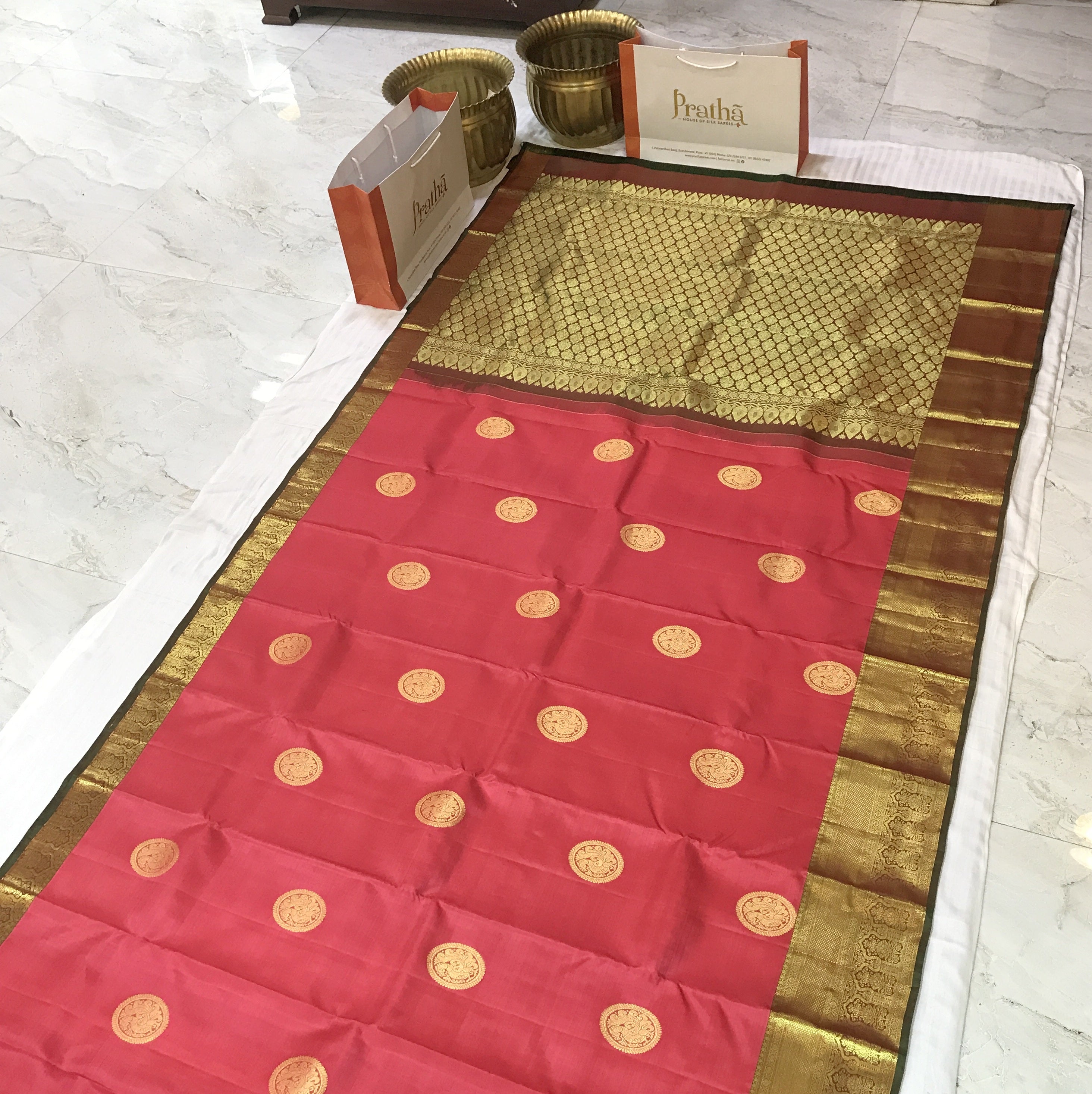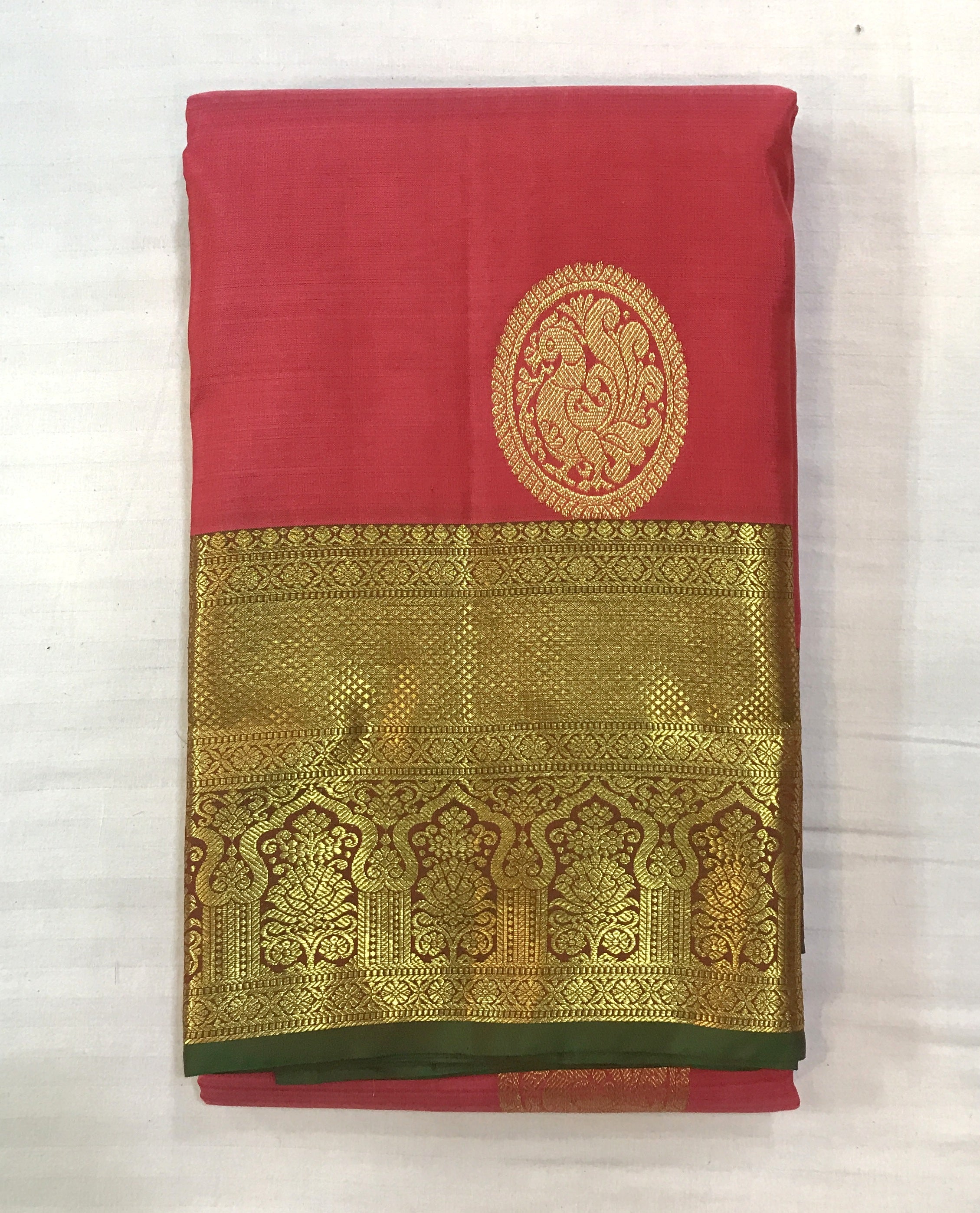 A beautiful shade of peach-pink and self coloured golden zari border pure silk handwoven Kanjeevaram looks great, this one is lustrous and perfectly traditional. The intricate peacock shaped butti woven in golden zari and golden zari border with richly woven zari pallu make this weave a classic! This Kanjeevaram will look great in the day as well as at night!