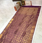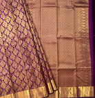 This regal purple handwoven Kanjeevaram saree exudes timeless grandeur with its richly woven golden zari jaal spread gracefully across the body. The intricate floral motifs shimmer beautifully against the deep purple base, giving the weave a luxurious and traditional appeal. The pallu features elaborate zari work with fine detailing, enhancing the overall opulence of the saree. Completed with a classic golden zari border, this masterpiece is a perfect choice for weddings, festive occasions, and anyone who loves truly magnificent traditional Kanjeevarams.