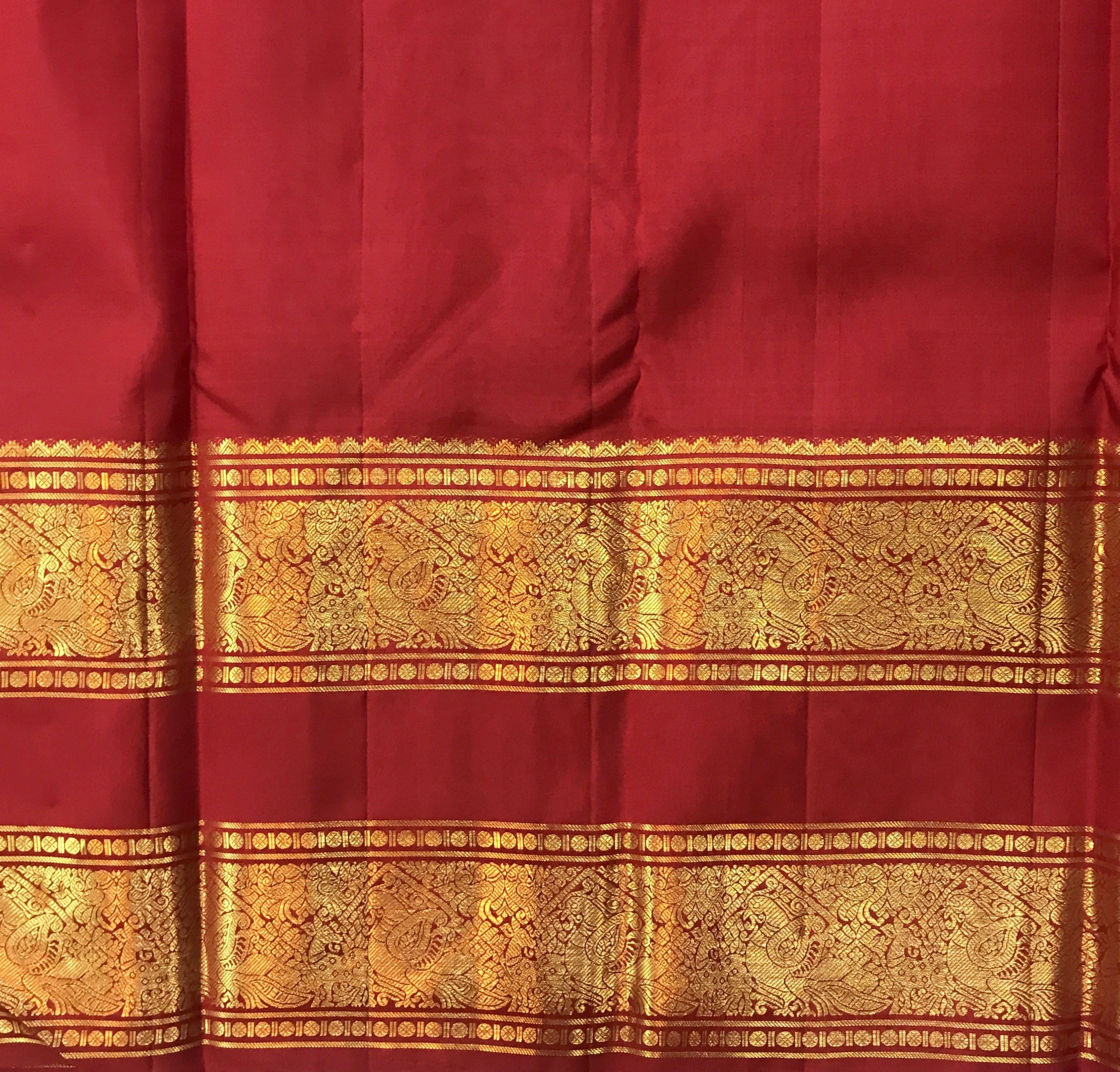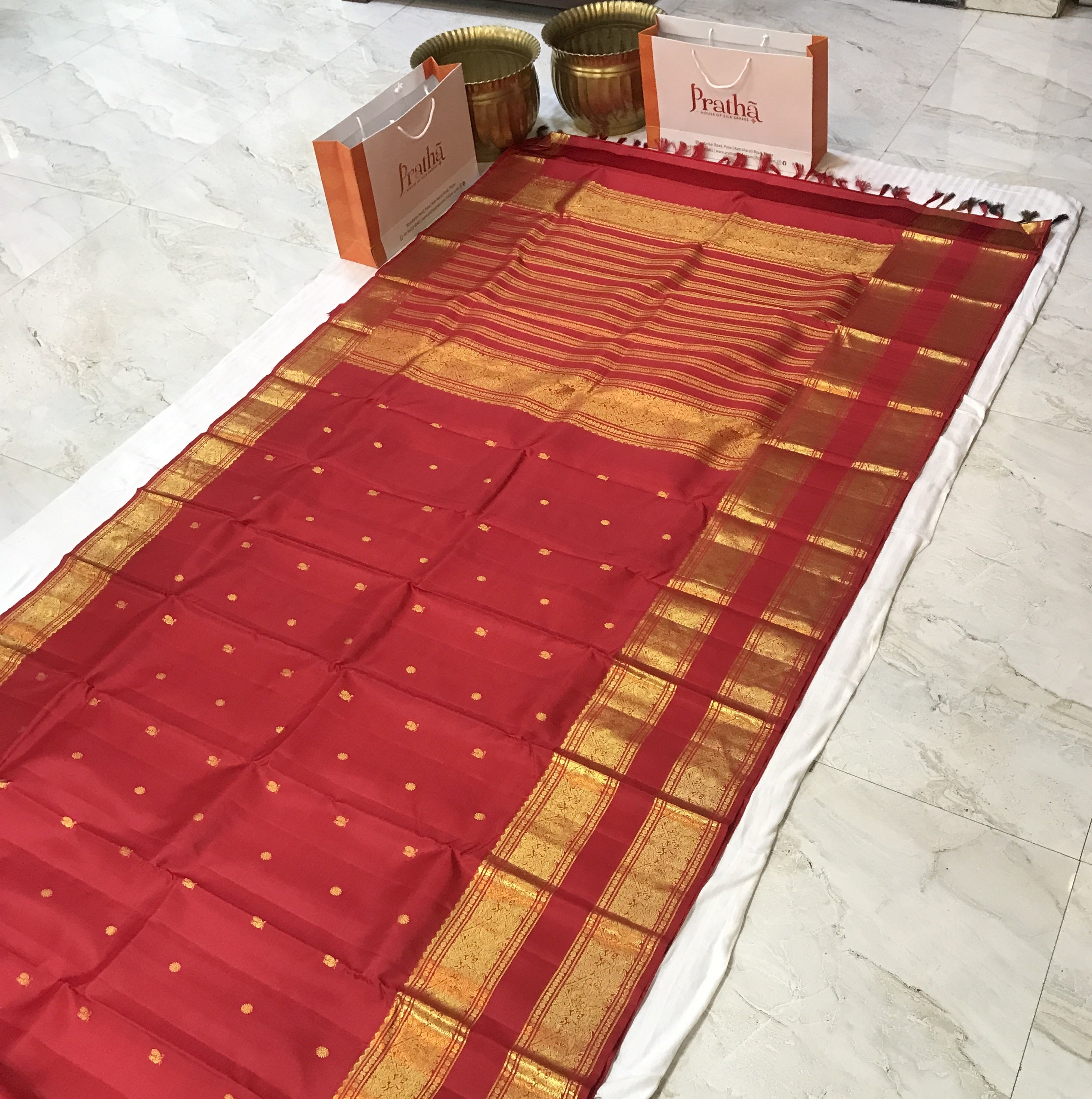 This elegant red silk saree features delicate gold zari buttas scattered across the body, giving it a subtle and refined look. The saree is beautifully complemented by a rich gold zari border with traditional woven motifs, while the pallu showcases striking vertical zari stripes along with intricate gold patterns, adding depth and grandeur to the design. The vibrant red shade combined with the luxurious gold weaving creates a timeless and festive appeal, making this saree an excellent choice for weddings, festivals, and special traditional occasions.