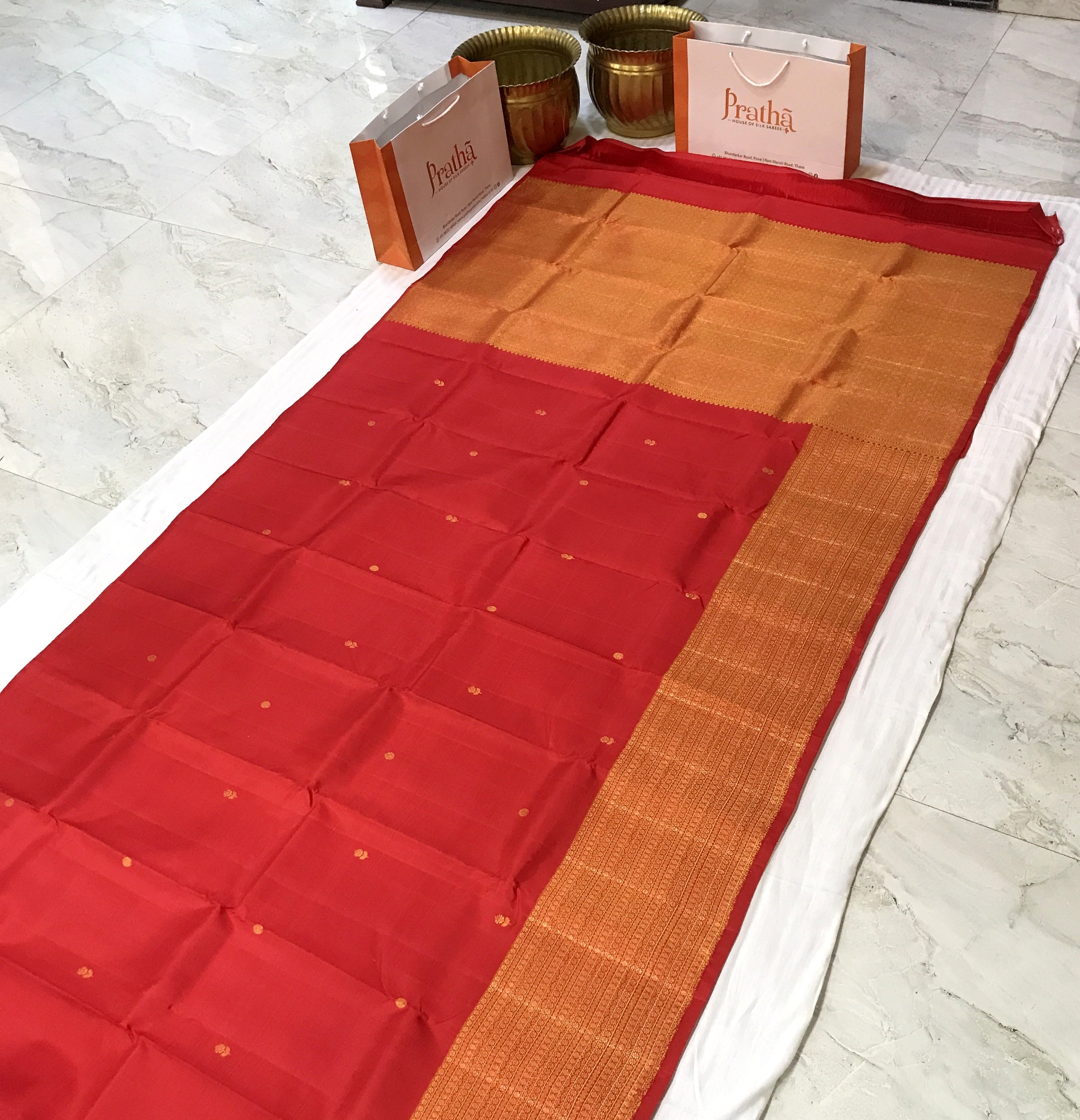 The classic shade of red with a golden zari border Kanjeevaram looks fabulous with its small butti woven in golden zari thread. The elegant self coloured broad border richly enhances the overall drape, while the golden zari golden pallu complements the body beautifully, completing the regal look.