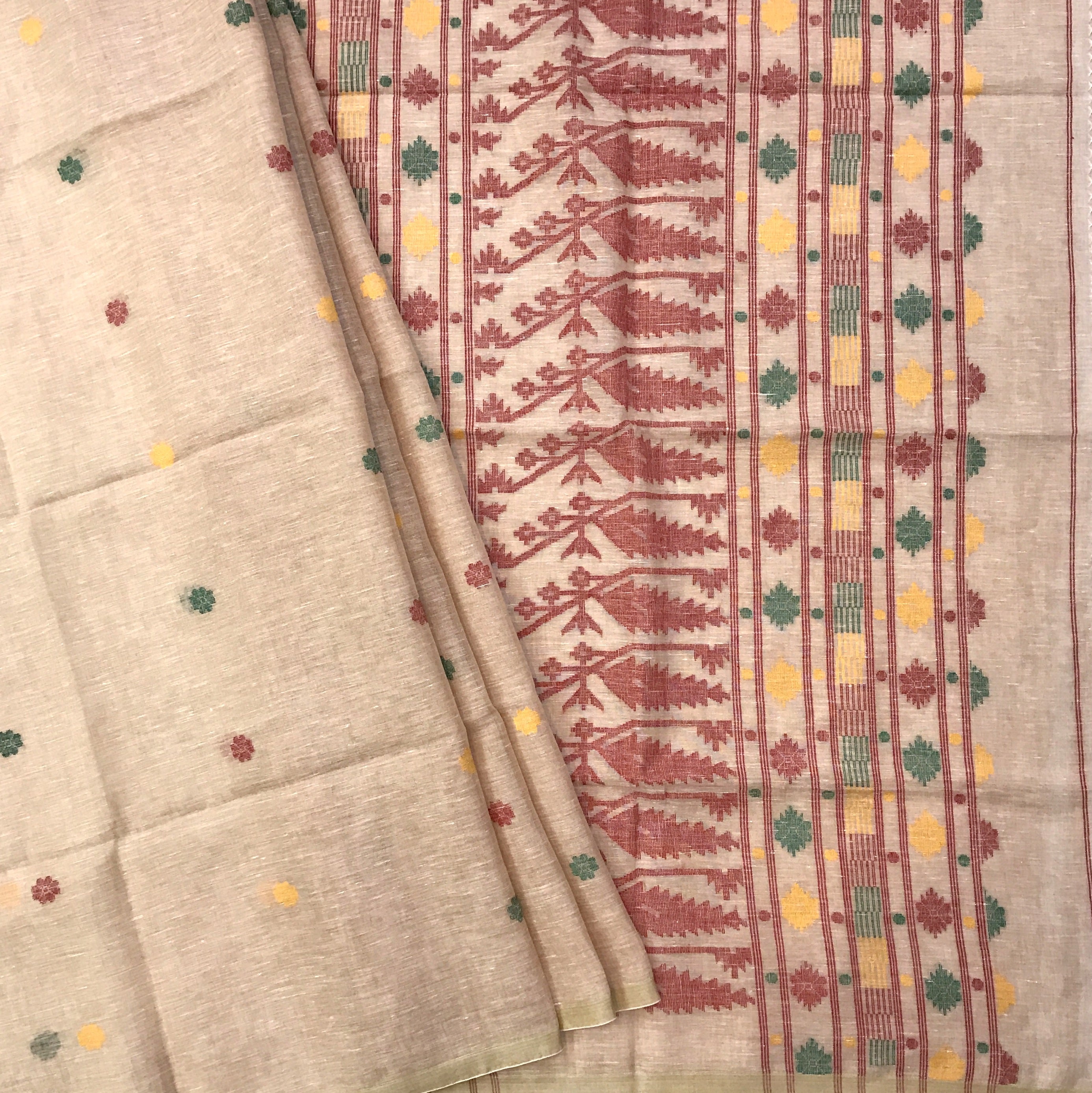 Celebrating the elegance of traditional weaving, this beautiful Jamdani saree reflects timeless artistry and subtle sophistication. Set on a graceful natural beige base, the saree features delicately woven multicolour Jamdani buttas scattered across the body, adding a soft yet vibrant charm. The highlight of this saree is its richly designed Jamdani pallu, adorned with intricate traditional motifs and geometric patterns woven in earthy red, green, and yellow tones, creating a striking contrast against the understated body. The harmonious blend of subtle texture and colourful detailing makes this saree perfect for festive gatherings, cultural occasions, and elegant daytime events, offering a refined and effortlessly graceful look.