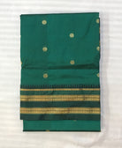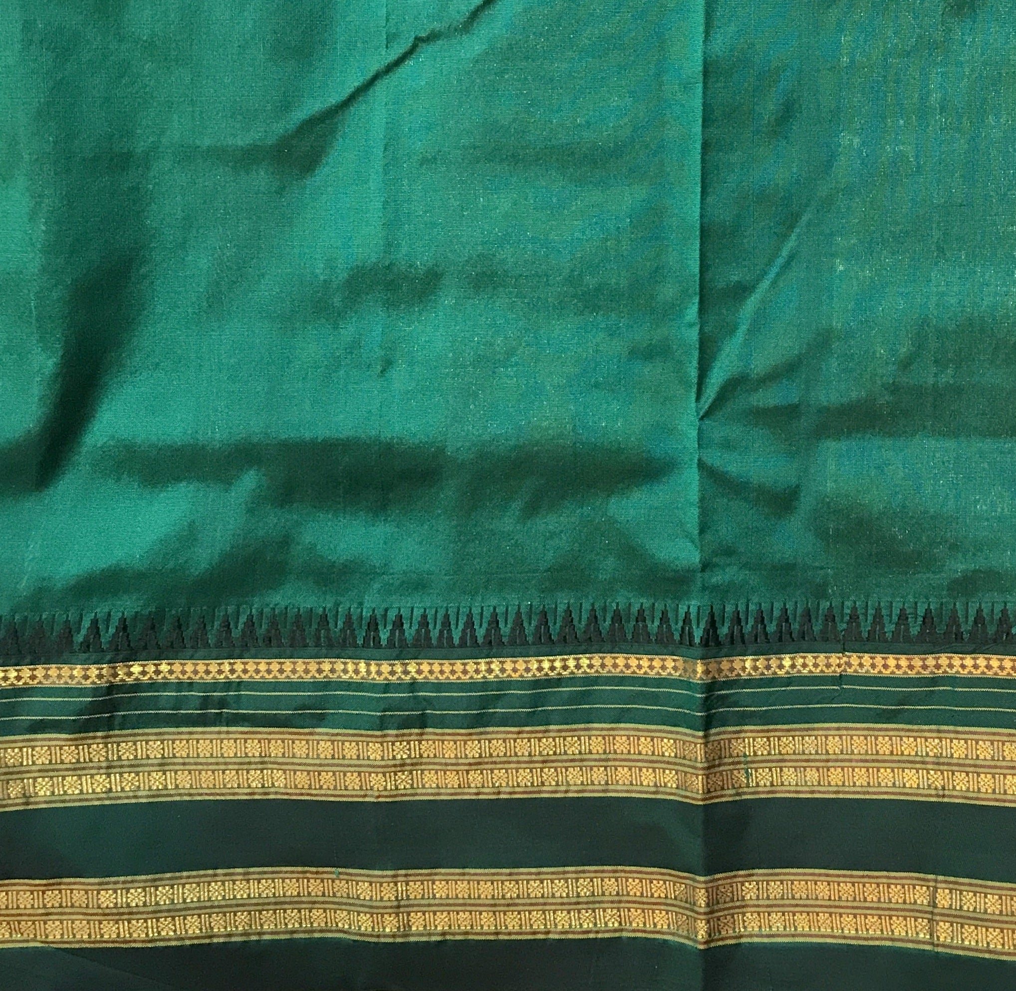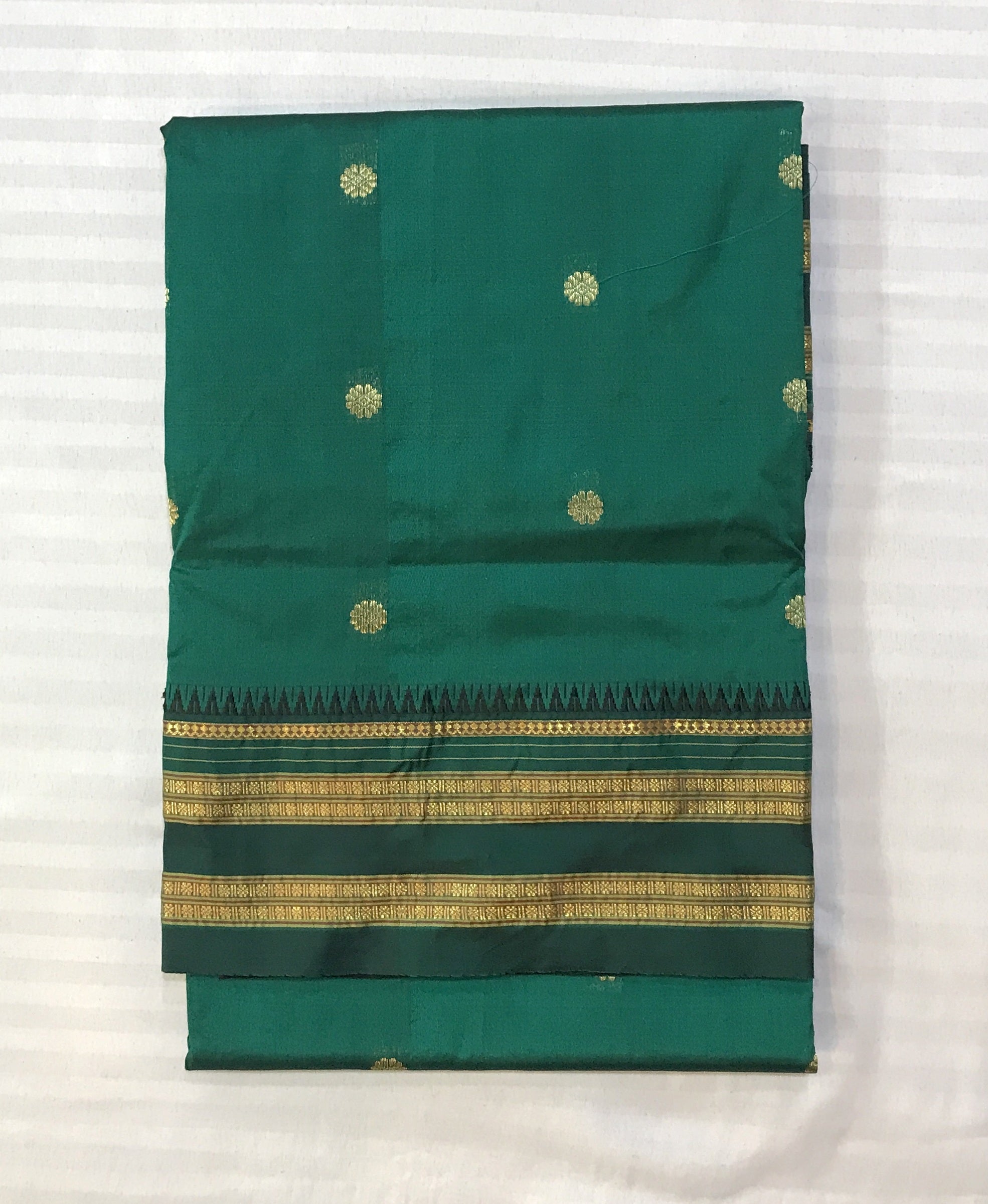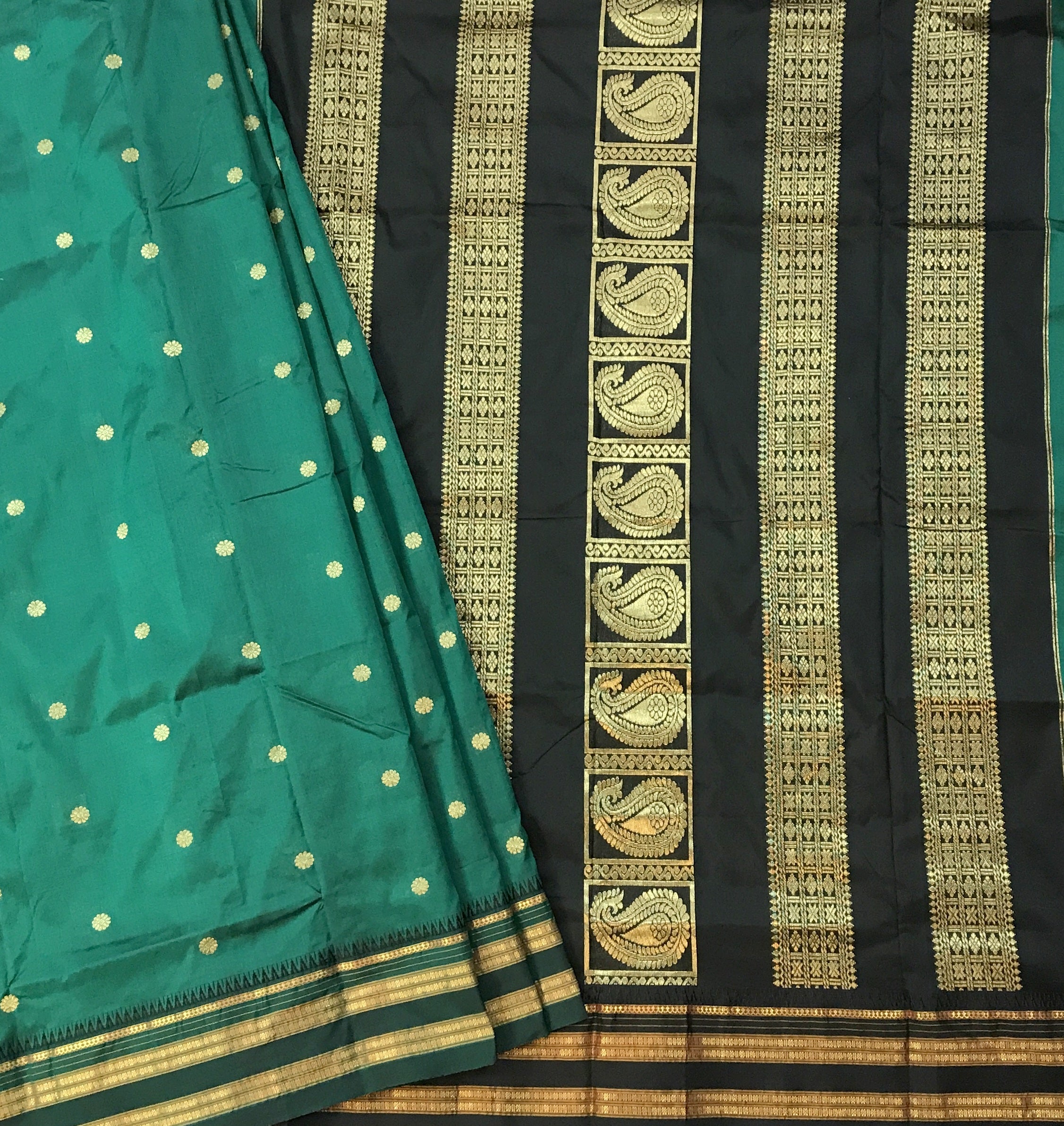 A very pretty shade of green Narayanpeth saree with a delicate butti woven in golden zari with golden zari border looks very outstanding and contrast black color golden zari pallu. Light in weight and easy to drape. Perfect saree for summers!