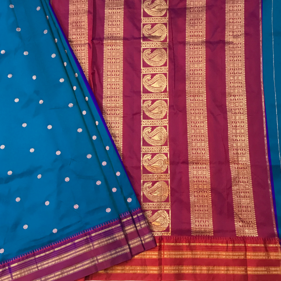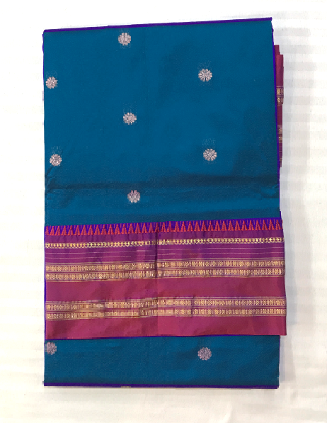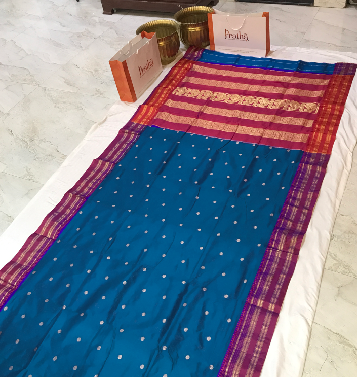 A very pretty shade of blue Narayanpeth saree with a delicate butti woven in pink golden zari with golden zari border looks very outstanding and golden zari pallu. Light in weight and easy to drape. Perfect saree for summers!