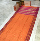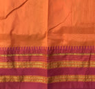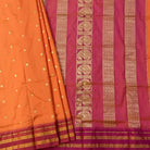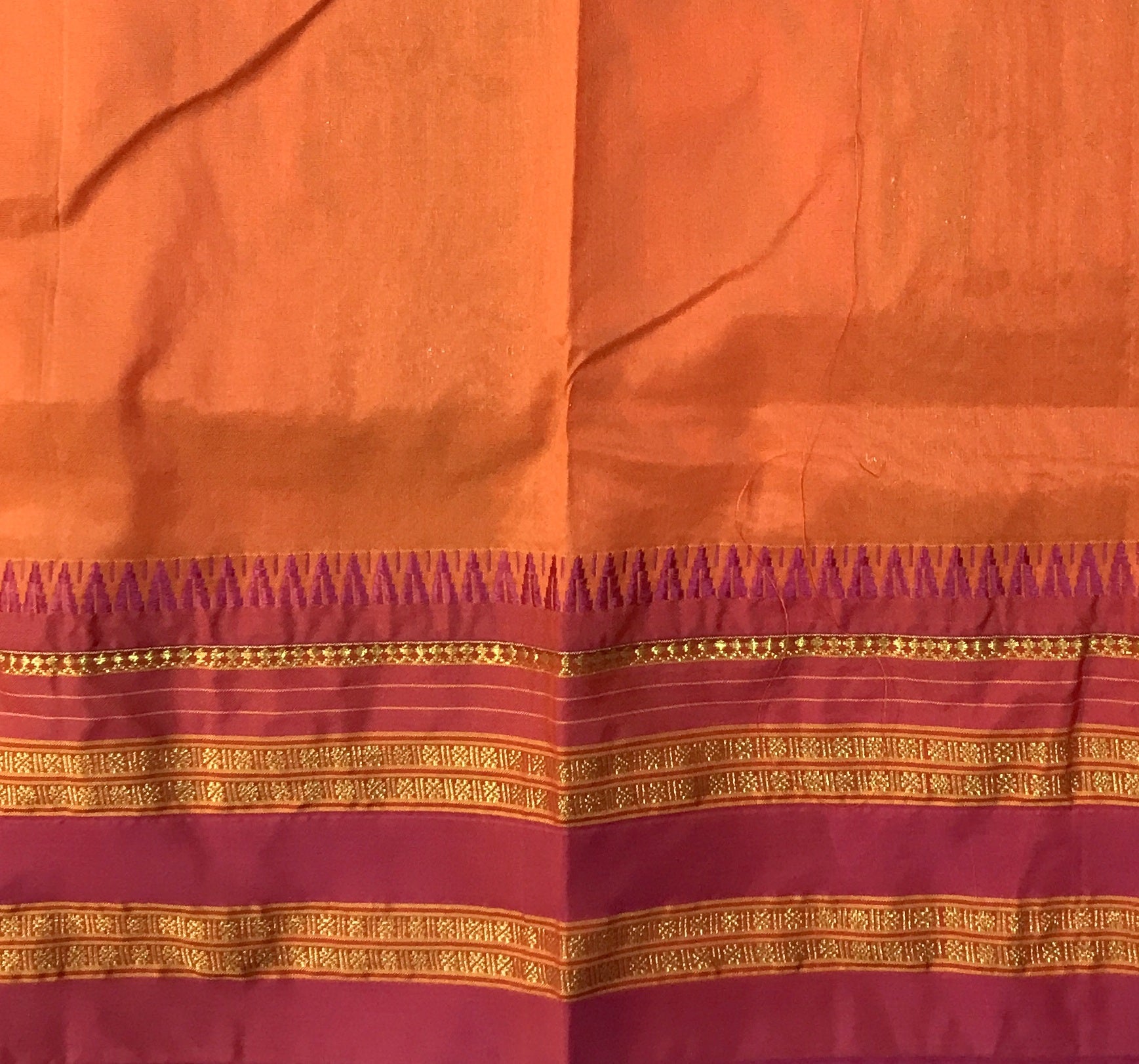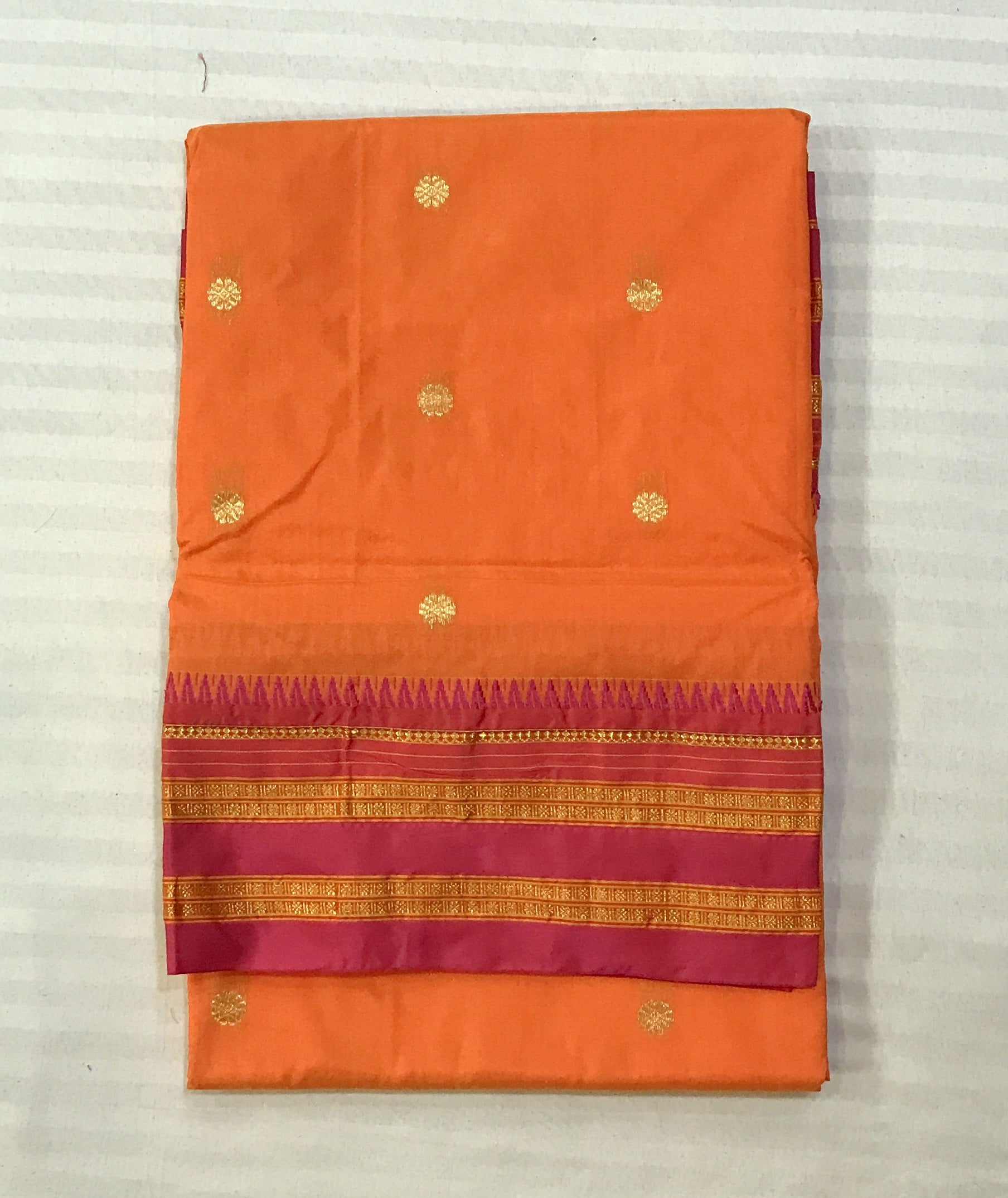 A very pretty shade of orange Narayanpeth saree with a delicate butti woven in golden zari with golden zari border looks very outstanding and contrast pink color golden zari pallu. Light in weight and easy to drape. Perfect saree for summers!