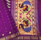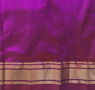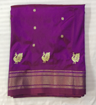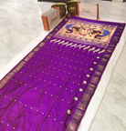 This elegant saree features a deep purple body embellished with delicate woven buttis, offering a rich yet refined look. The contrast gold pallu is beautifully adorned with stylized peacock and floral motifs in vibrant shades of blue, green, pink, and maroon, creating a striking visual narrative rooted in traditional artistry. Accentuated with finely detailed geometric borders and subtle zari work, this saree exudes regal charm making it an ideal choice for festive occasions, weddings, and special celebrations.