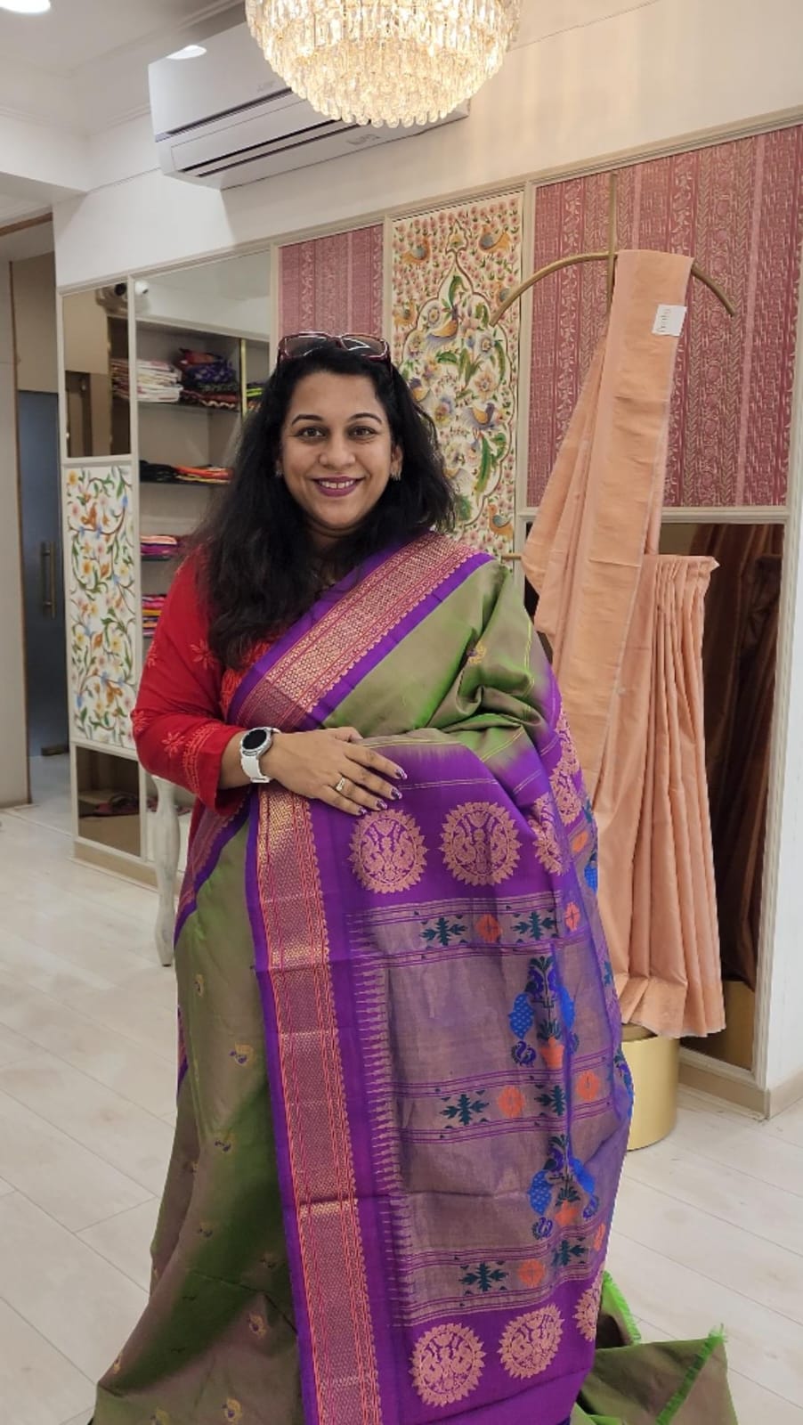 A supreme Paithani weave, in this stunning, beautiful shade of shining green is a treat to your eyes! This, with a beautiful contrast magenta border looks incomparable! Do not miss the peacock butti highlighted in magenta silk thread throughout this Paithani! The traditional tissue pallu with elaborate peacock motifs looks graceful. This is a perfect pick for those who are looking for a unique Paithani to add their collections!