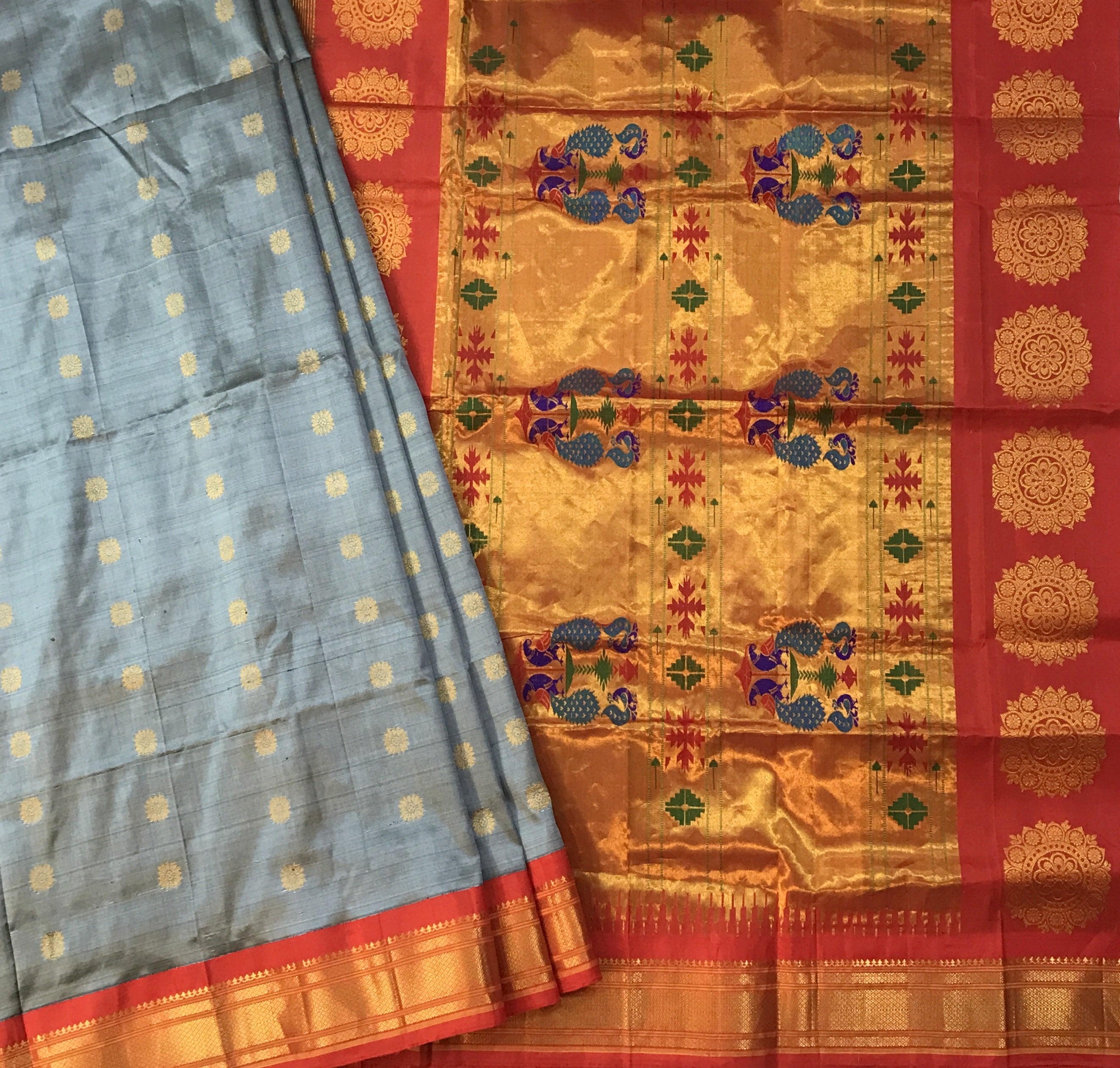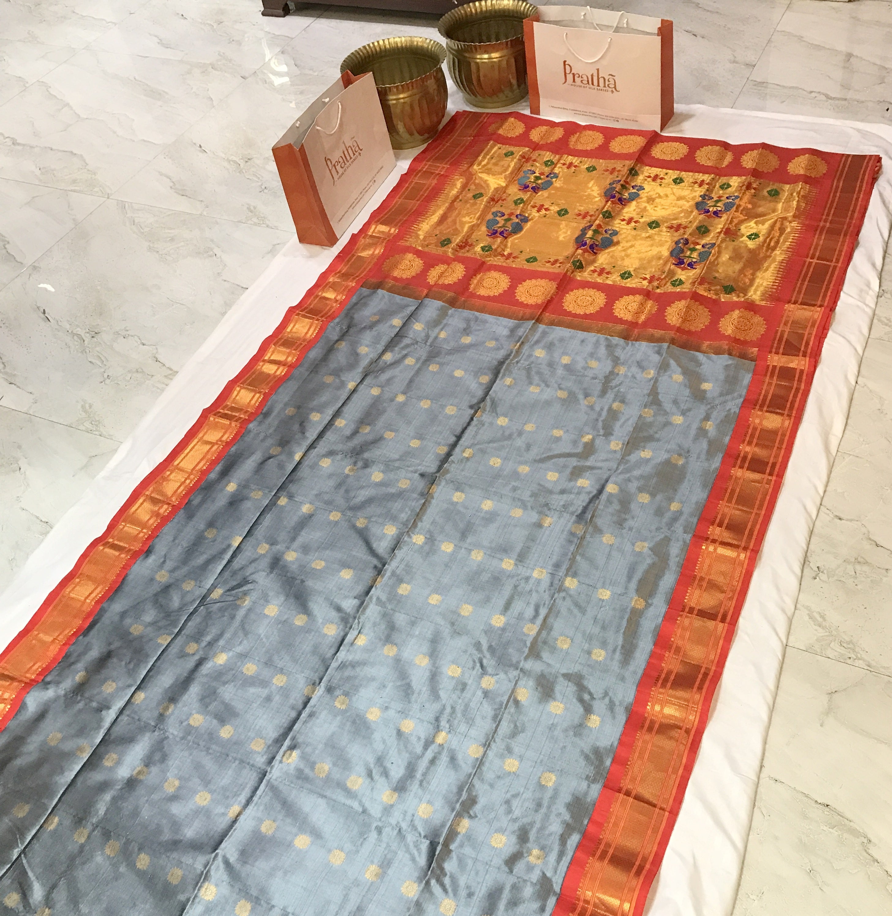 The phenomenal combination of Grey Paithani with a very beautiful light orange border is Pratha's favorite. The delicate floral butti add the needed amount of grace which makes it perfect for any and every special occasion of yours!
