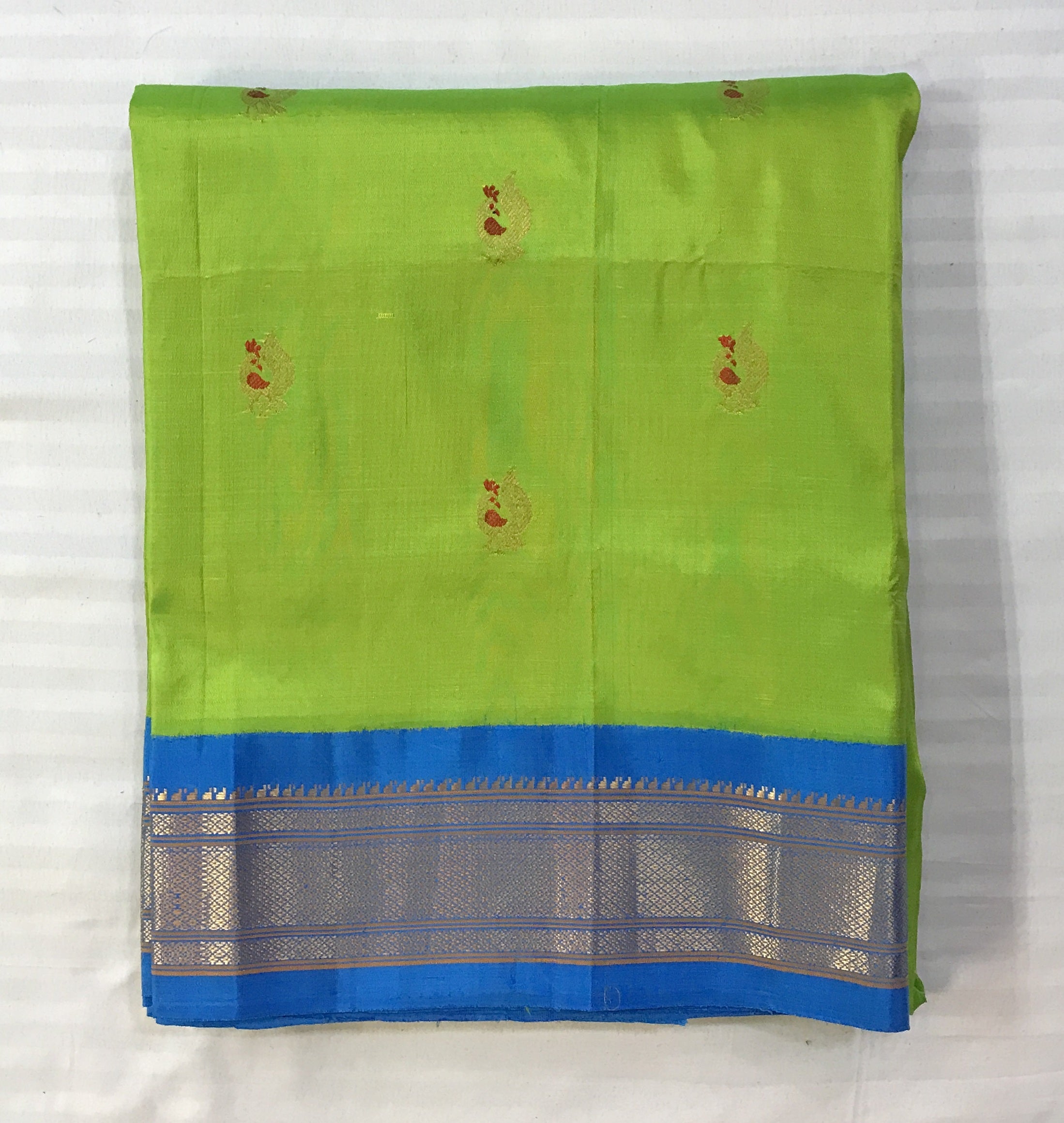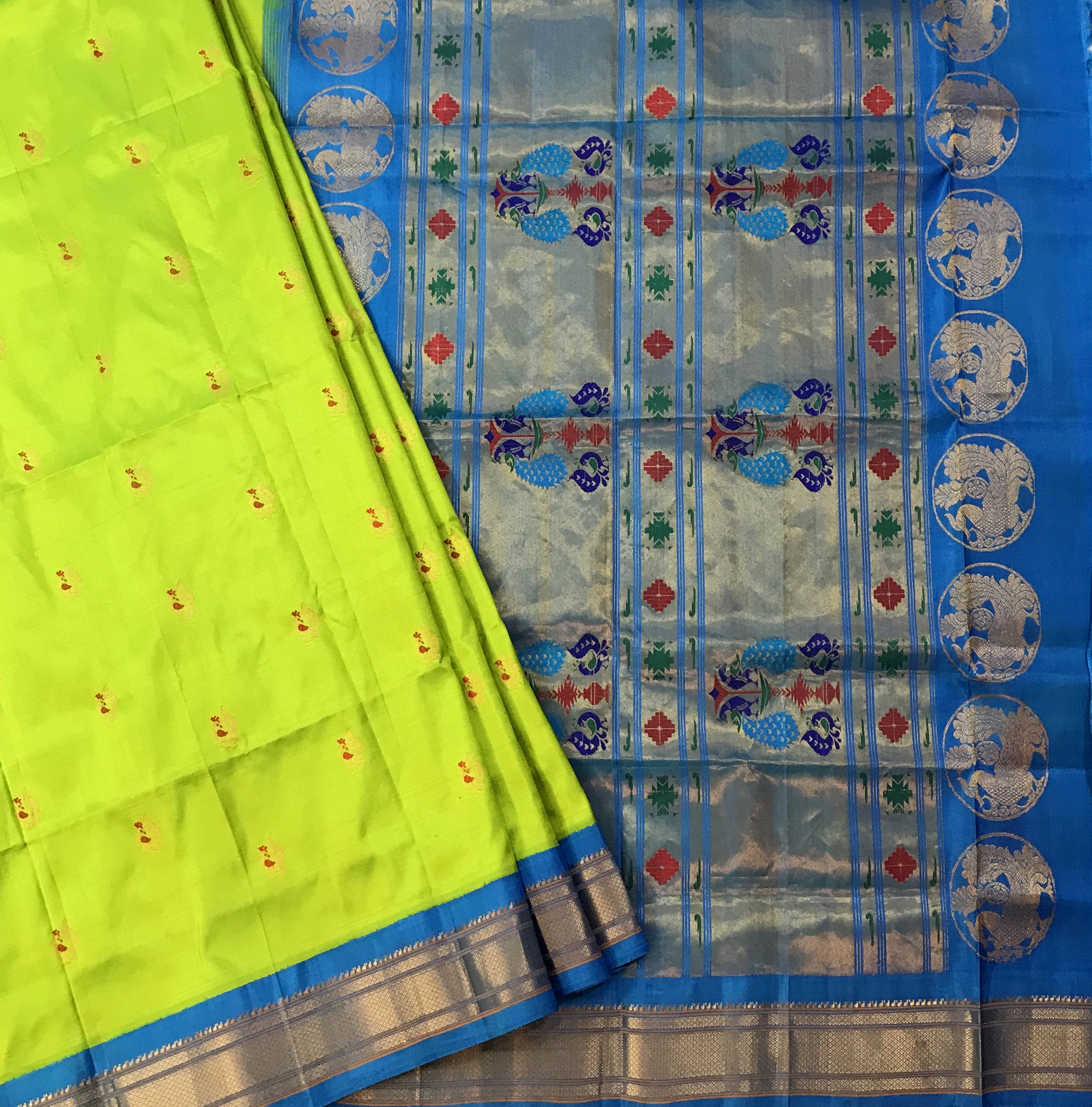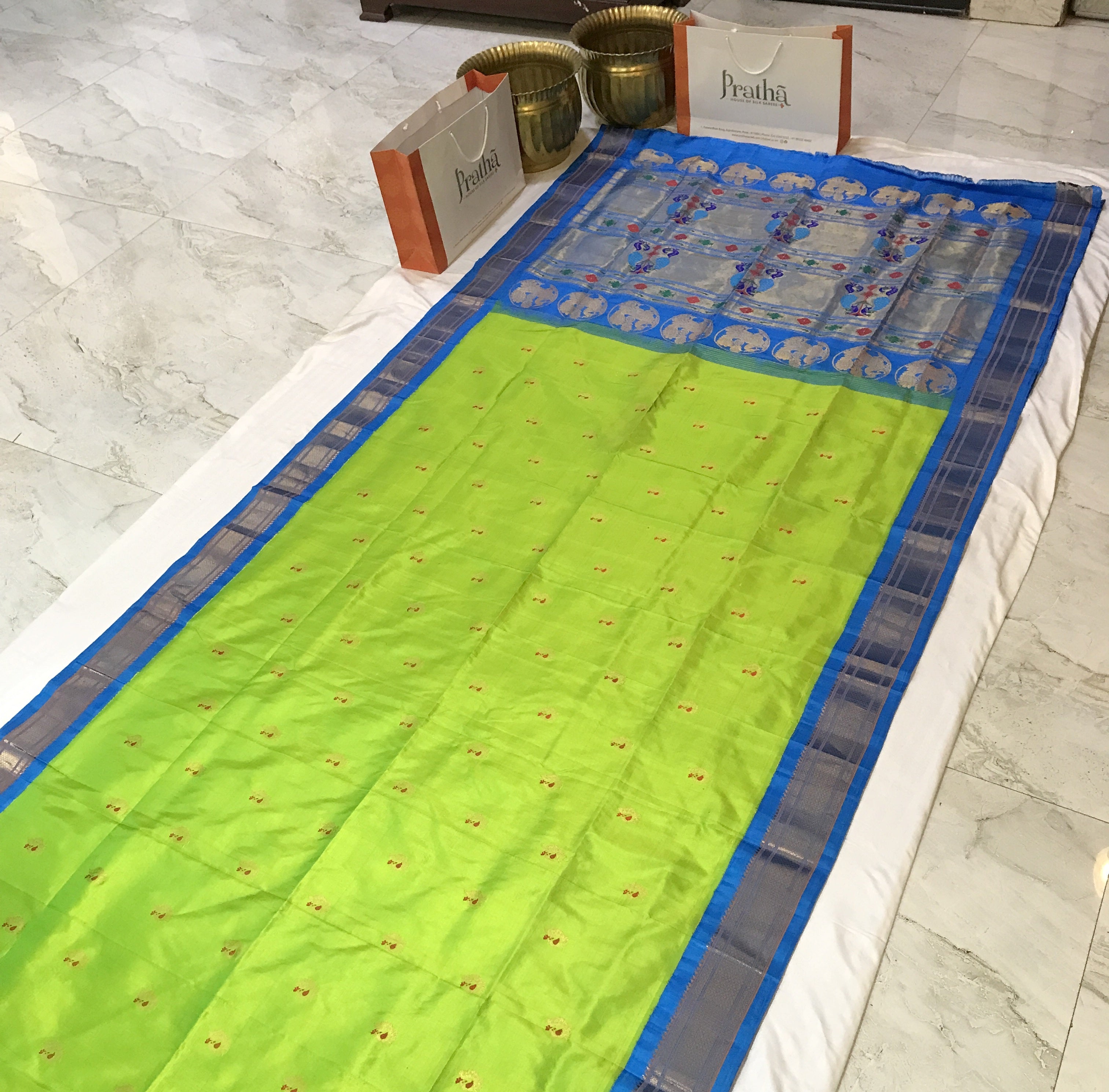 A supreme Paithani weave, in this stunning, beautiful shade of shining parrot green is a treat to your eyes! This, with a beautiful contrast blue border looks incomparable! Do not miss the peacock butti highlighted in red silk thread throughout this Paithani! The traditional tissue pallu with elaborate peacock motifs looks graceful. This is a perfect pick for those who are looking for a unique Paithani to add their collections!