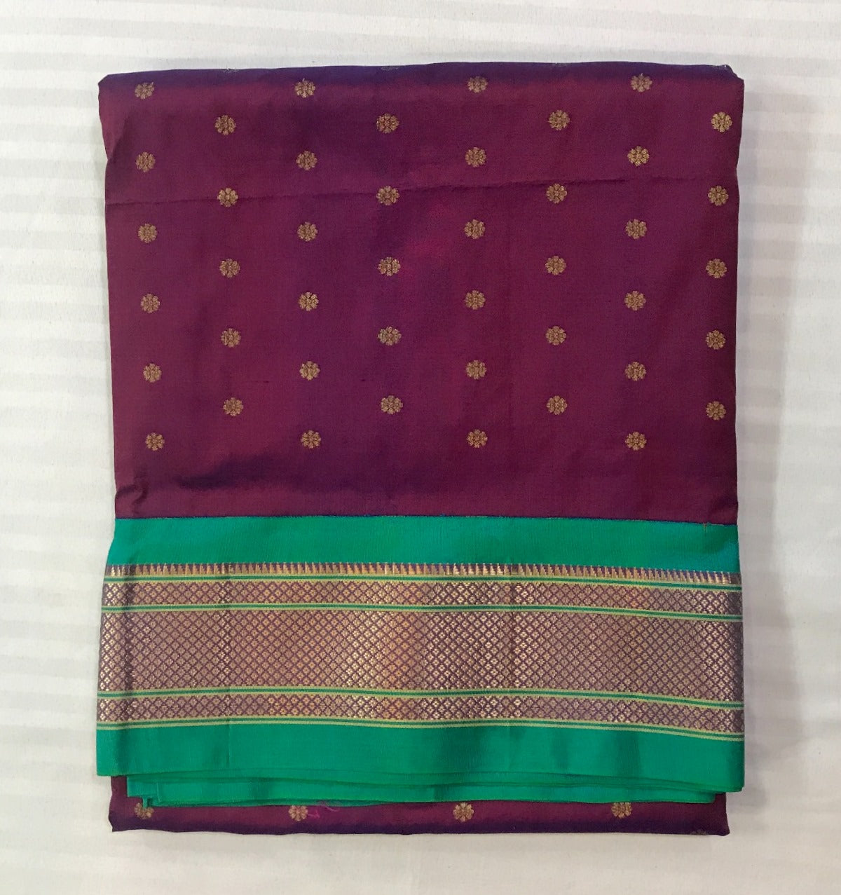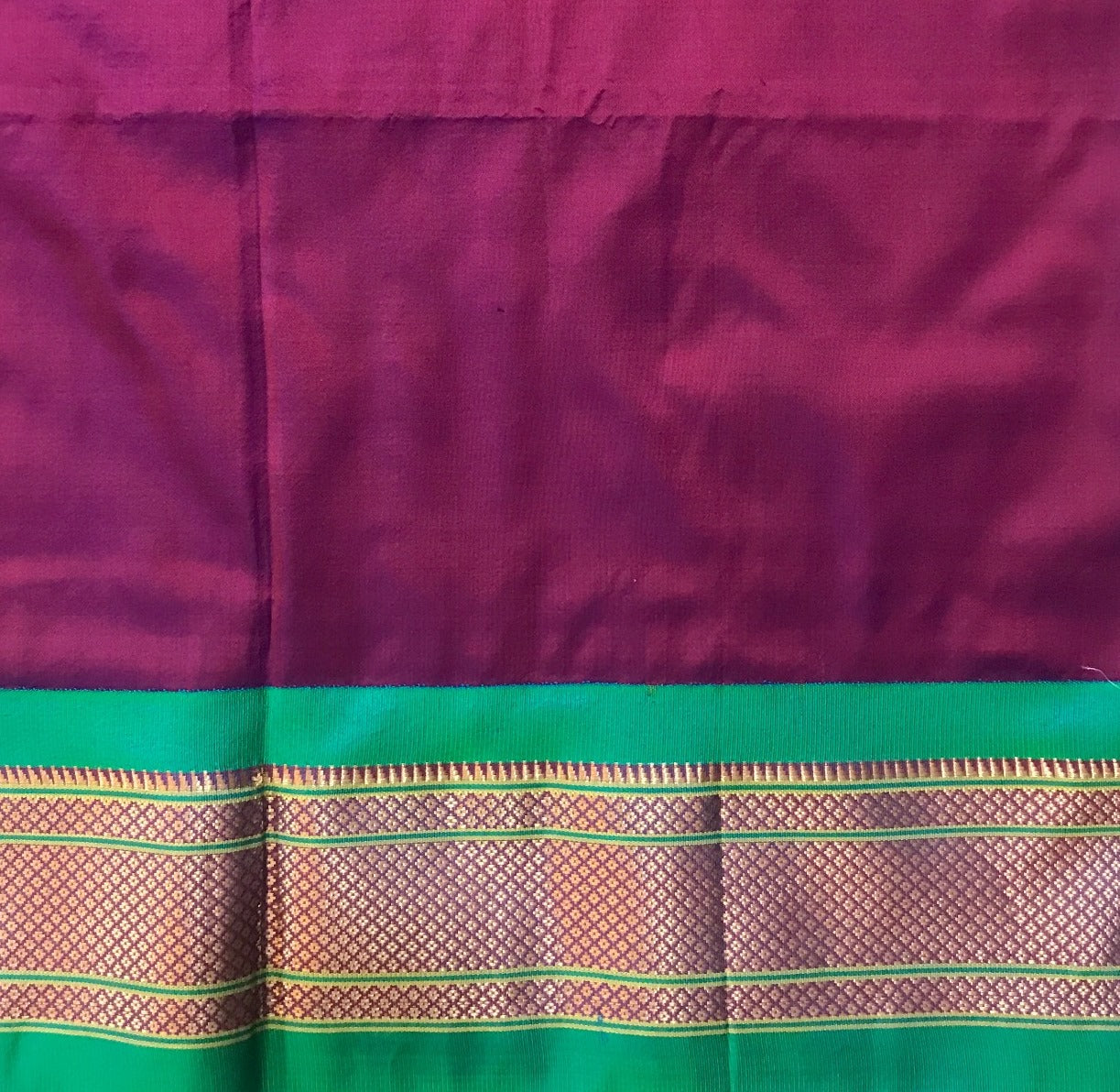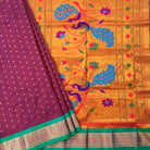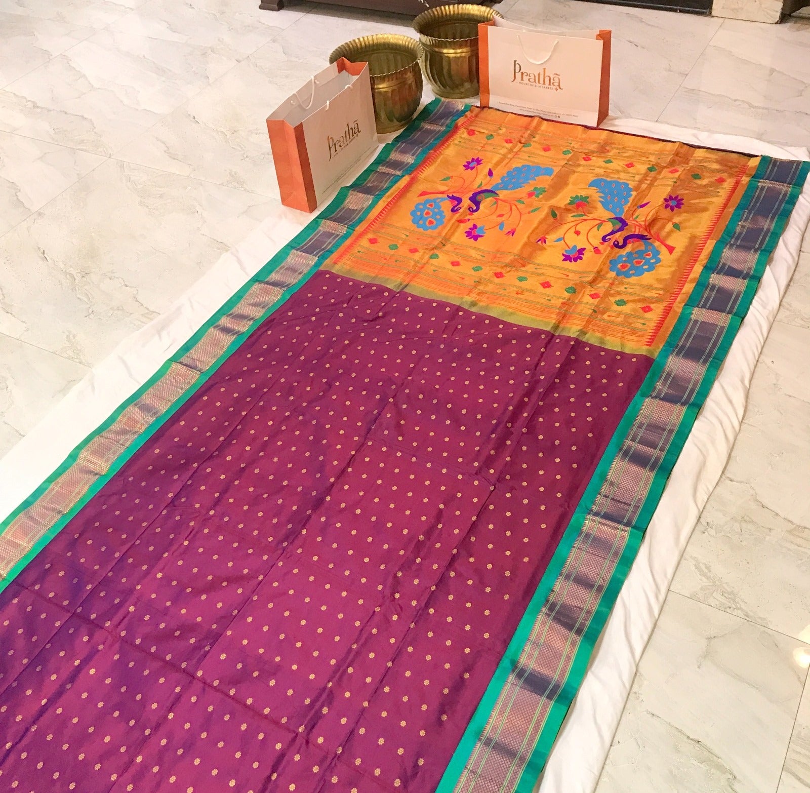 A stunning and timeless Magenta power loom Paithani that exudes grace and elegance! The rich body adorned with delicate golden zari crescent buttis gives this saree a royal charm. The exquisite contrast green golden zari border elevates the look, while the grand and intricately woven golden Paithani pallu with Peacocks stand as the highlight of this masterpiece. This beautiful combination of magenta and green golden makes it perfect for weddings, festivals, and special celebrations. A true collector’s piece that showcases the beauty of traditional weaving!