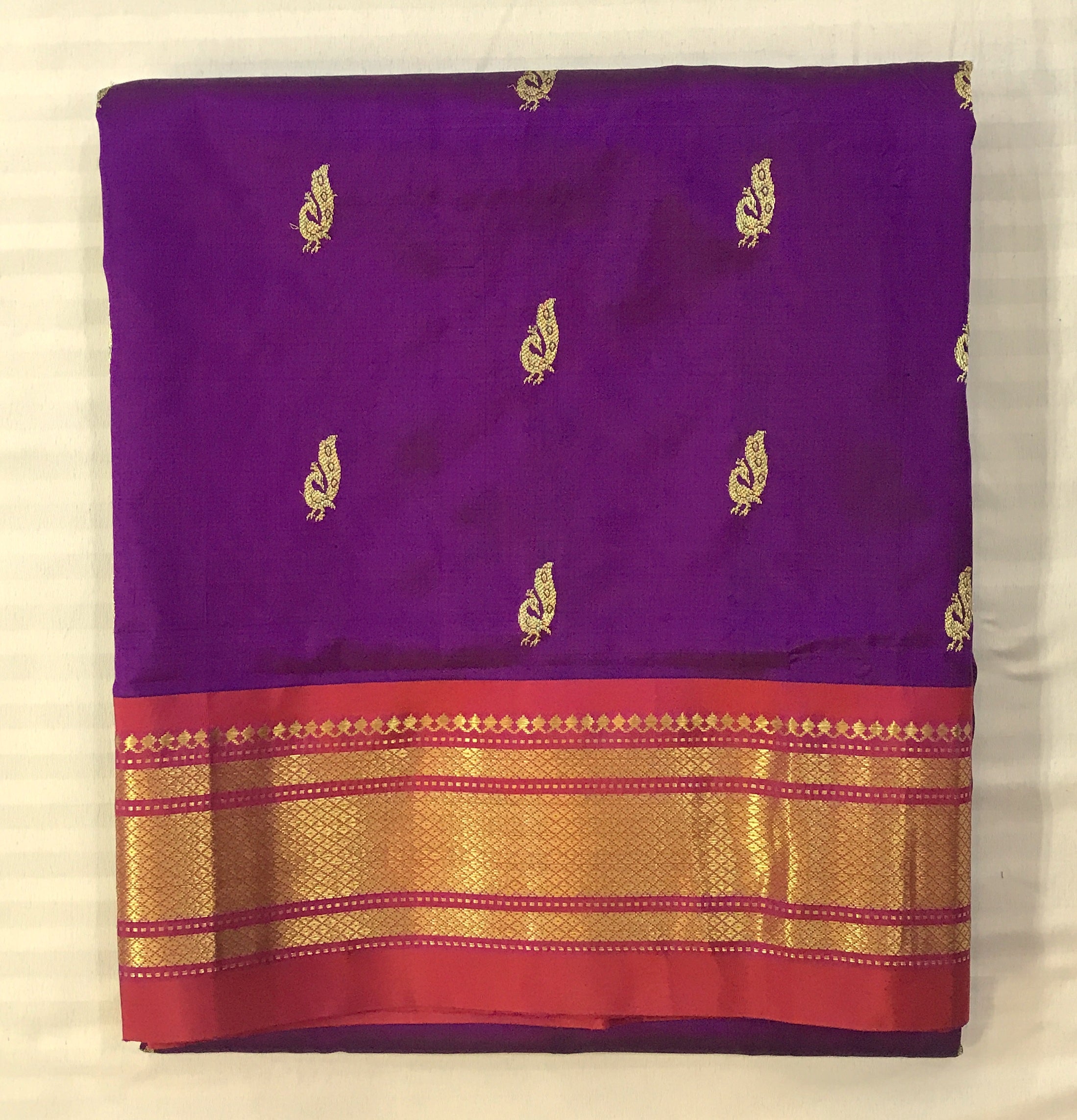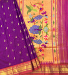 A very outstanding shade of magenta with contrast pink coloured golden zari border in traditional Paithani. Do not miss the peacock butti highlighted in golden zari thread throughout this Paithani. The traditional tissue pallu with elaborate peacock design looks graceful. This is a perfect pick for those who are looking for a unique Paithani to add to their collection.