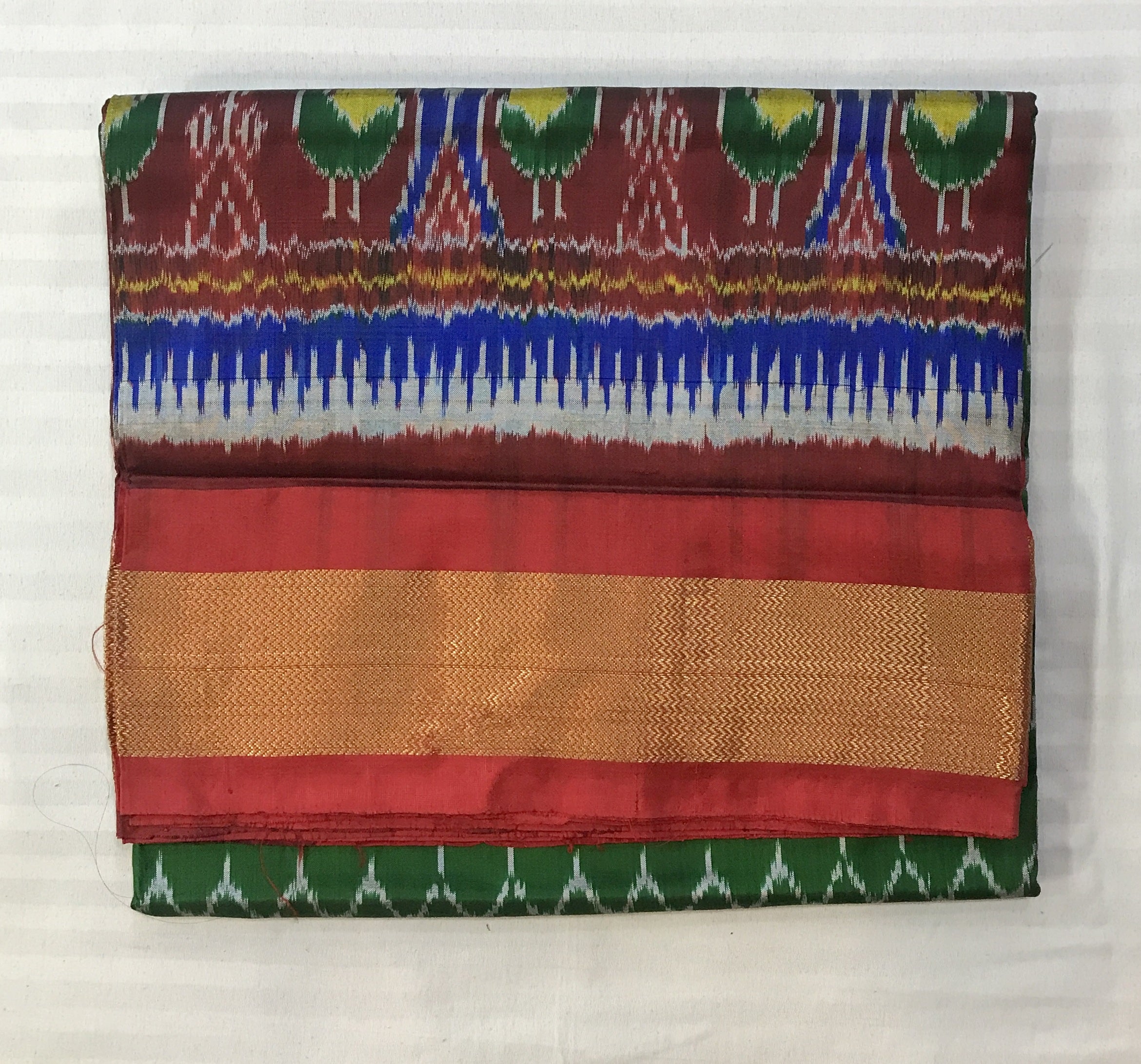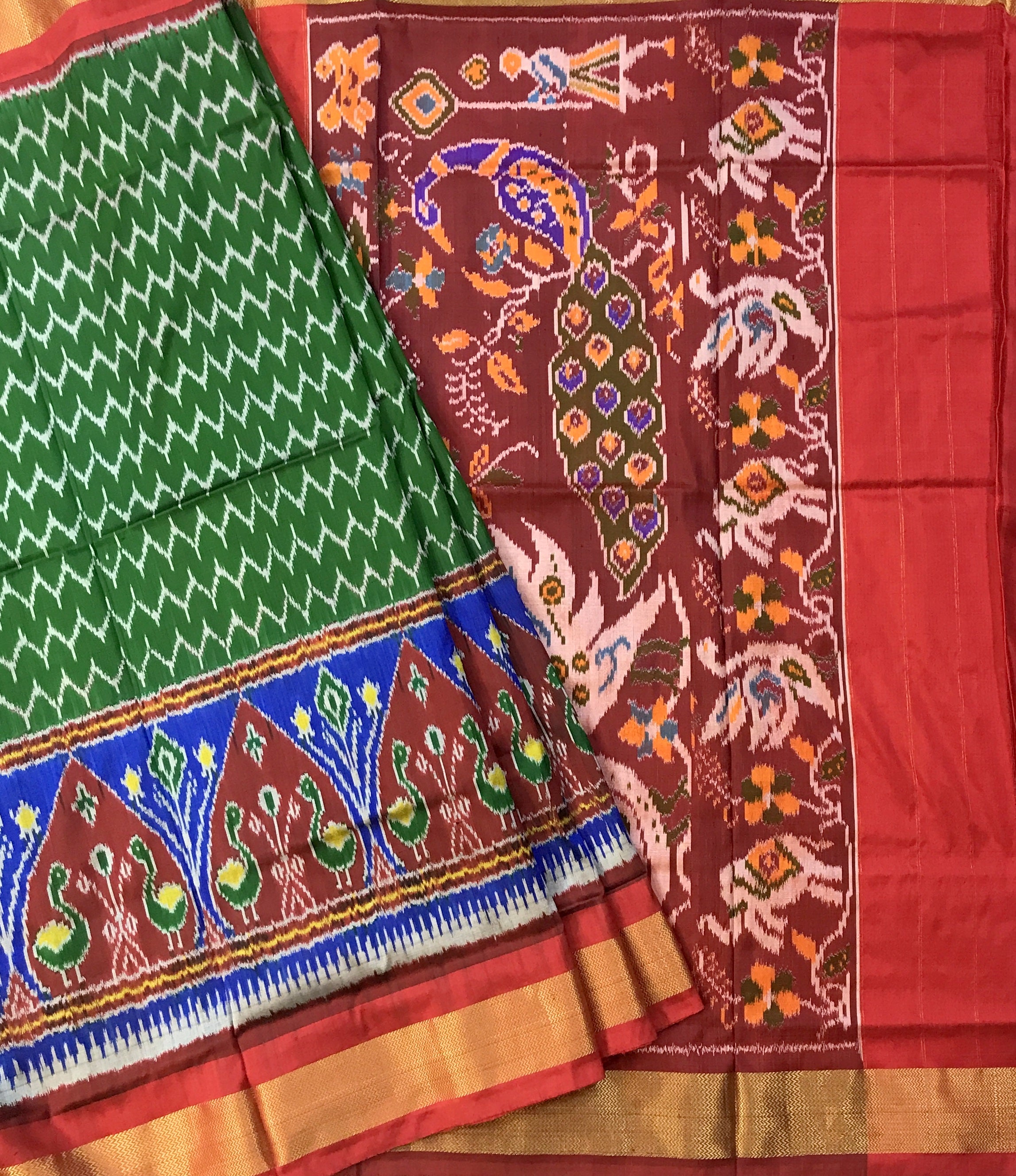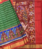 This refined green handwoven ikkat saree features ikkat patterns highlighted by a vibrant contrast red with golden zari border, capturing the classic allure distinctive to traditional ikkats. A must-have for saree enthusiasts who appreciate truly unique and captivating designs.