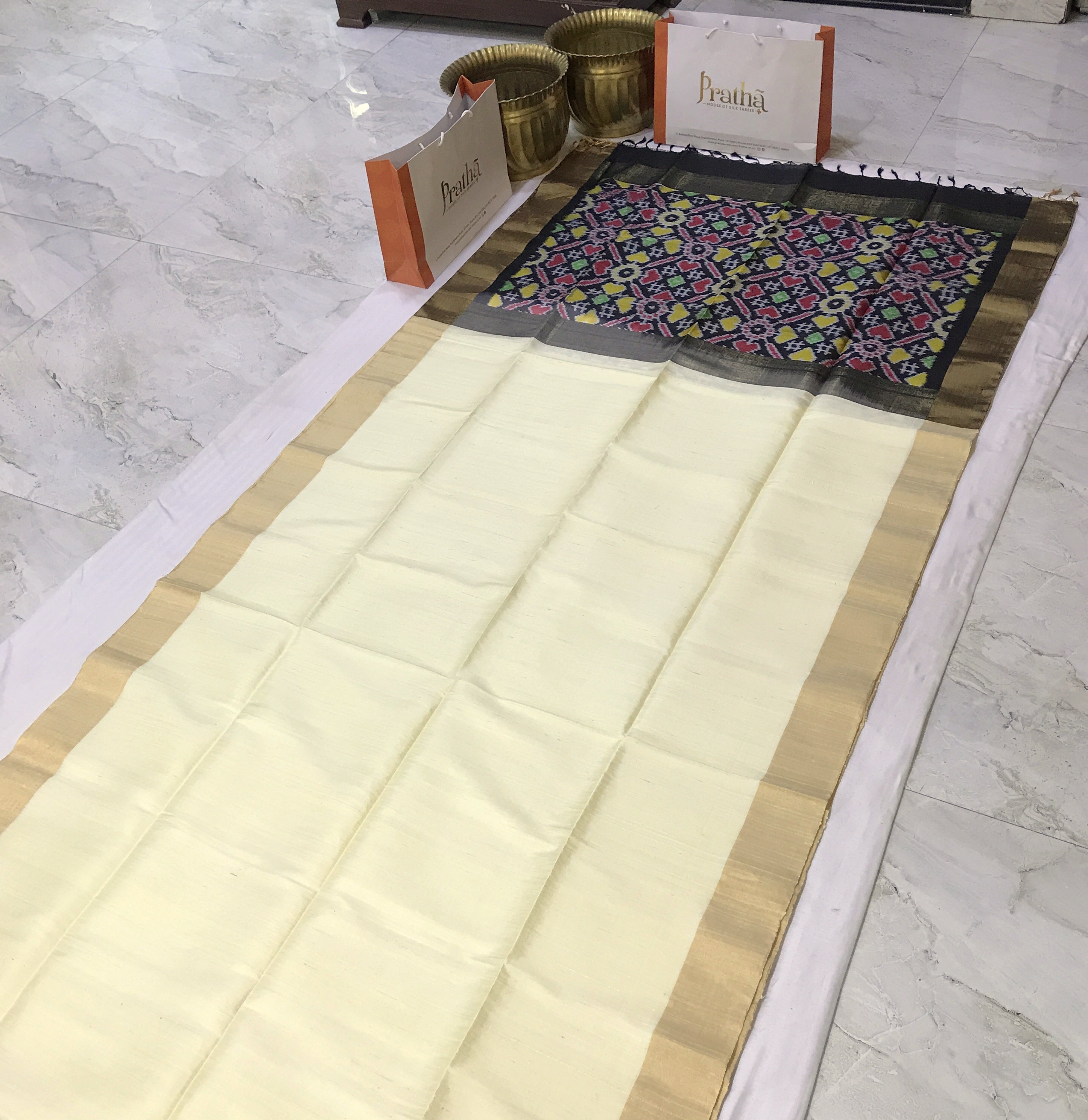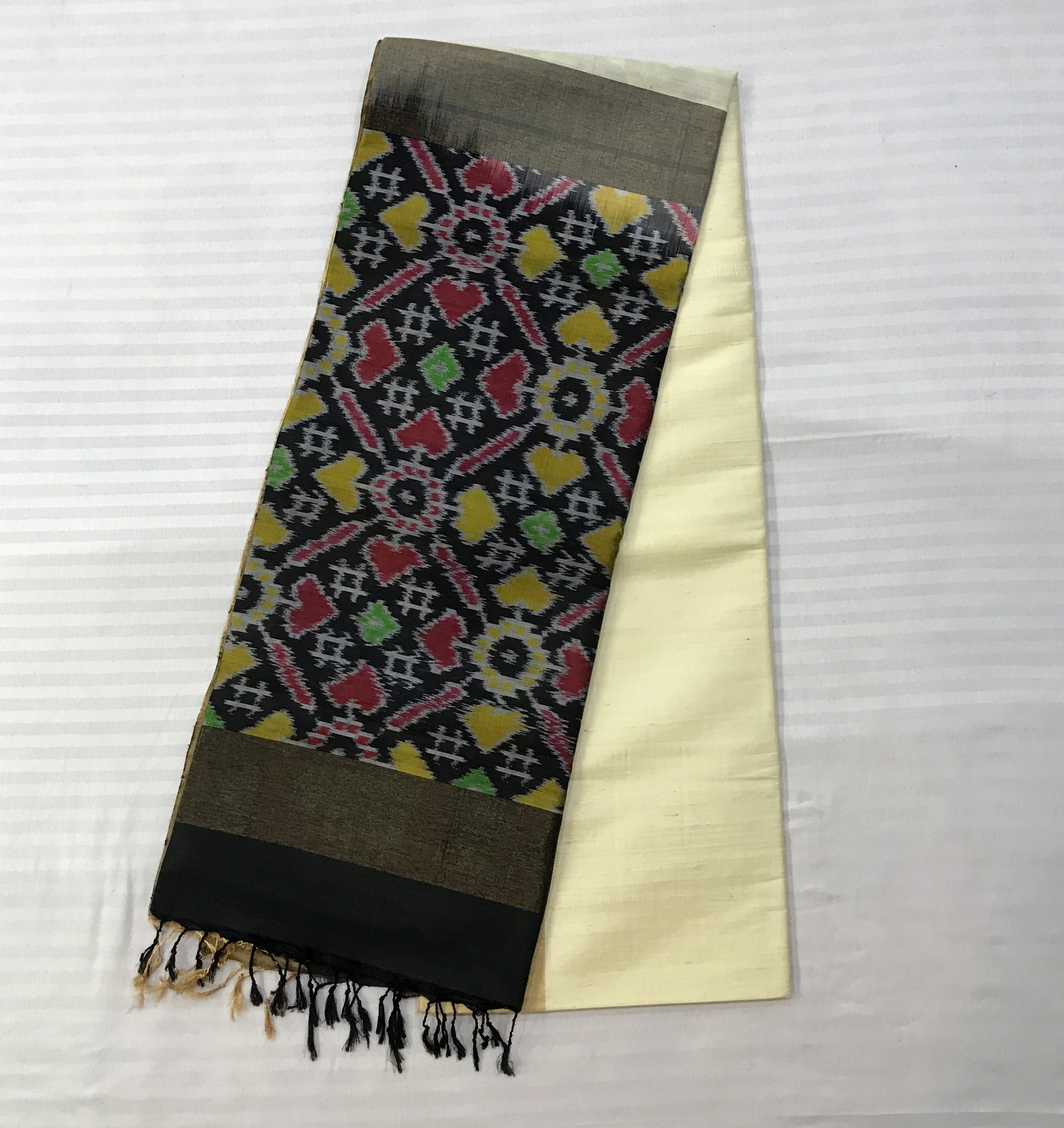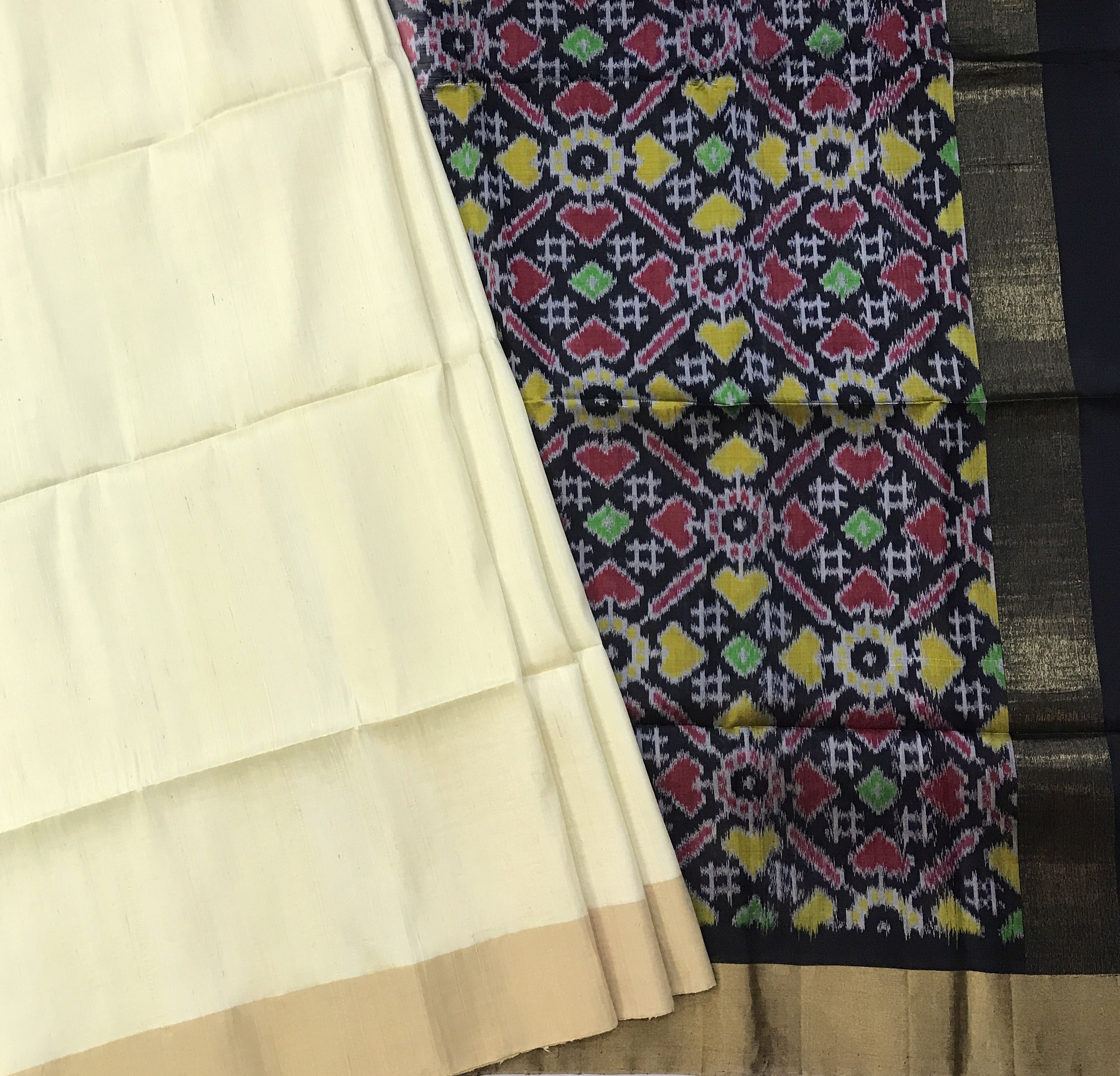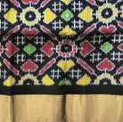 This raw silk saree features a serene ivory body with a soft natural sheen, paired with a striking ikat-inspired patterned pallu in deep black adorned with vibrant accents of red, yellow, green, and white; finished with a subtle gold-toned border, the saree beautifully balances understated elegance with traditional craftsmanship, making it perfect for festive occasions and cultural gatherings.