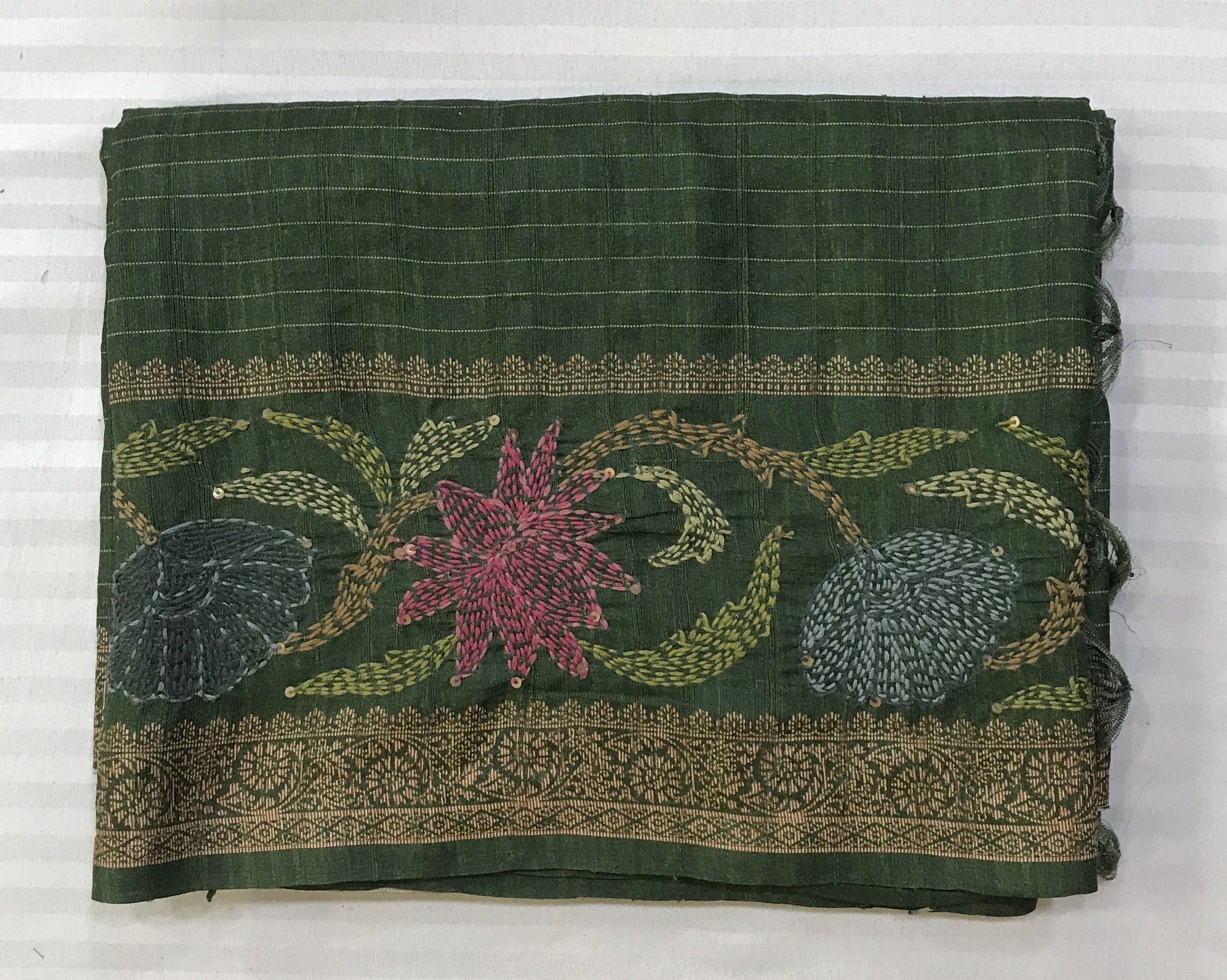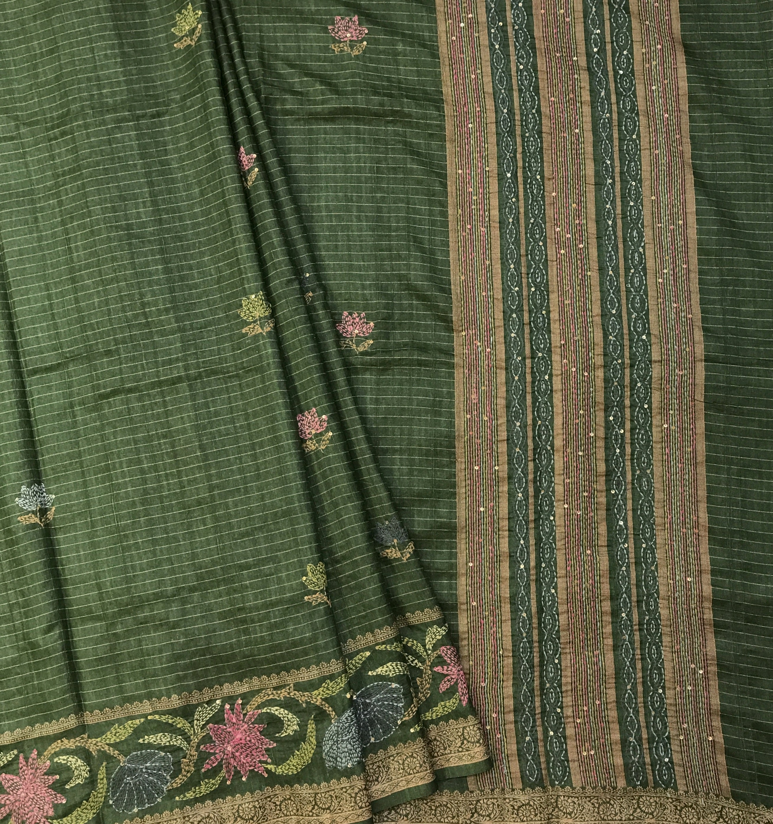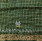 This elegant semi tussar saree comes in a deep forest-green base, highlighted with fine horizontal pinstripes that add subtle texture and depth. The body is adorned with delicately woven floral buttas in soft pastel shades, giving it a graceful and timeless appeal. The pallu features rich vertical stripes with intricate woven motifs, adding traditional charm. Finished with an ornate floral border in muted gold and complementary tones, this saree beautifully balances simplicity and detail.