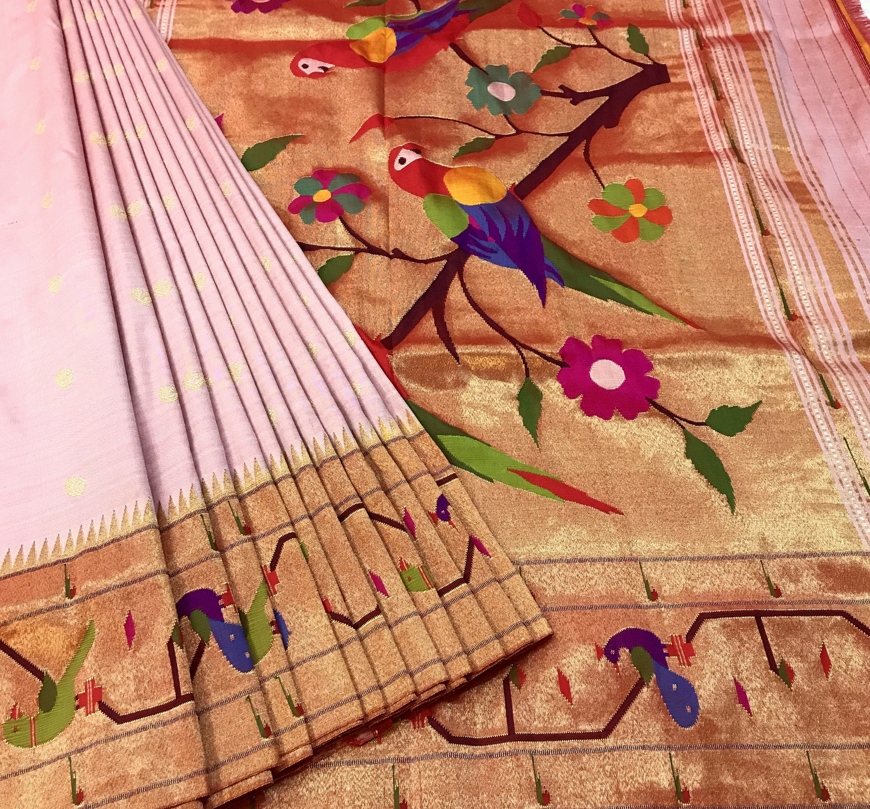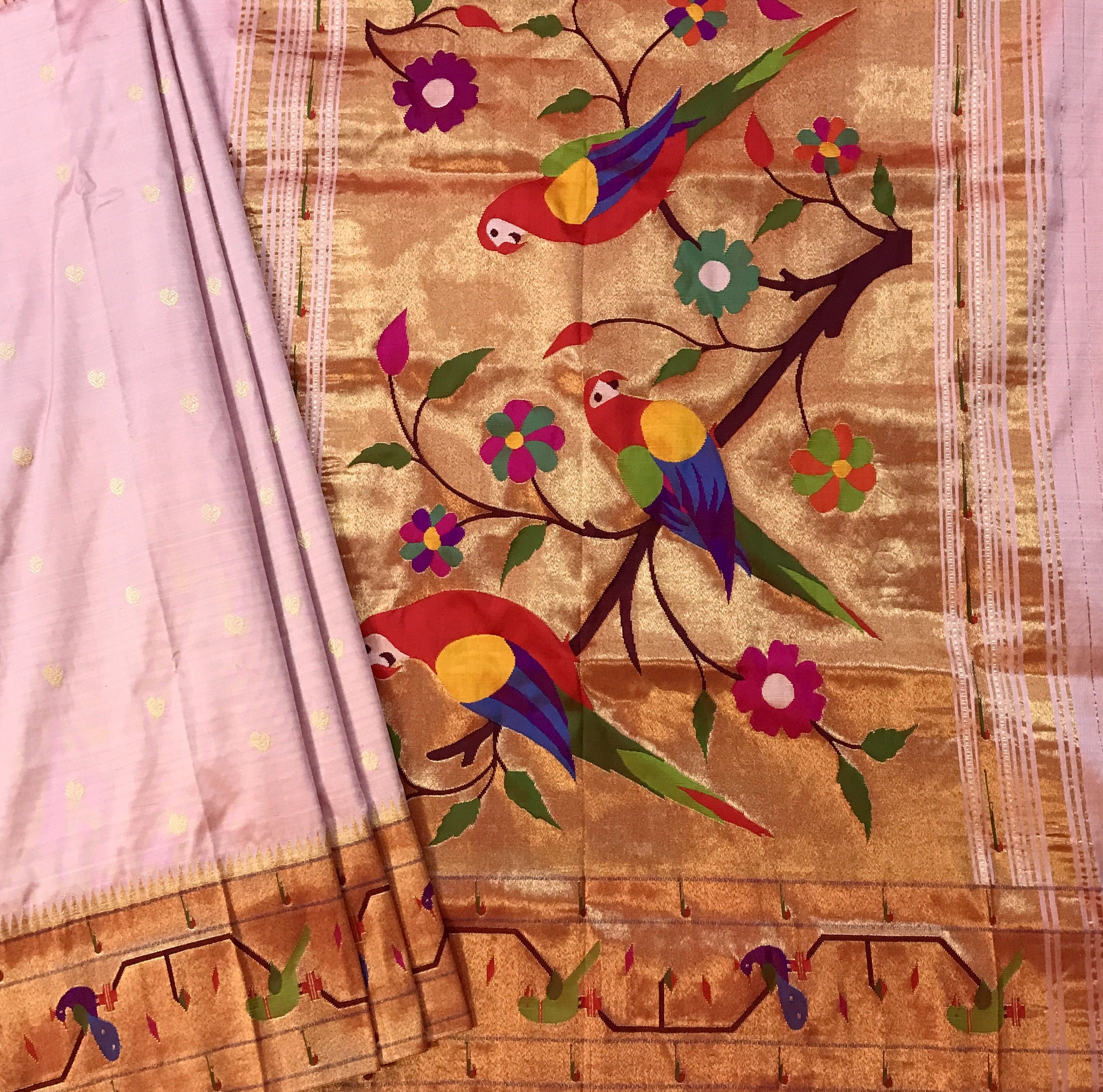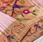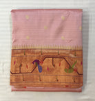 This is an incredible pink Signature Paithani with golden zari border. This saree is truly a masterpiece by the weavers! This saree has zari work, the unique delicate peacock shaped golden zari butti gives a designer touch to this incredible weave. This pure handloom Signature Paithani has ' Peacock and Parrot' motifs zari pallu. The specialty of this saree is that it has a special design border on the bottom which gives this saree a unique grace!