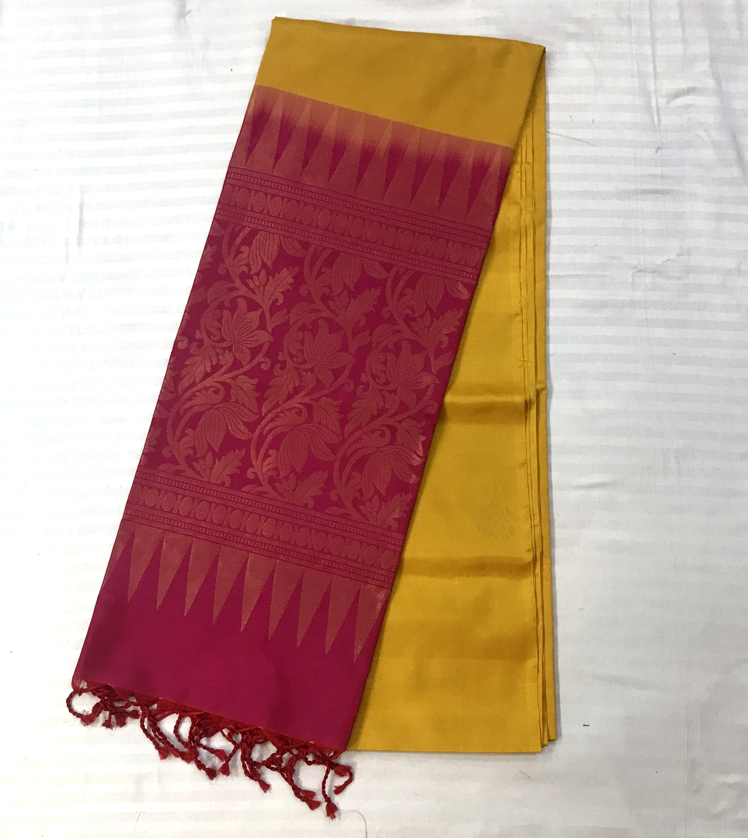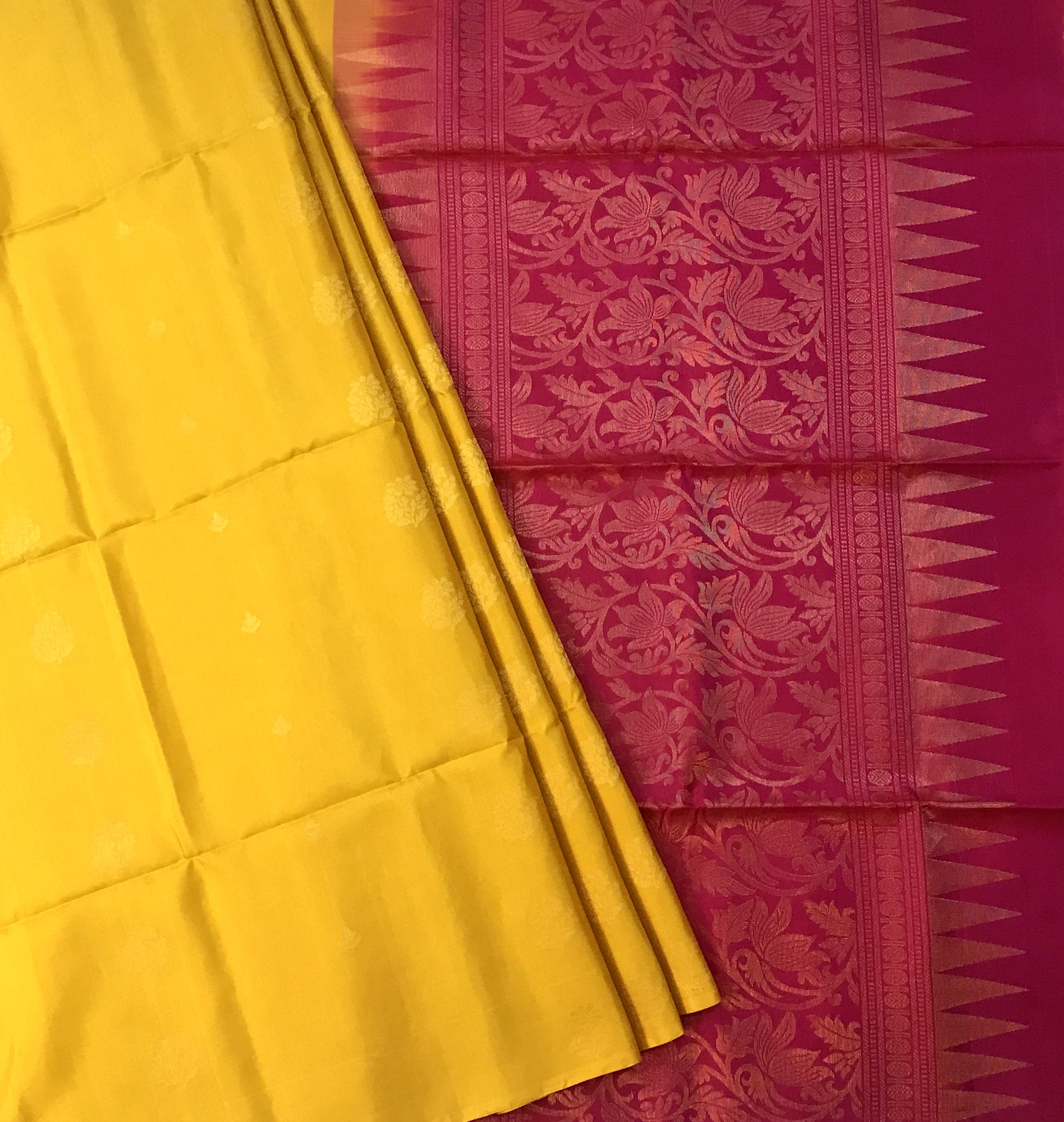 This elegant saree features a striking dual-tone combination of yellow and refreshing pink, creating a beautiful contrast that feels both classic and contemporary. The yellow body is adorned with delicate small and big alternate floral buttis, subtly woven to add understated charm without overwhelming the richness of the fabric.
