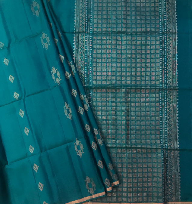 This Turqouise blue colour saree has a small floral shaped golden butti along with a beautiful intricate design golden zari border. This Soft Silk saree flaunts beautiful brocaded square design pallu in self color this weave a classy feel. Comfortable to wear and easy to drape this saree is look special. This black color makes this saree a prefect casual or party wear.