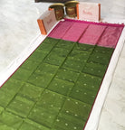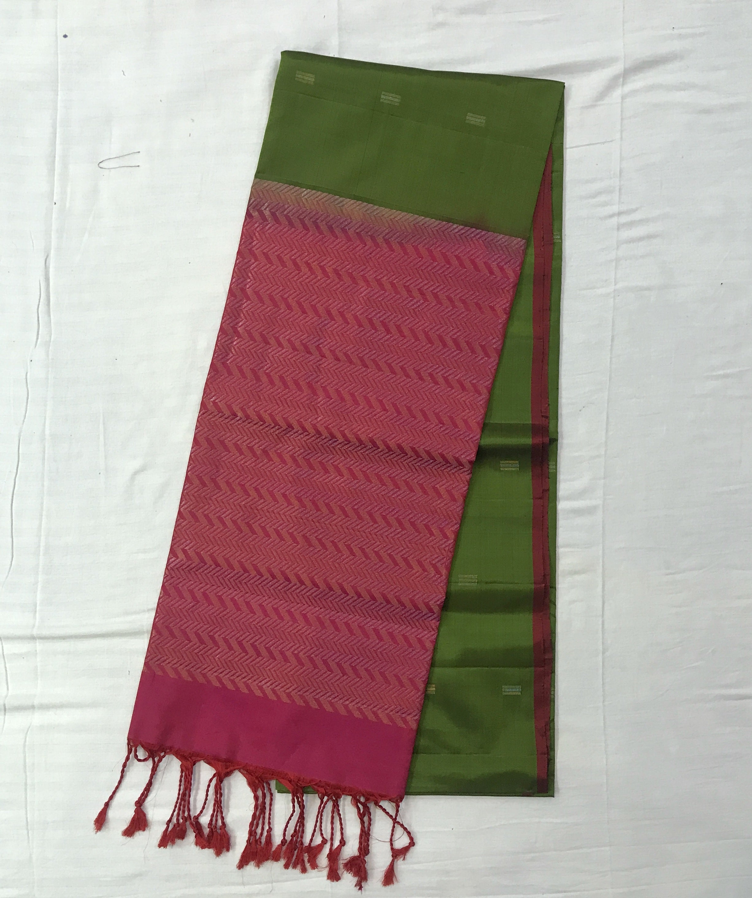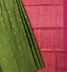 An enteral favorite of so many! A must have in any saree connoisseur's wardrobe! This Light-weight soft silk is an easy to drape saree. Being handwoven, it gives a very comfortable feel, when worn. The mehendi-green colour spread throughout the saree, with the intricate unique shaped butti complement each other perfectly. This delicate butti and contrast pink coloured pallu created fully in  golden zari thread, looks great!