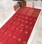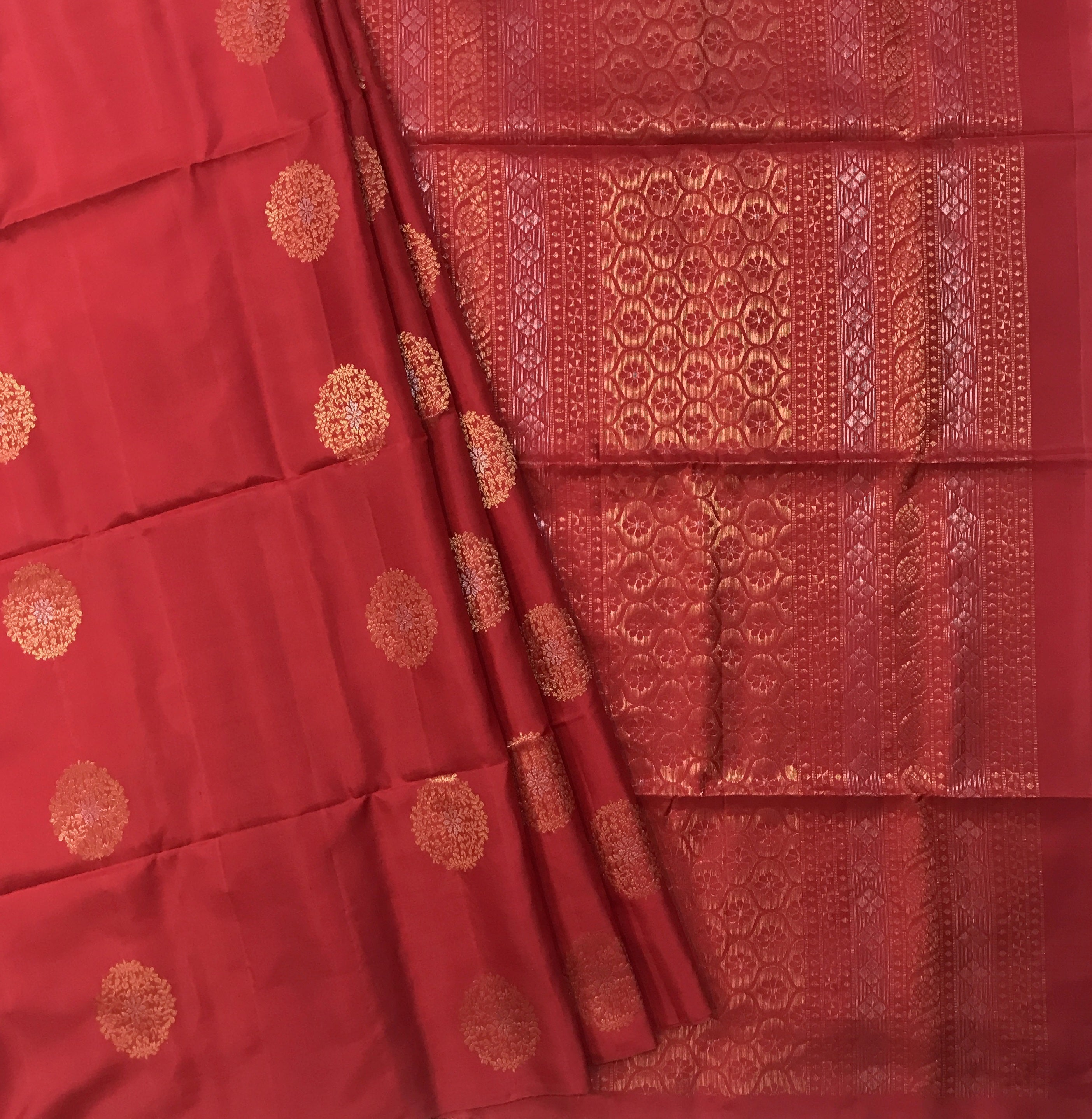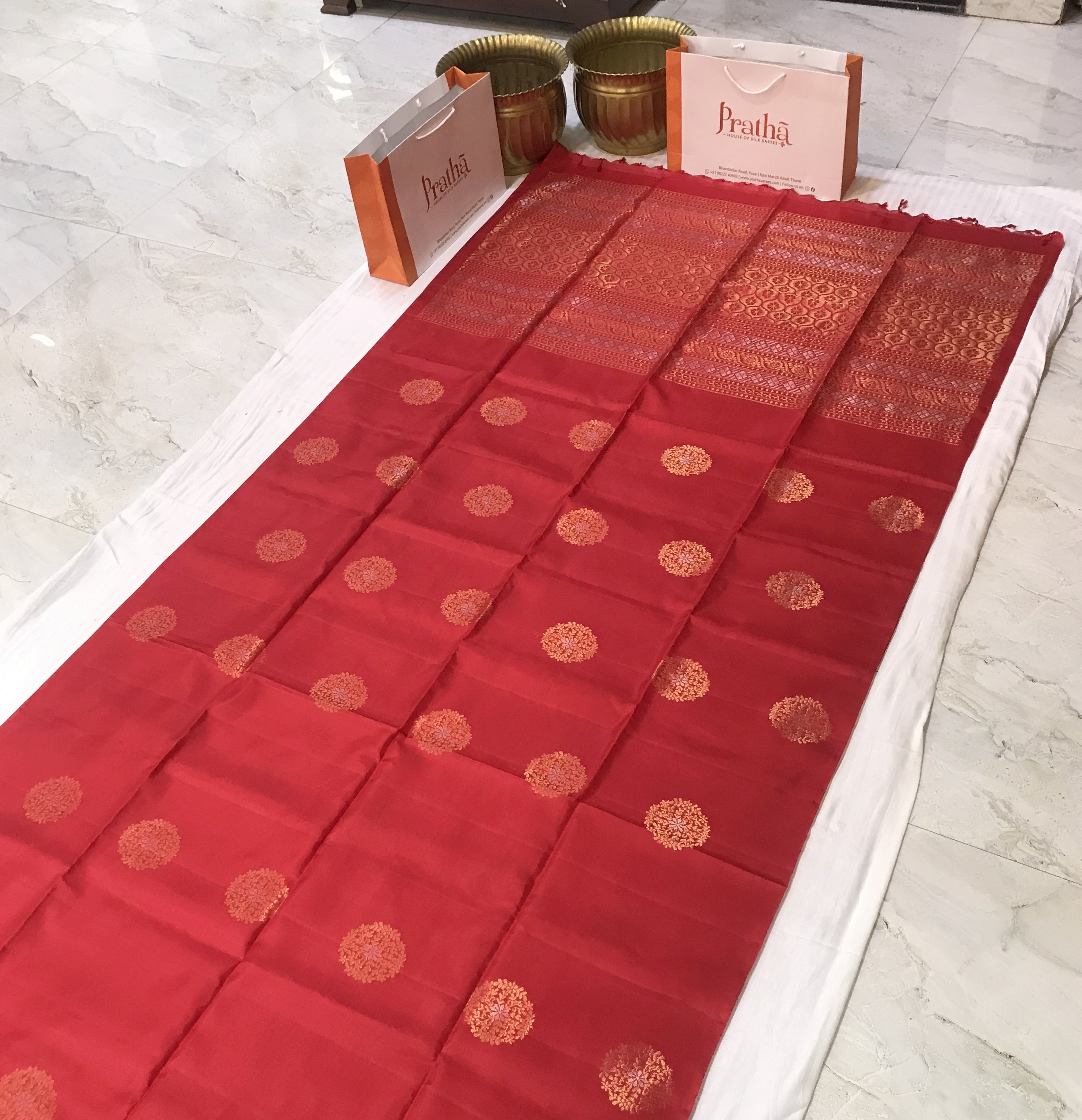 Elegant red soft silk saree featuring large circular buttis crafted with golden and silver zari thread work. The design showcases intricate traditional motifs without a border, allowing the luxurious fabric and detailed embellishment to take center stage. Perfect for special occasions, this saree combines timeless craftsmanship with refined sophistication.