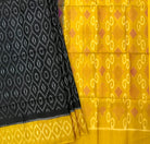 Stylish Soft Silk saree in a lovely black and yellow. The saree features shimmering ikkat all over the body. A striking contrast border with intricate design adds to its charm, making it ideal for celebrations and gatherings