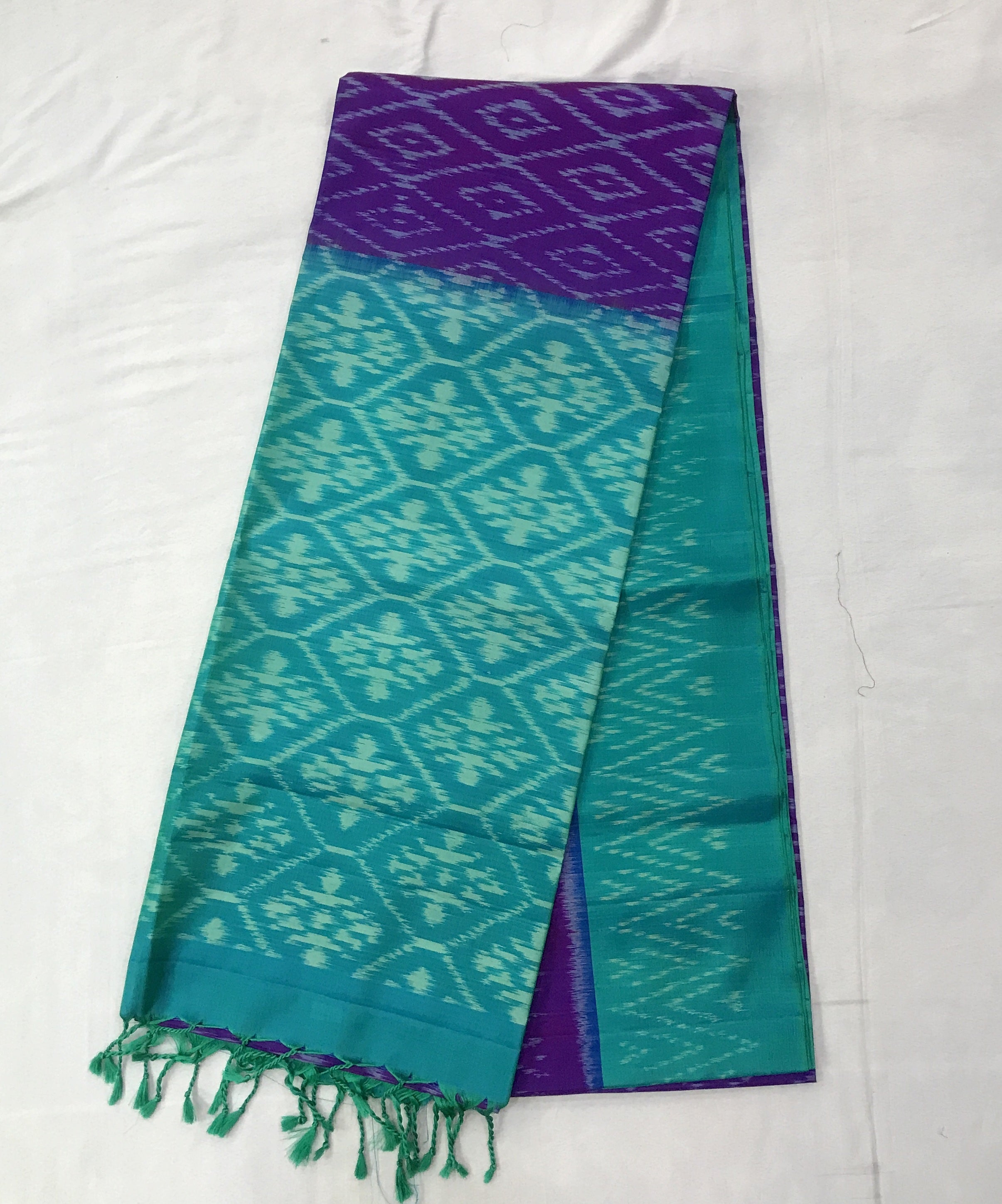 Make a graceful statement with this stunning soft silk saree in a beautiful purple and rama green combination. The saree is adorned with shimmering ikkat patterns all over the body, giving it a rich and sophisticated appeal. The intricate weaving enhances its traditional charm while maintaining a stylish, contemporary look. The striking contrast border adds depth and elegance, making it perfect for festive occasions, celebrations, and special gatherings. The vibrant green pallu complements the body beautifully, creating a captivating visual contrast.
