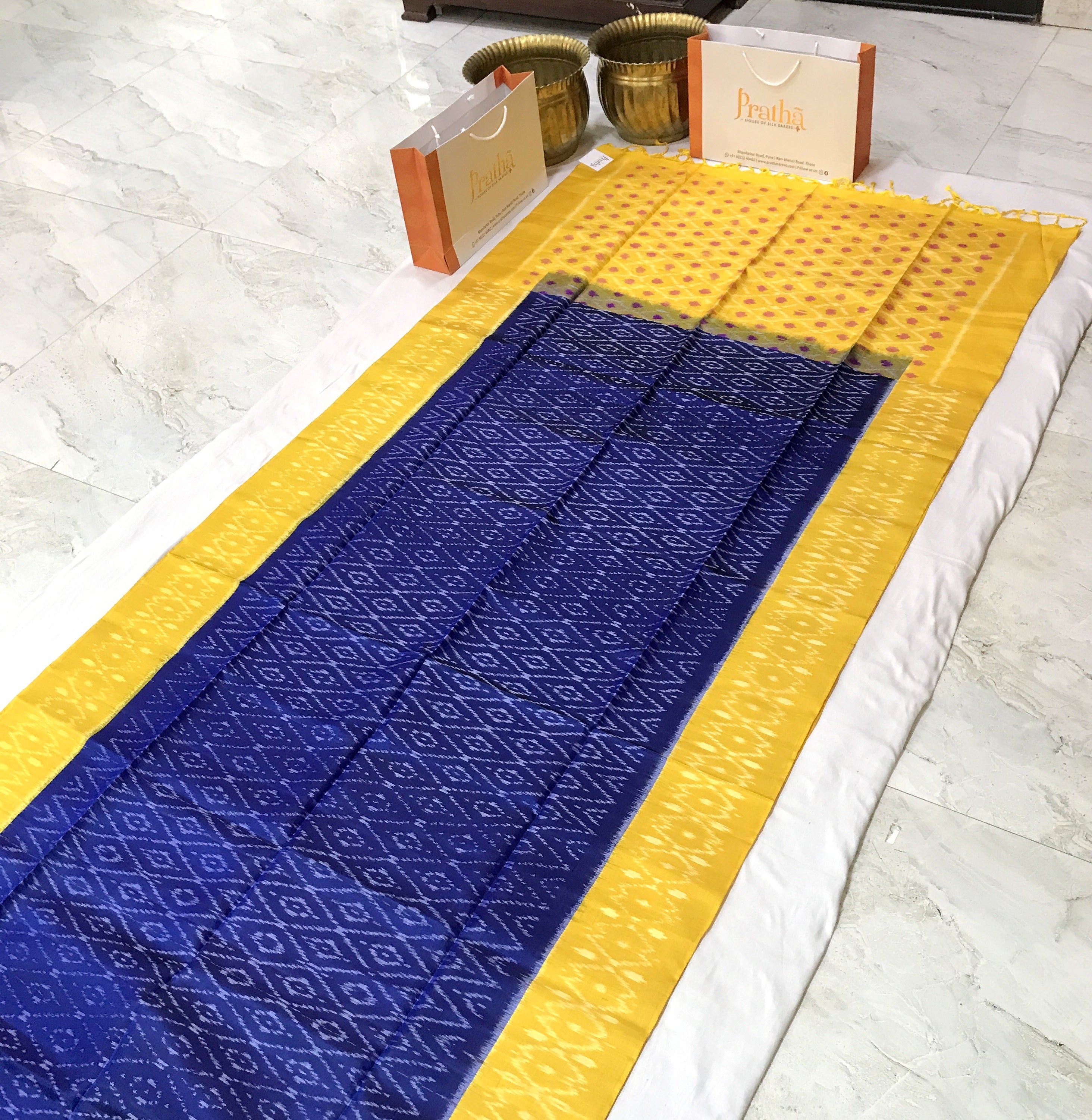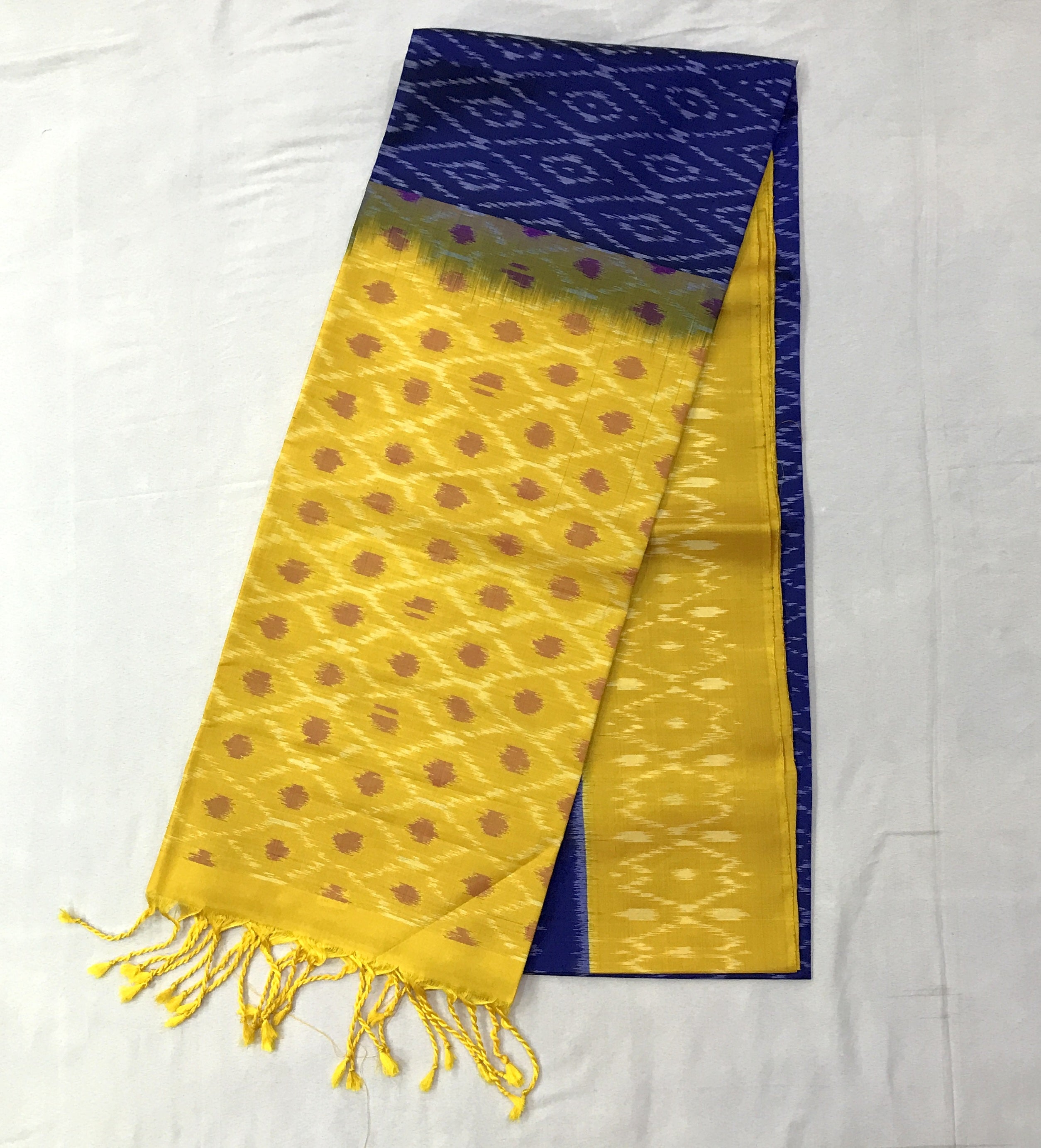 Make a graceful statement with this stunning soft silk saree in a beautiful blue and yellow combination. The saree is adorned with shimmering ikkat patterns all over the body, giving it a rich and sophisticated appeal. The intricate weaving enhances its traditional charm while maintaining a stylish, contemporary look.The striking contrast border with detailed design adds depth and elegance, making it perfect for festive occasions, celebrations, and special gatherings. The vibrant yellow pallu with pink butti complements the body beautifully, creating a captivating visual contrast.