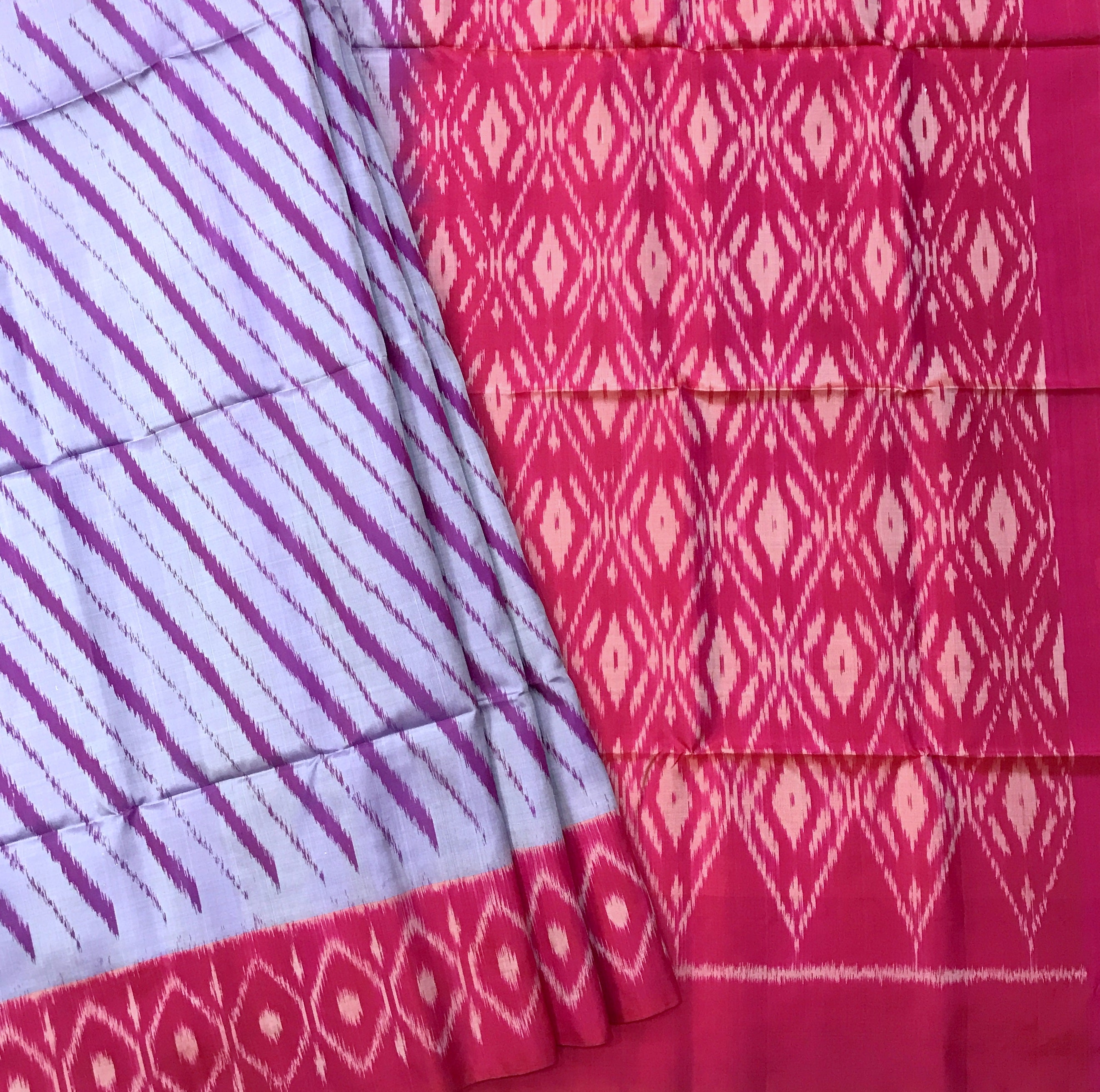 Make a graceful statement with this stunning soft silk saree in a beautiful lavender and pink combination. The saree is adorned with shimmering ikkat patterns all over the body, giving it a rich and sophisticated appeal. The intricate weaving enhances its traditional charm while maintaining a stylish, contemporary look. The striking contrast border with detailed design work adds depth and elegance, making it perfect for festive occasions, celebrations, and special gatherings. The vibrant pink pallu complements the body beautifully, creating a captivating visual contrast.