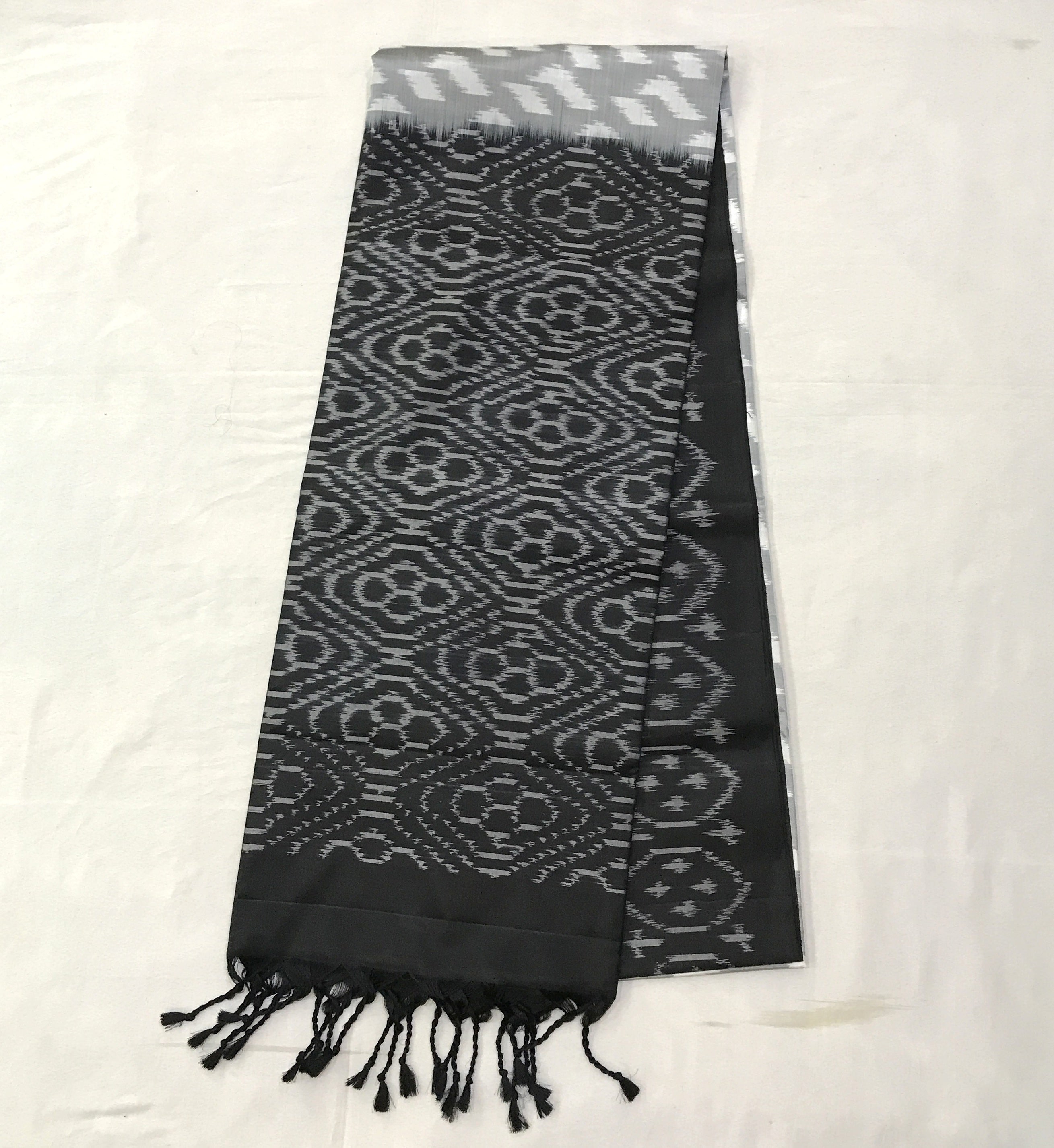 Blouse Colour: Contrast ( Plain black and saree comes along with tassels )