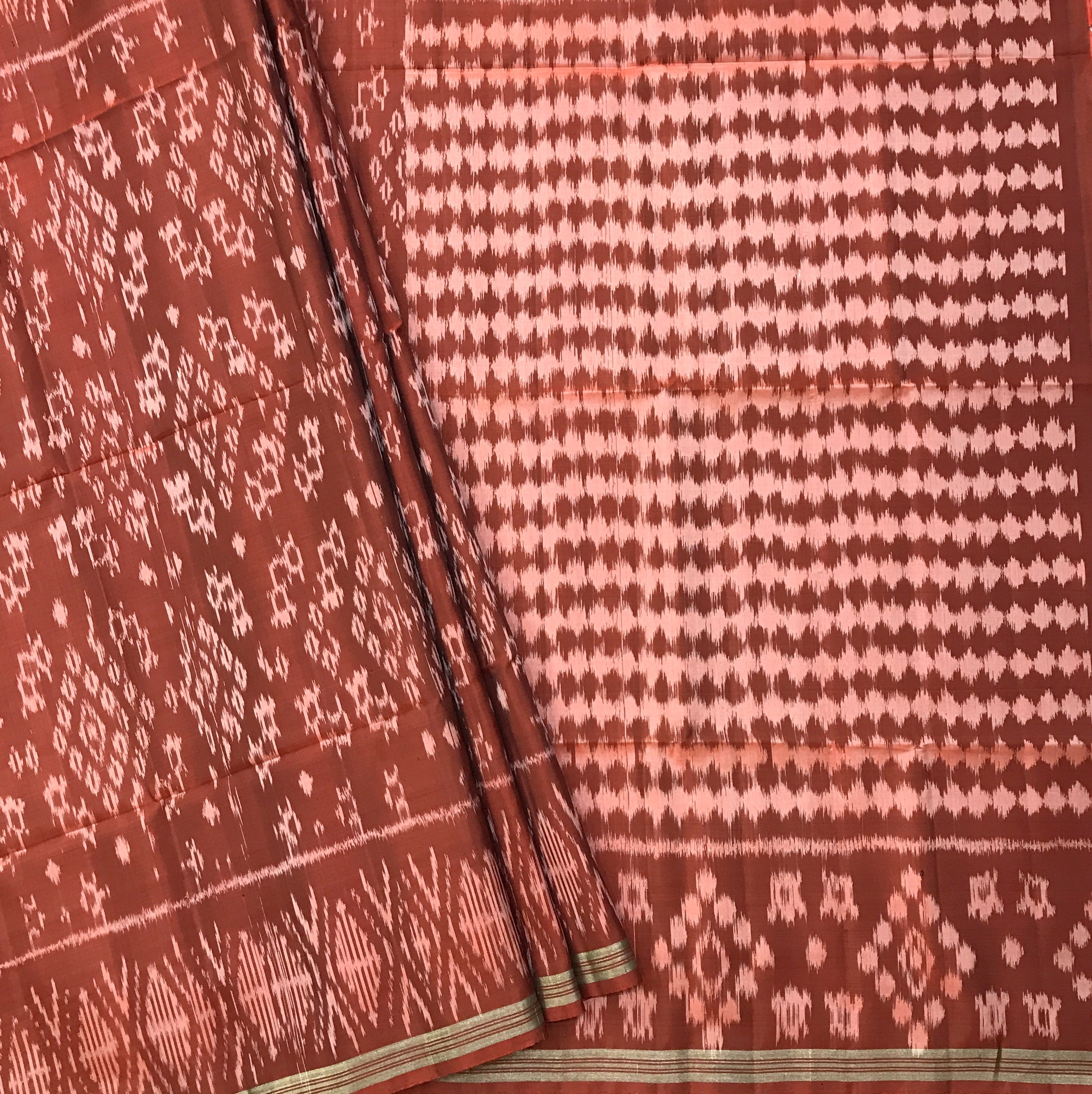 This maroon colour saree , this Soft Silk saree flaunts beautiful ikkat design with self coloured border and ikkat design pallu give this weave a classy feel. Comfortable to wear and easy to drape this saree is look special. This combination makes this saree a prefect casual or party wear weave.
