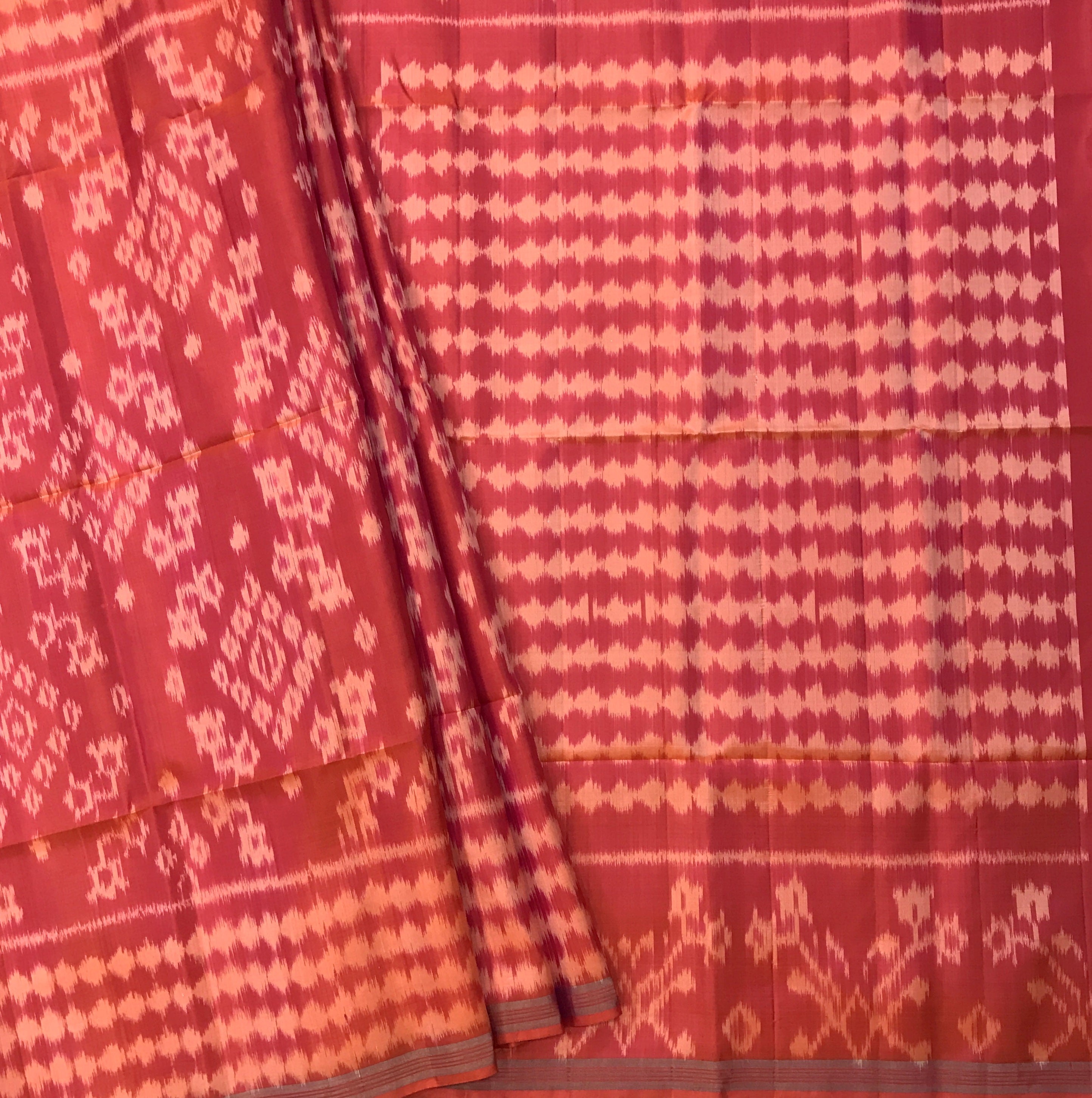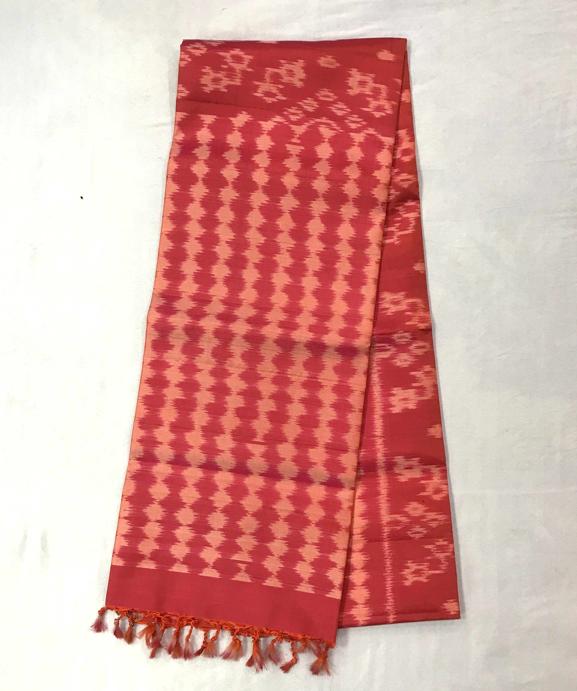 This peach colour saree , this Soft Silk saree flaunts beautiful ikkat design with self coloured border and ikkat design pallu give this weave a classy feel. Comfortable to wear and easy to drape this saree is look special. This combination makes this saree a prefect casual or party wear weave.