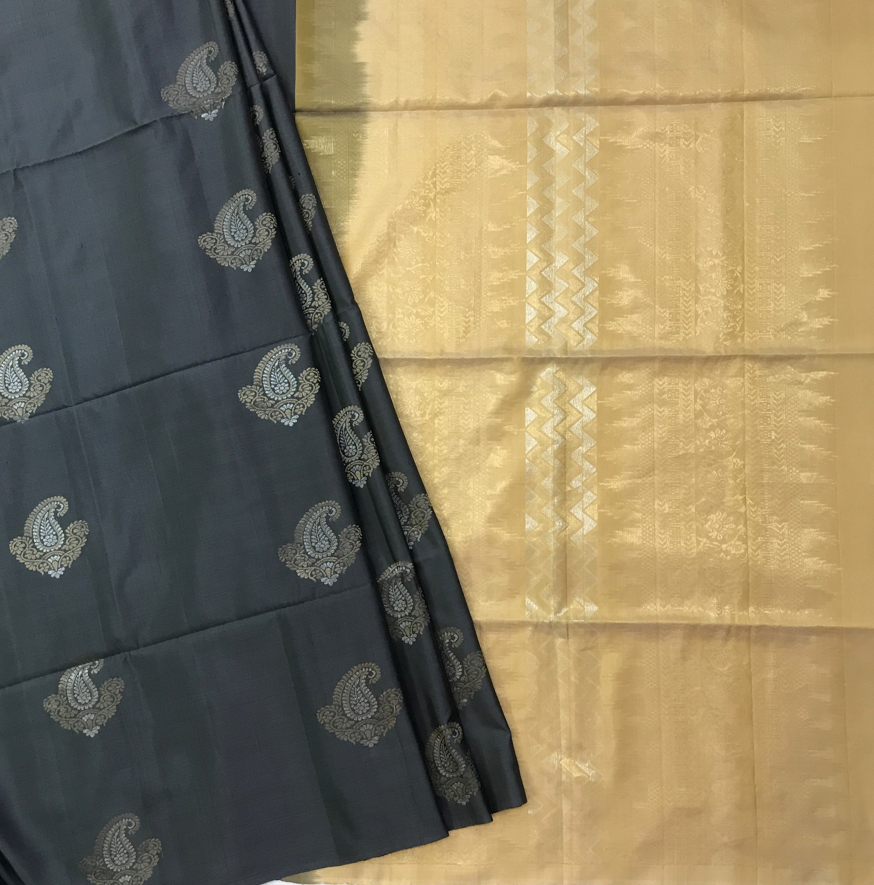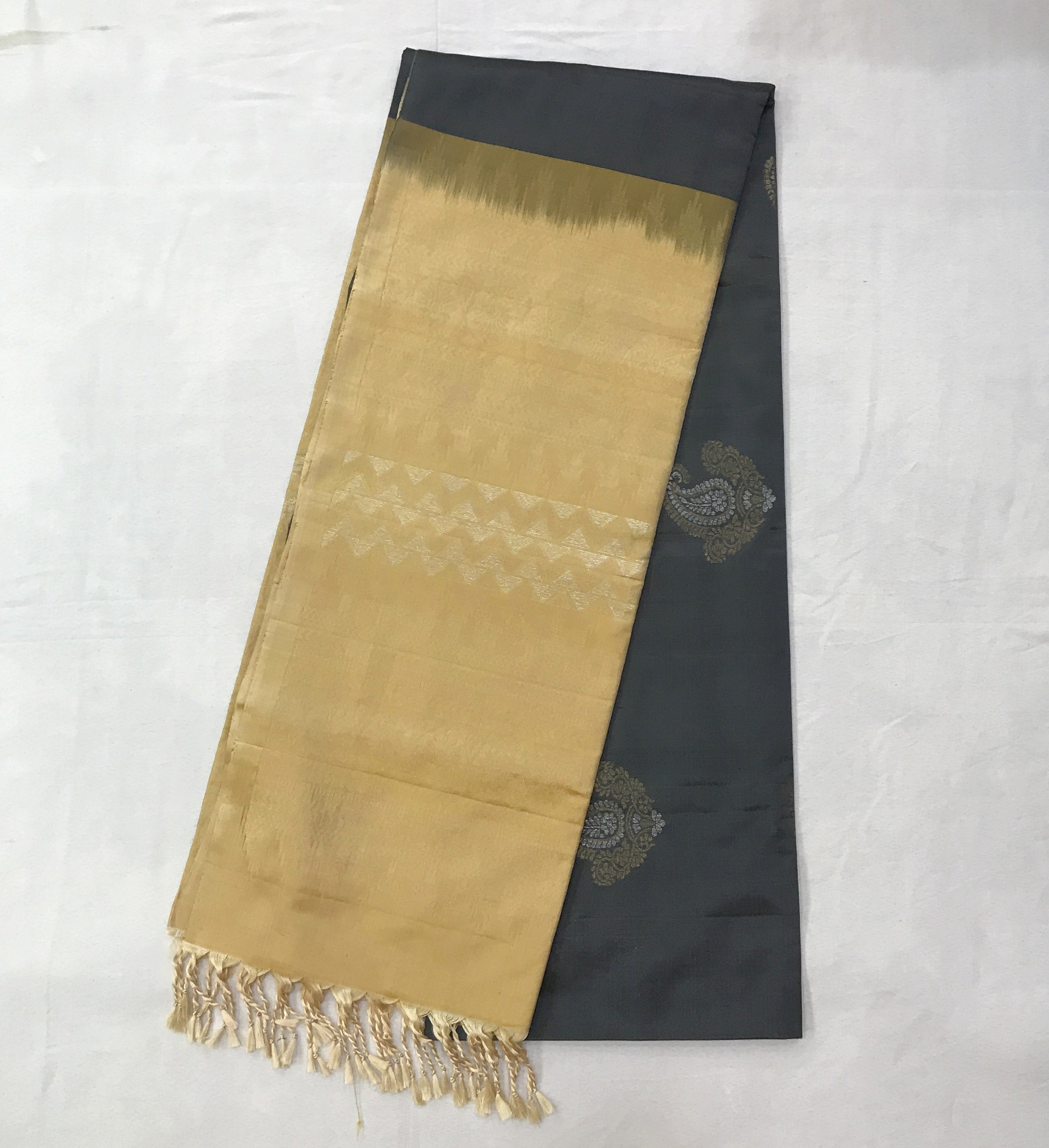 This elegant handwoven silk saree features a soothing grey body adorned with subtle woven un golden-silver ( butti ) motifs that lend it a refined, understated charm. The contrast beige pallu and without any border, adding depth and character to the drape. A delicate zari edging neatly frames the saree, making it a graceful choice for festive gatherings and timeless celebrations.