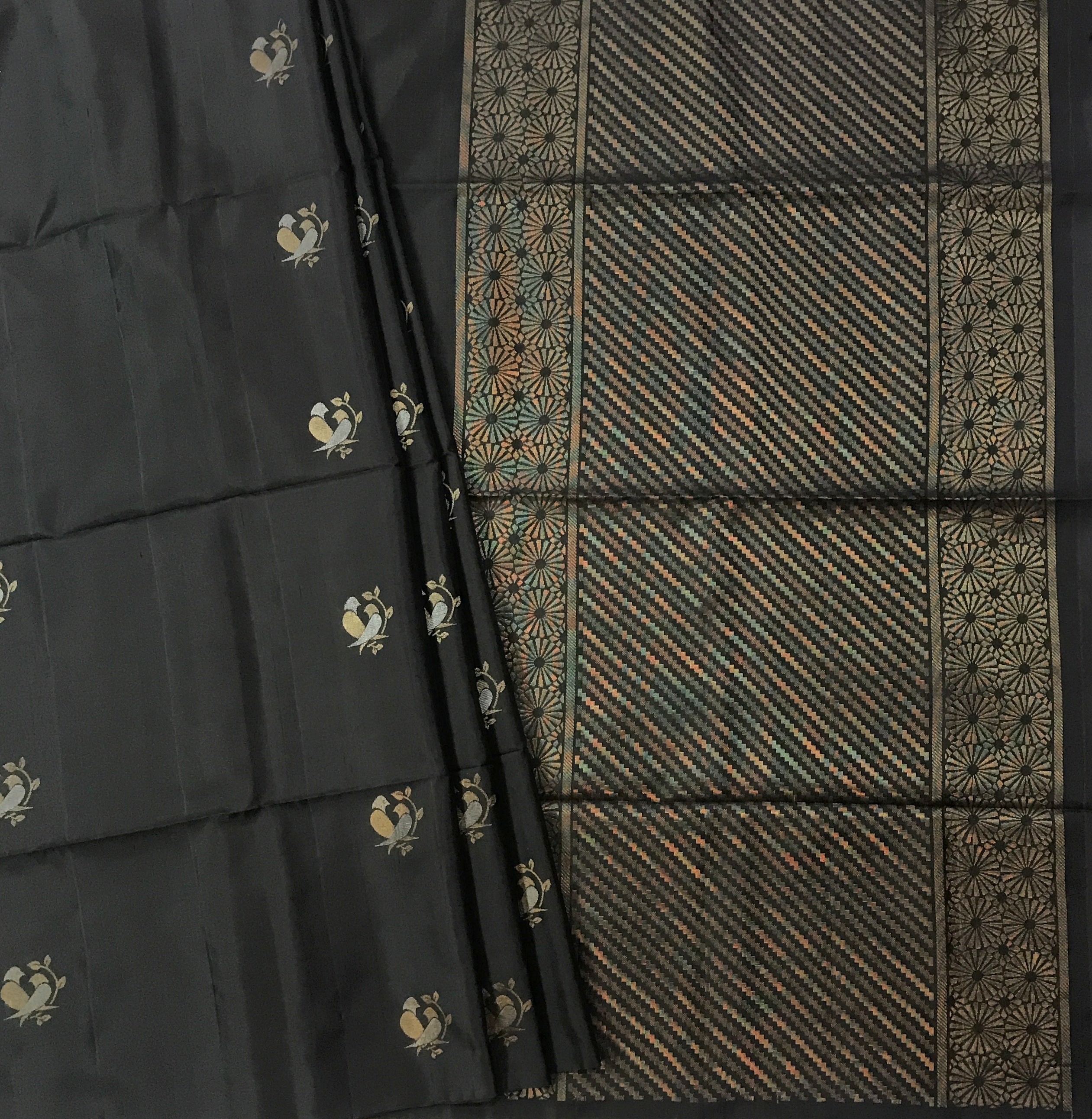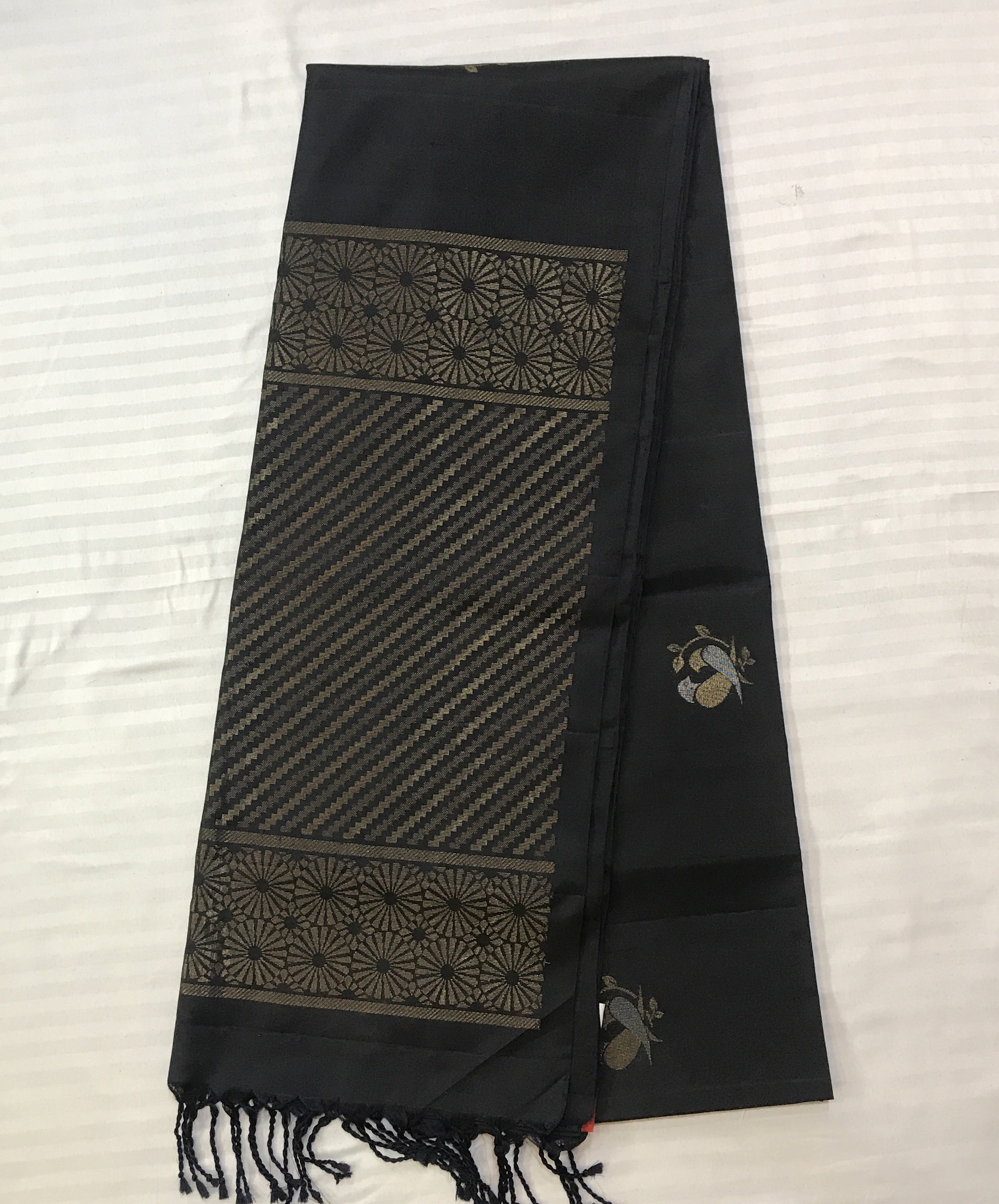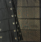 A lovely shade of black Soft Silk always wins hearts, especially when it teams up with a golden zari at its pallu looks fantastic can be worn during the day as well as at night! Do not miss this saree has a very beautiful parrot butti design woven in goldesilver zari and charming zari pallu looks beautiful.