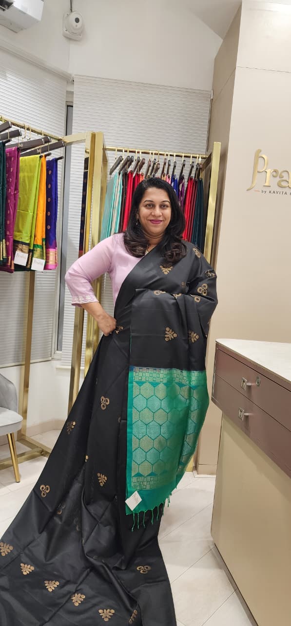 An eternal favorite of so many! A must have in any saree connoisseur's wardrobe! This Light -weight soft silk is an easy to drape saree. Being handwoven, it gives a very comfortable feel, when worn. An excellent and bold colour of black spread throughout the saree, with the exquisite and different design butti woven in golden-silver zari thread look amazing with attractive golden pink zari pallu looks great.