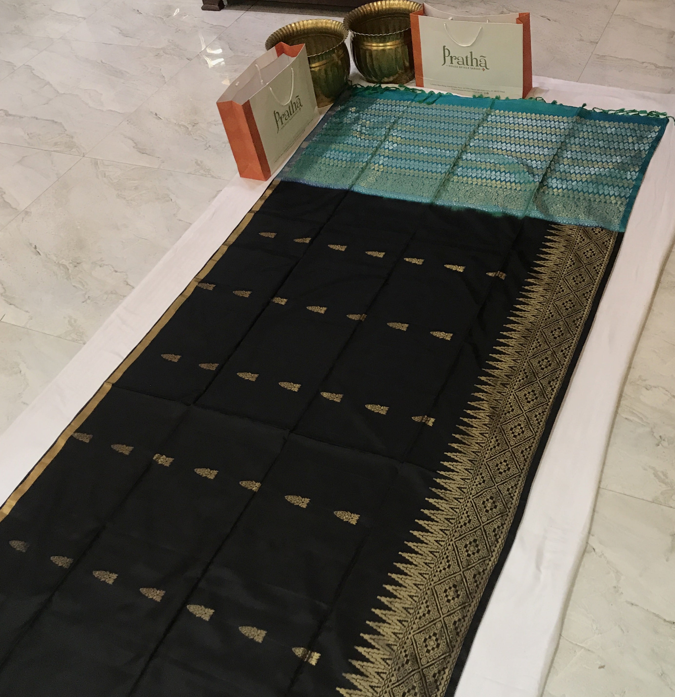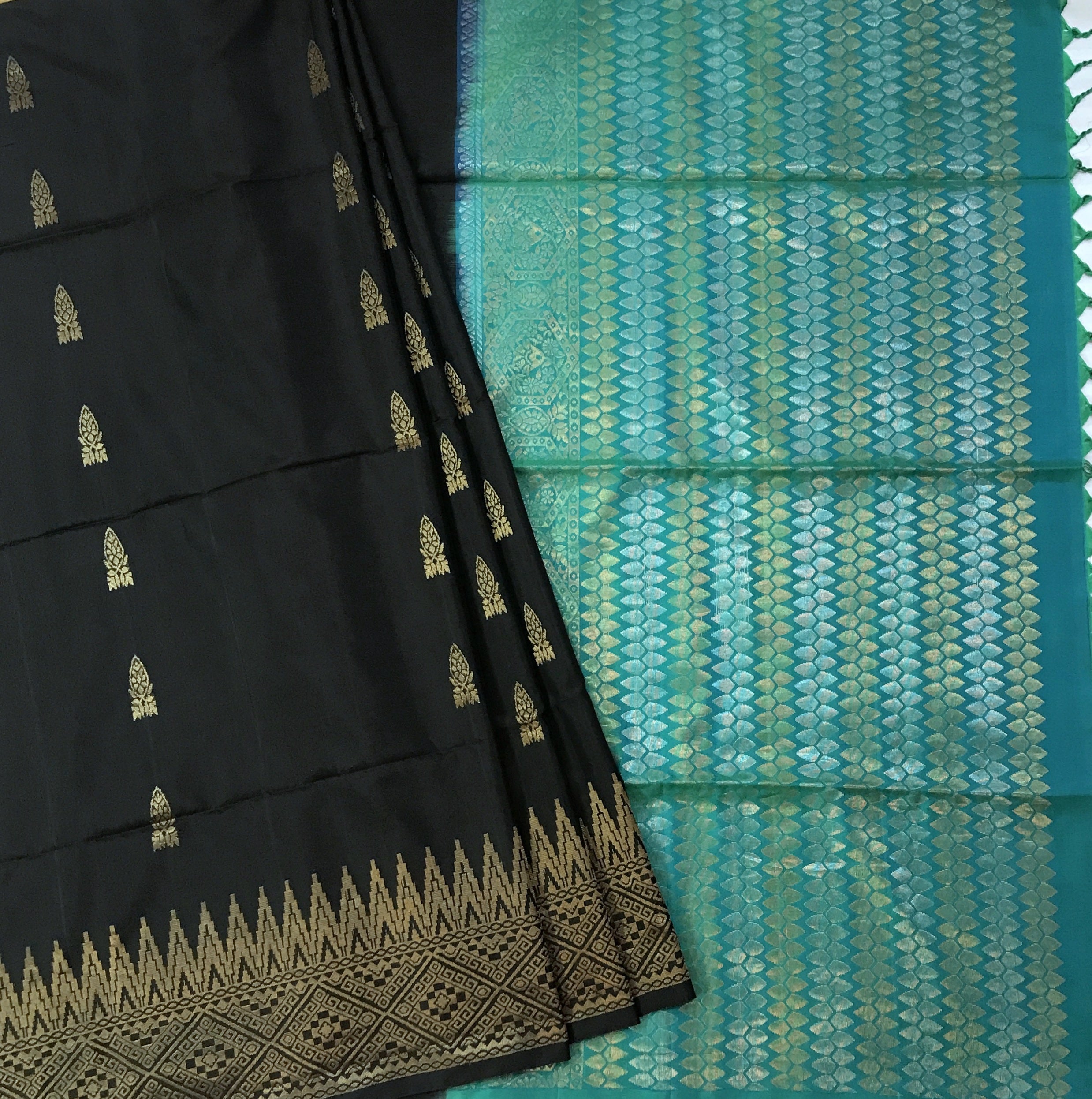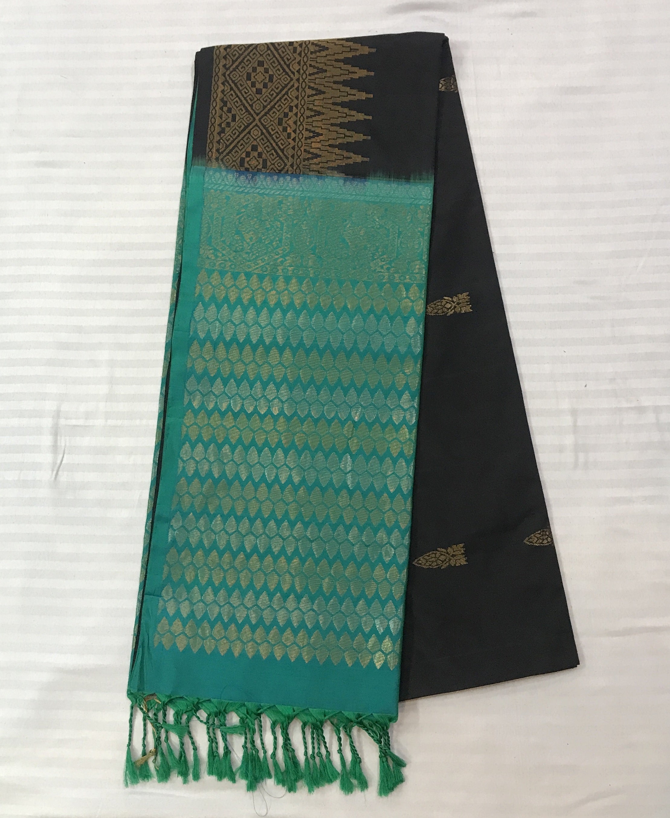 A lovely shade of black Soft Silk always wins hearts, especially when it teams up with a golden zari at its pallu looks fantastic can be worn during the day as well as at night! Do not miss this saree has a very beautiful and unique butti design woven in golden zari and charming green zari pallu looks beautiful.