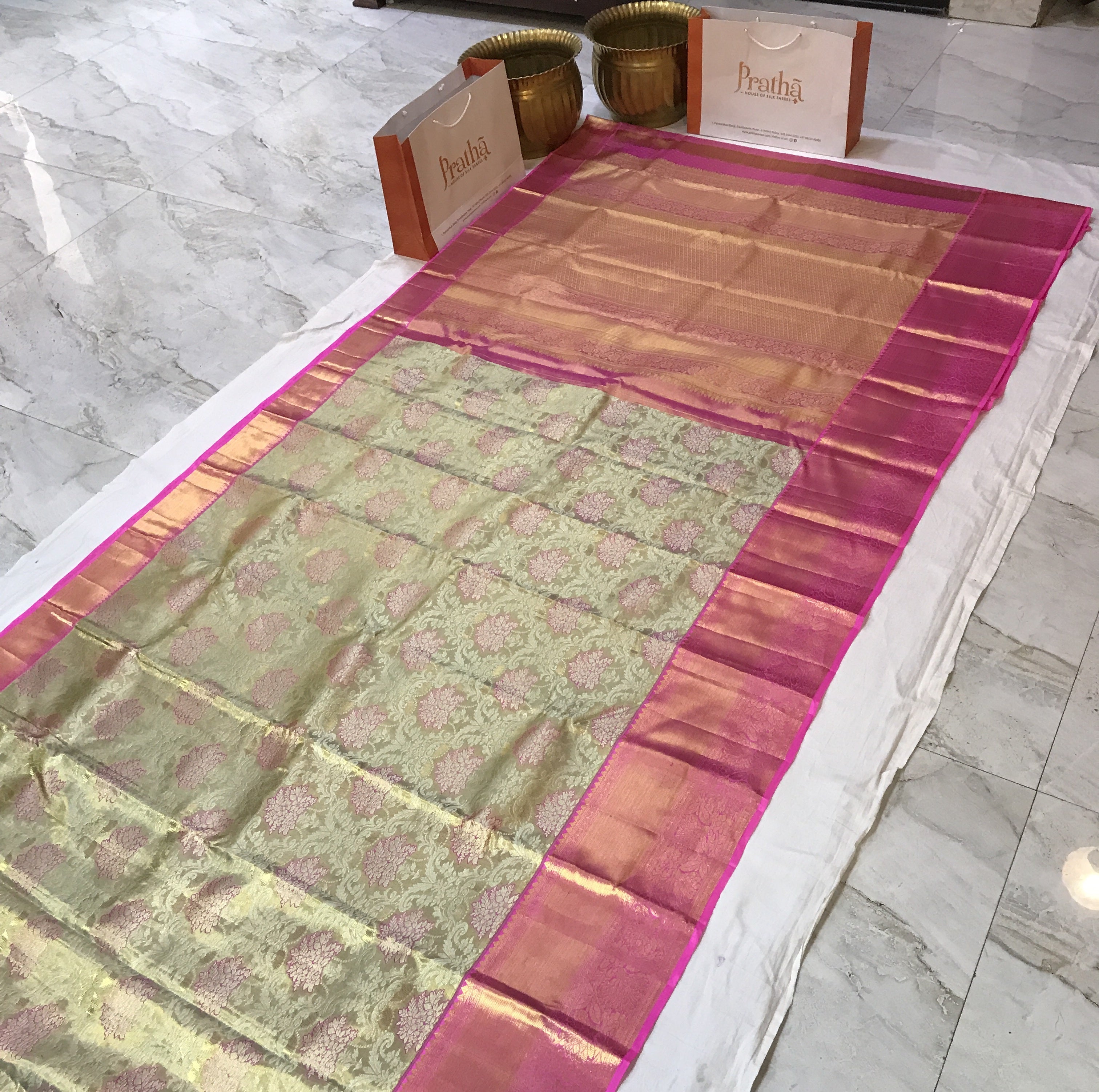 This mesmerizing tissue Kanjeevaram saree is a true work of art, distinguished by its intricately woven border that seamlessly blends into the rich brocade design. The vibrant pista-green hue, paired with a traditional speach coloured border, exudes timeless charm, while the classic tissue pallu adds a touch of grandeur. Delicate meenakari accents further enhance its allure, making this masterpiece a perfect fusion of elegance and craftsmanship.