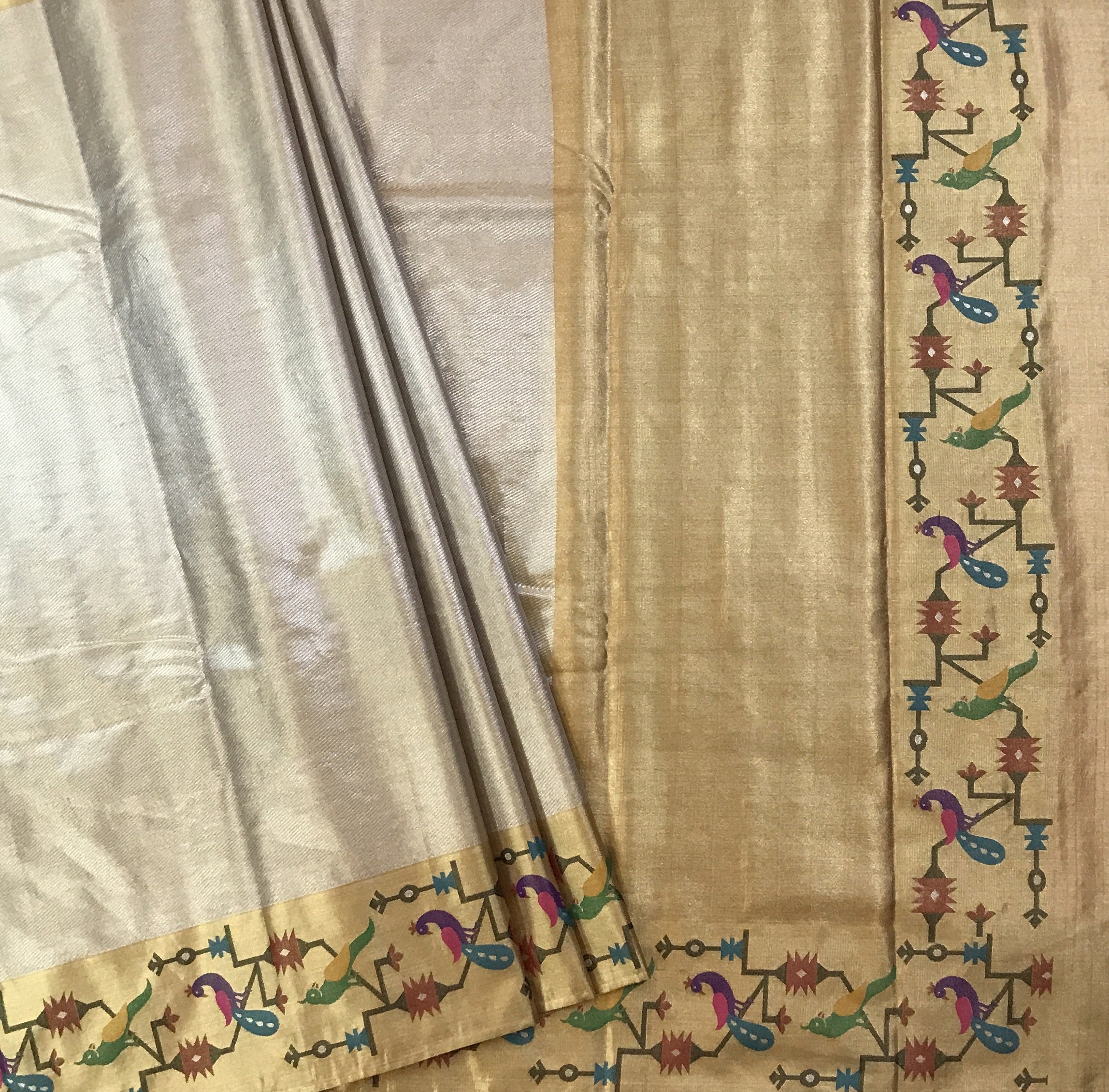 This exquisite tissue Paithani in a graceful silver–gold tone radiates sheer sophistication and festive elegance. The shimmering tissue body gives the saree a luxurious, luminous finish, making it perfect for grand occasions. Its beautifully woven border, adorned with traditional muniya motifs in vibrant shades of purple, green, blue, and mustard, adds a charming touch of classic Paithani artistry. The subtle yet rich pallu featuring the same intricate motifs enhances its timeless appeal, making this saree a stunning blend of tradition and modern refinement. Pratha brings you this elegant piece crafted to elevate any celebration.