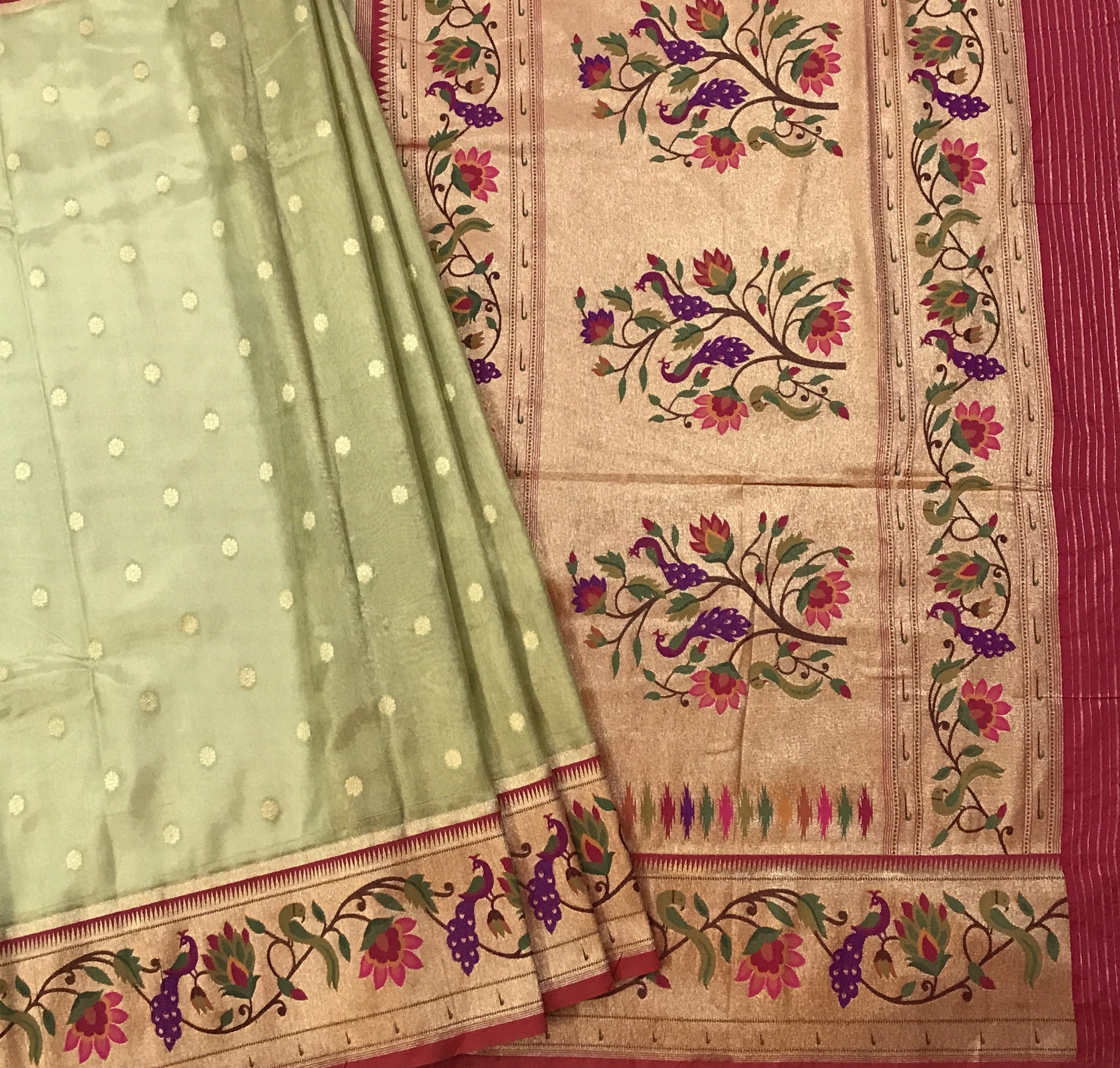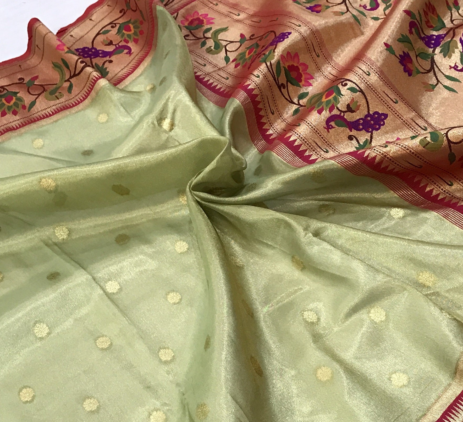 This elegant tissue Paithani in a soothing pastel green shade exudes a rich festive charm. The delicate golden tissue weave paired with subtle gold buttis across the body gives it a refined, sophisticated glow. The beautifully crafted golden tissue border adorned with vibrant floral and peacock motifs in pink, purple, and green adds a timeless Paithani grace. The exquisite pallu, featuring the same intricate meena-worked peacocks and florals, enhances the saree with a luxurious, traditional appeal. A perfect pick for celebrations, this tissue Paithani stands out for its classic artistry and understated opulence.
