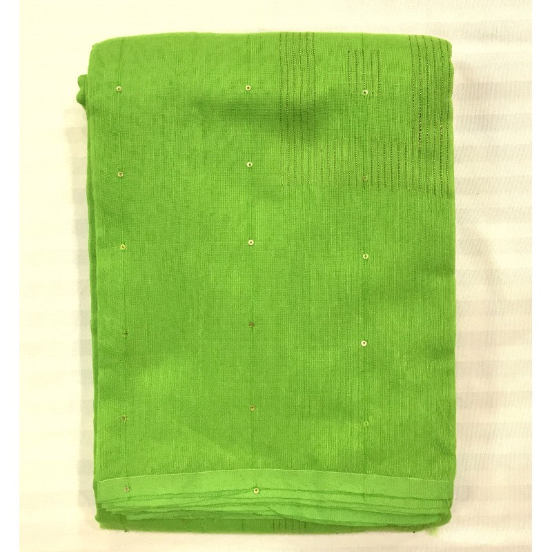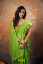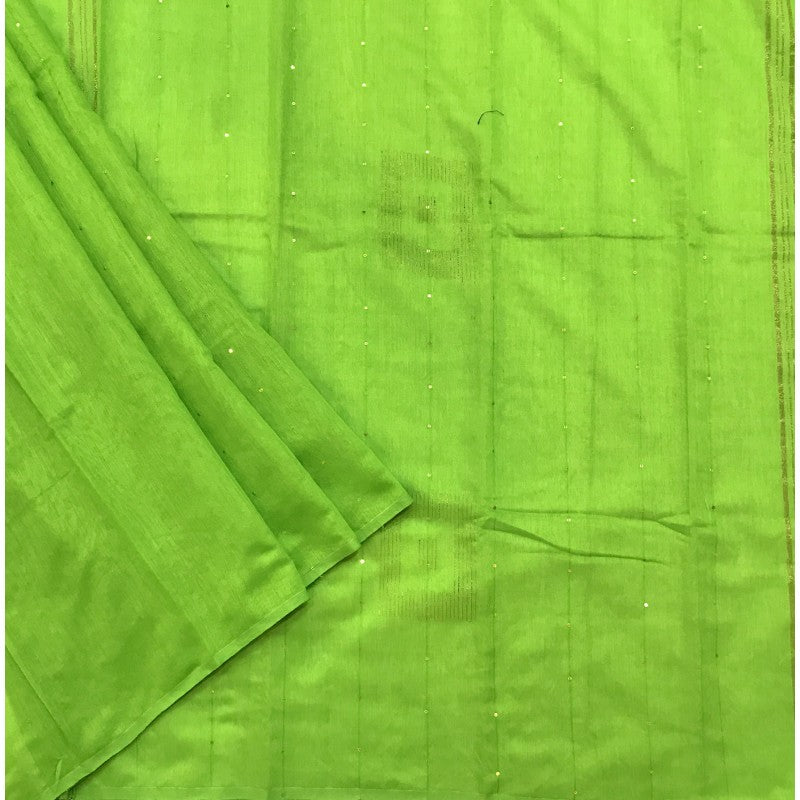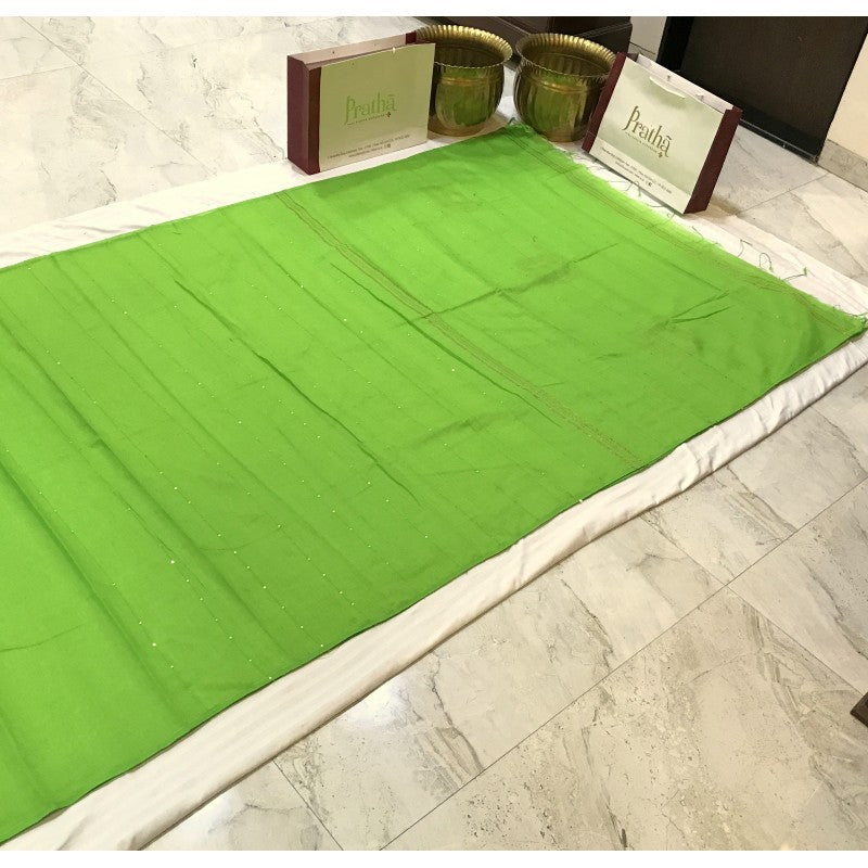 This is a new genre of sarees launched by Pratha. This green plain Baha with Chumki silk saree is delicately accentuated with chumki pallu adds grace to this party wear saree by Pratha.