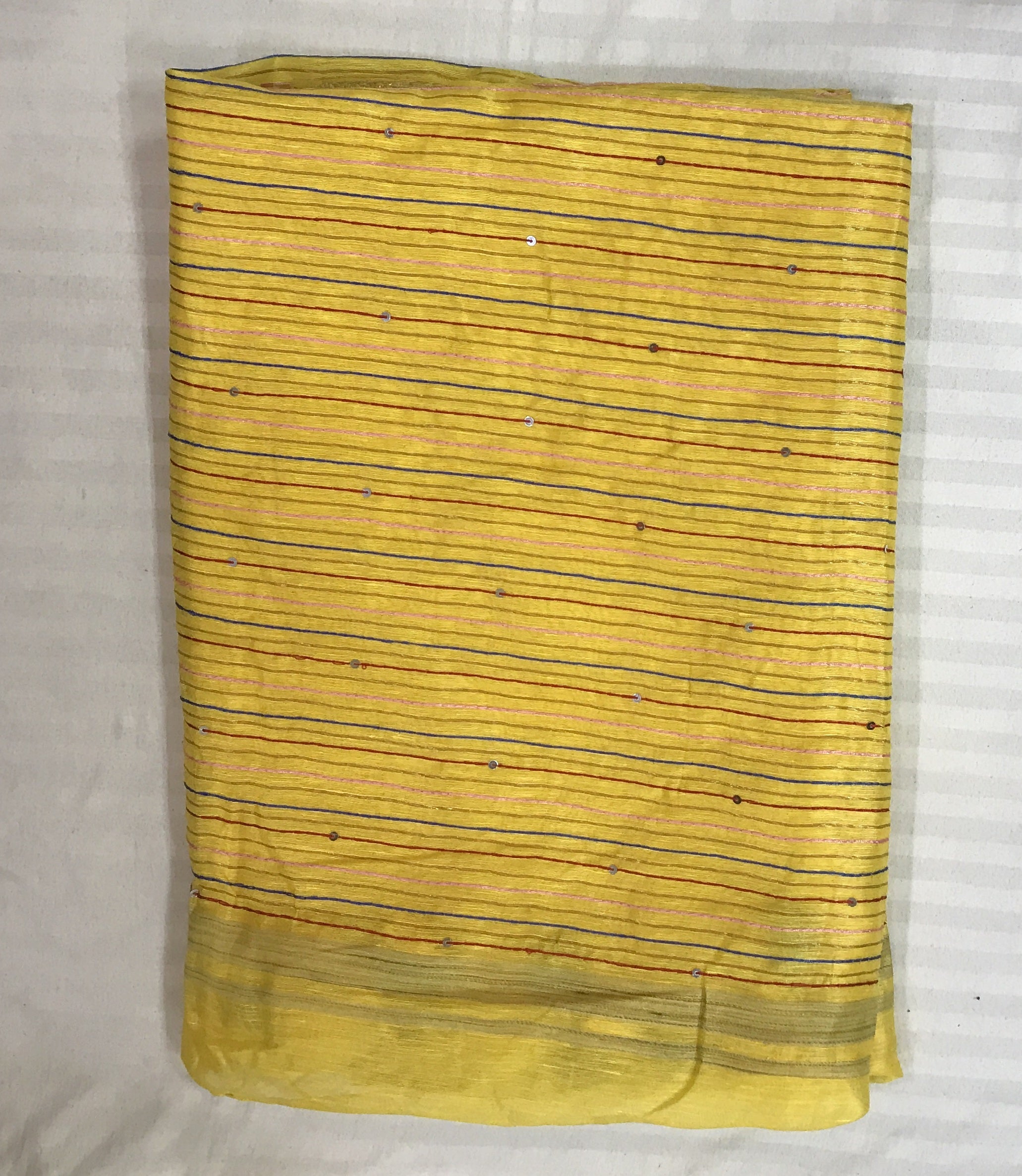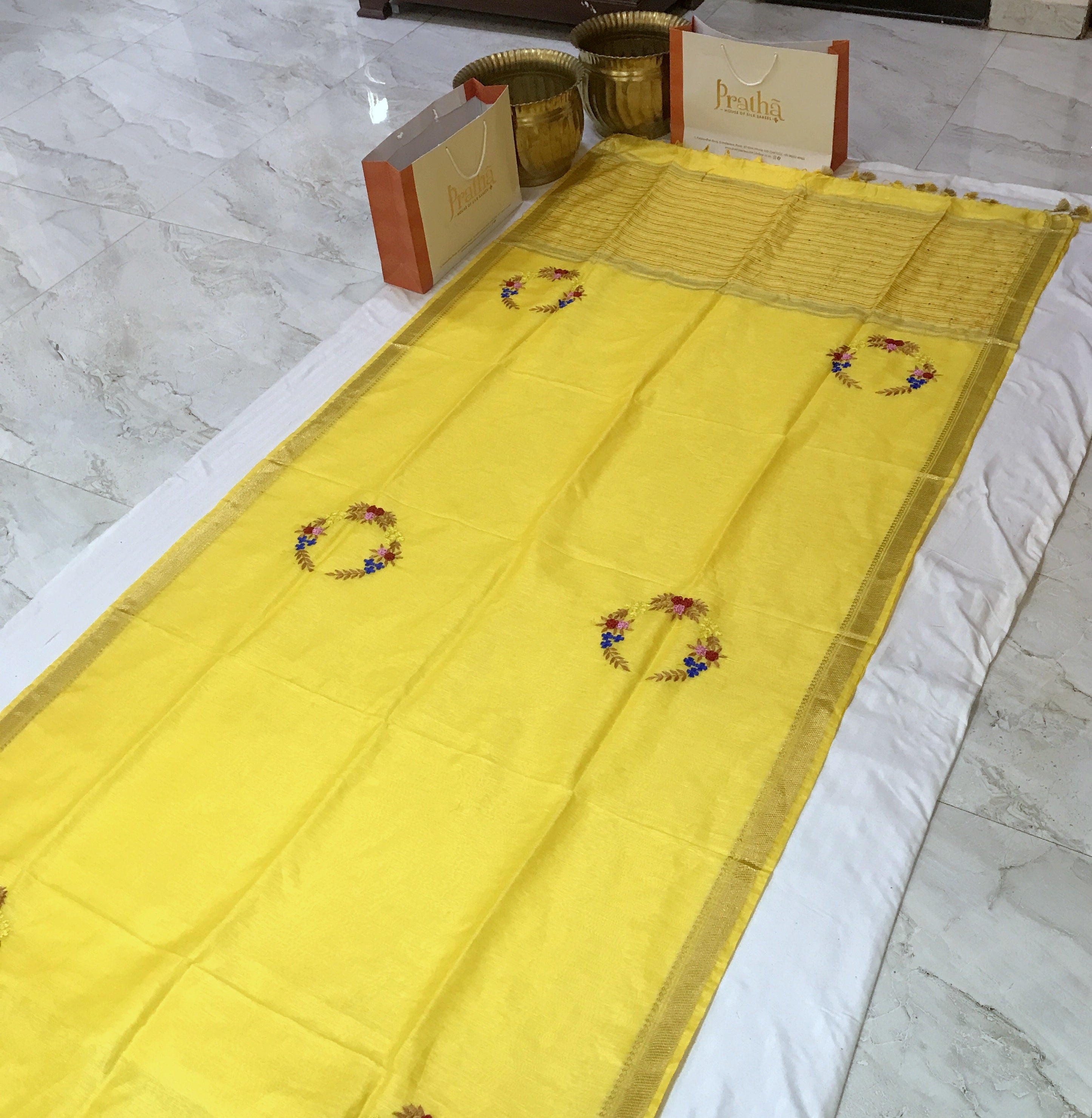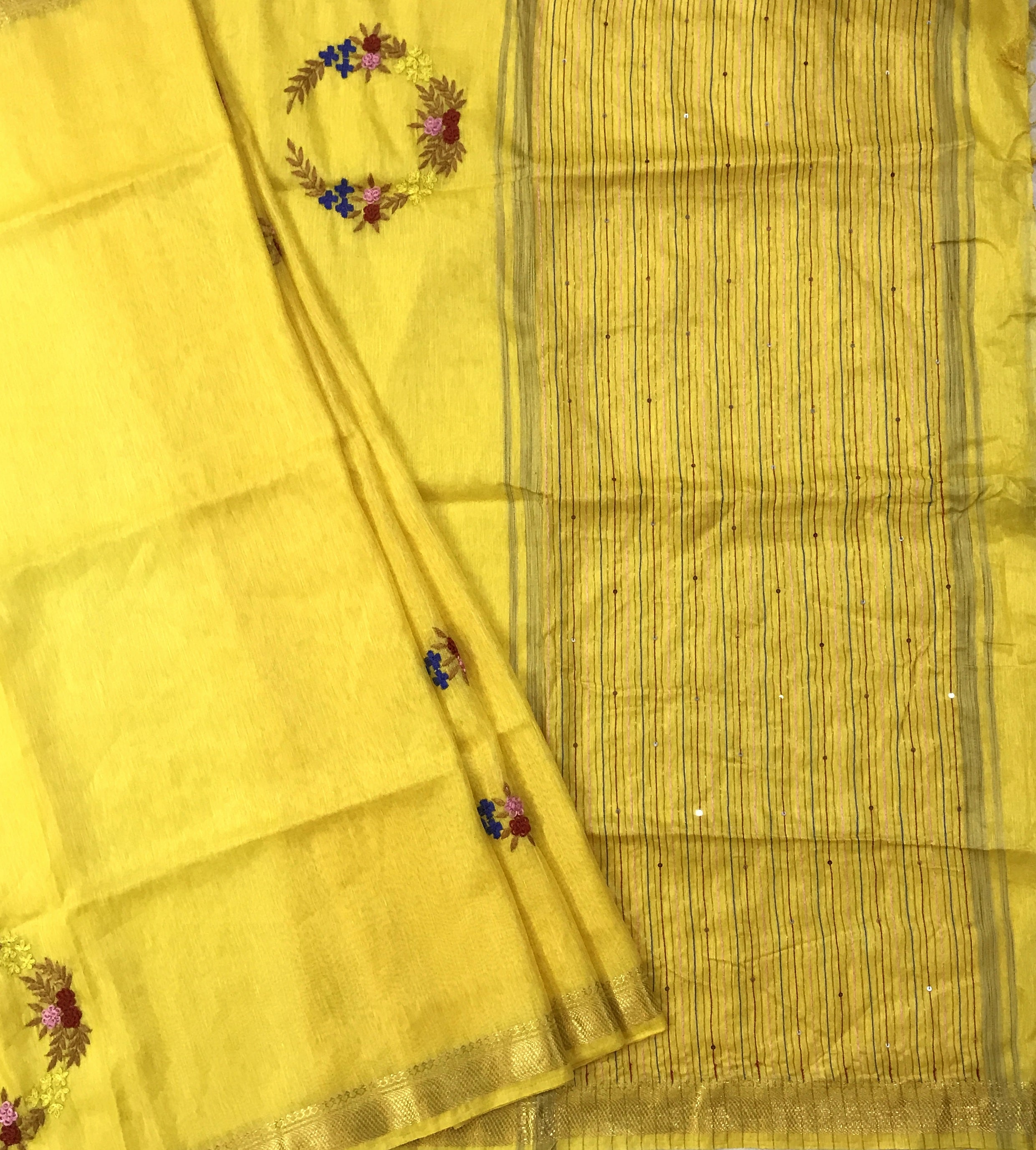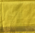 It has a very different feel to it of Silk LInen! This saree has beautiful embroidery which is inspired by ' French knot'. A beautiful cusp of Tissue-fabric and linen weaving, this saree style is loved by so many! This linen saree are pleasing to the eyes and comfortable to drape! A very beautiful fresh yellow colour of Silk Linen handloom saree from ' West Bengal' , with bold and beautiful golden zari border with silk lining design on pallu looks casual! This saree look great at parties, corporate events, casual occasions.