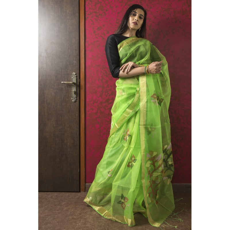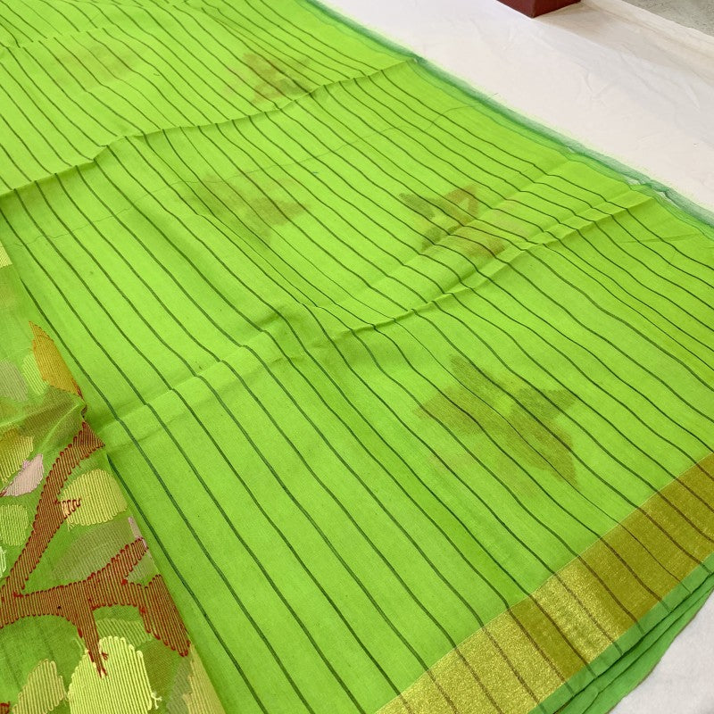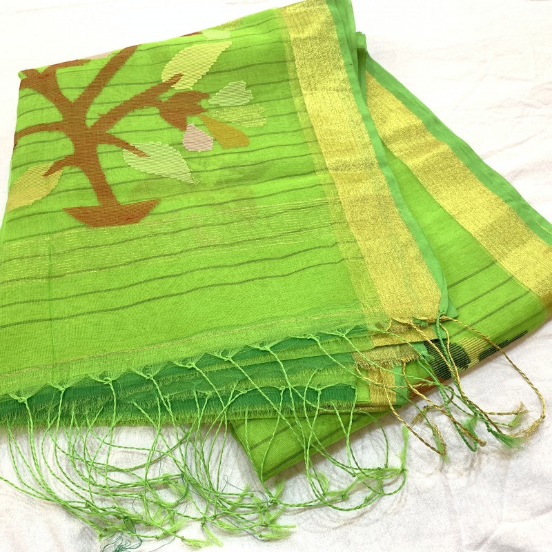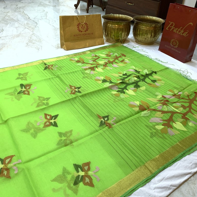 A refreshing Green coloured pure muslin saree. This is extremely light in weight and easy to drape. Beautifully decorated with floral butti.