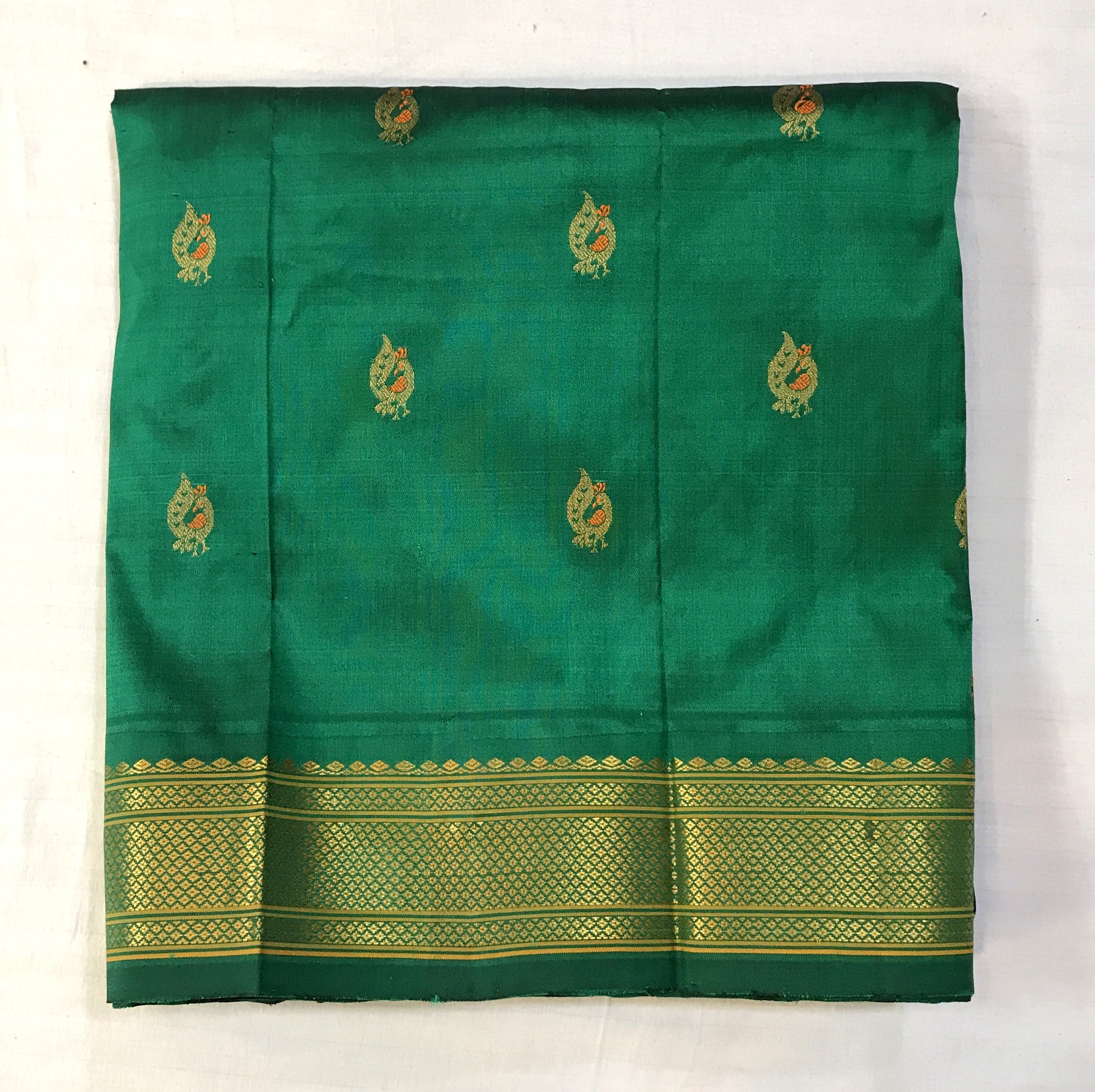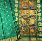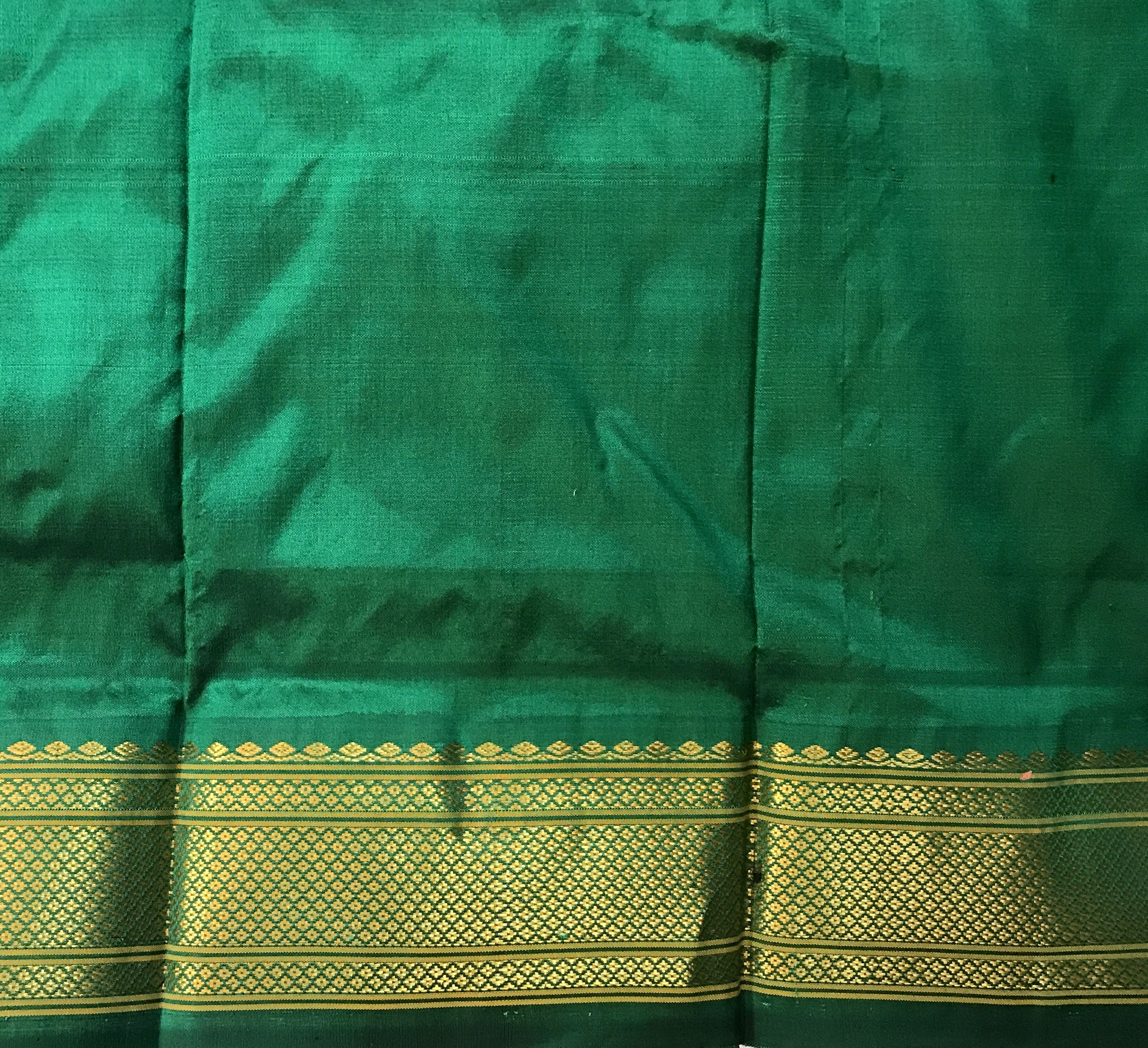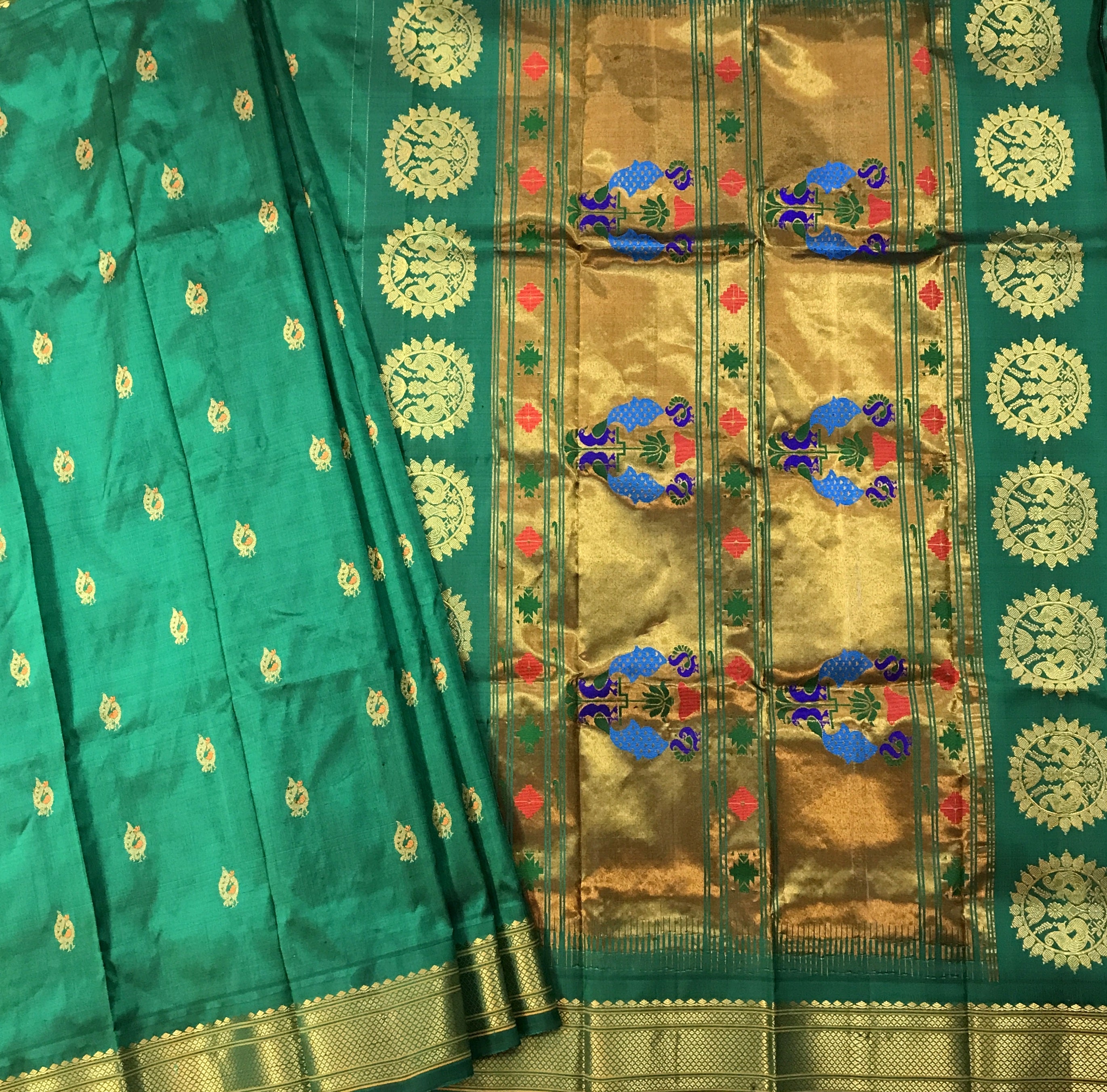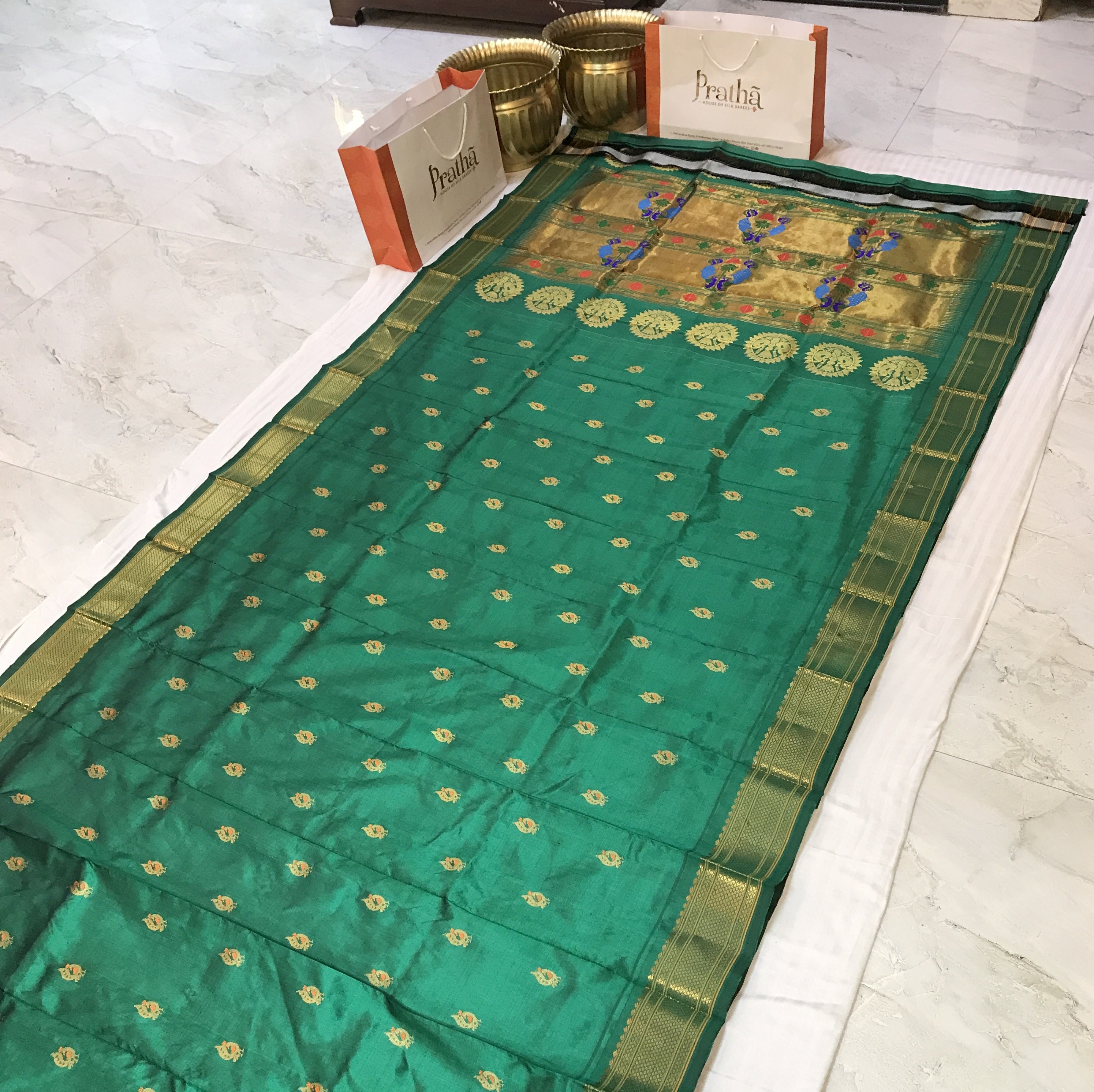 A supreme Paithani weave, in this stunning, beautiful shade of shining green is a treat to your eyes! This, with a beautiful self border looks incomparable! Do not miss the peacock butti highlighted in red silk thread throughout this Paithani! The traditional tissue pallu with elaborate peacock motifs looks graceful. This is a perfect pick for those who are looking for a unique Paithani to add their collections!