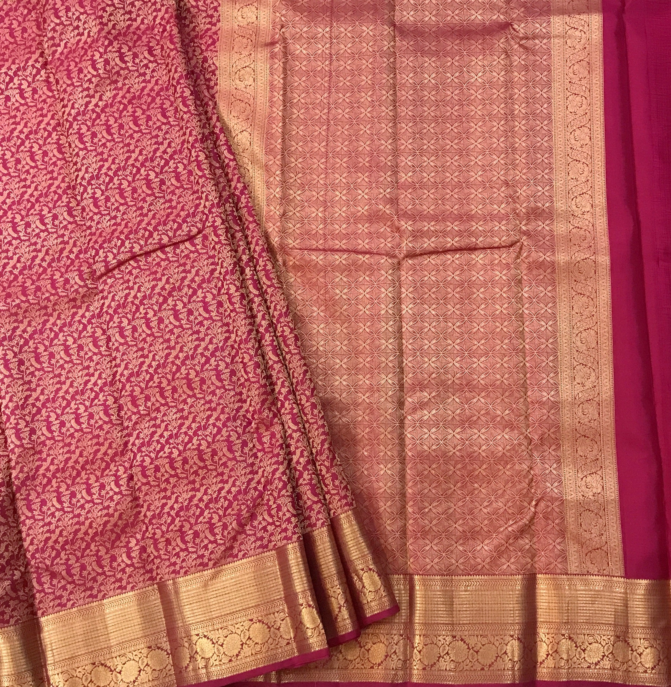 This stunning Kanjeevaram saree, with its mesmerizing interplay of golden zari in brocade design, is the epitome of traditional grandeur. The elegant pink base beautifully complements the intricate design border and pallu, both adorned with intricate zari work. This saree is a perfect choice for weddings and festive celebrations, with the zari weaving adding a touch of opulence to its overall allure.