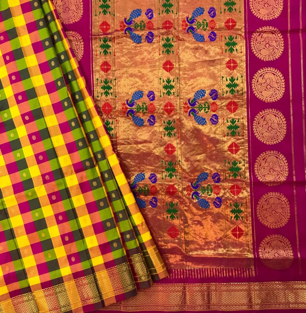 This pure silk checkered paithani saree showcases a striking big checks pattern in a blend of vibrant hues, complemented by delicate floral butti motifs. The intricately woven pallu adds a regal touch, enhancing the saree’s refined elegance. Its bold checks design makes a statement, ensuring it stands out as a true Paithani masterpiece.
