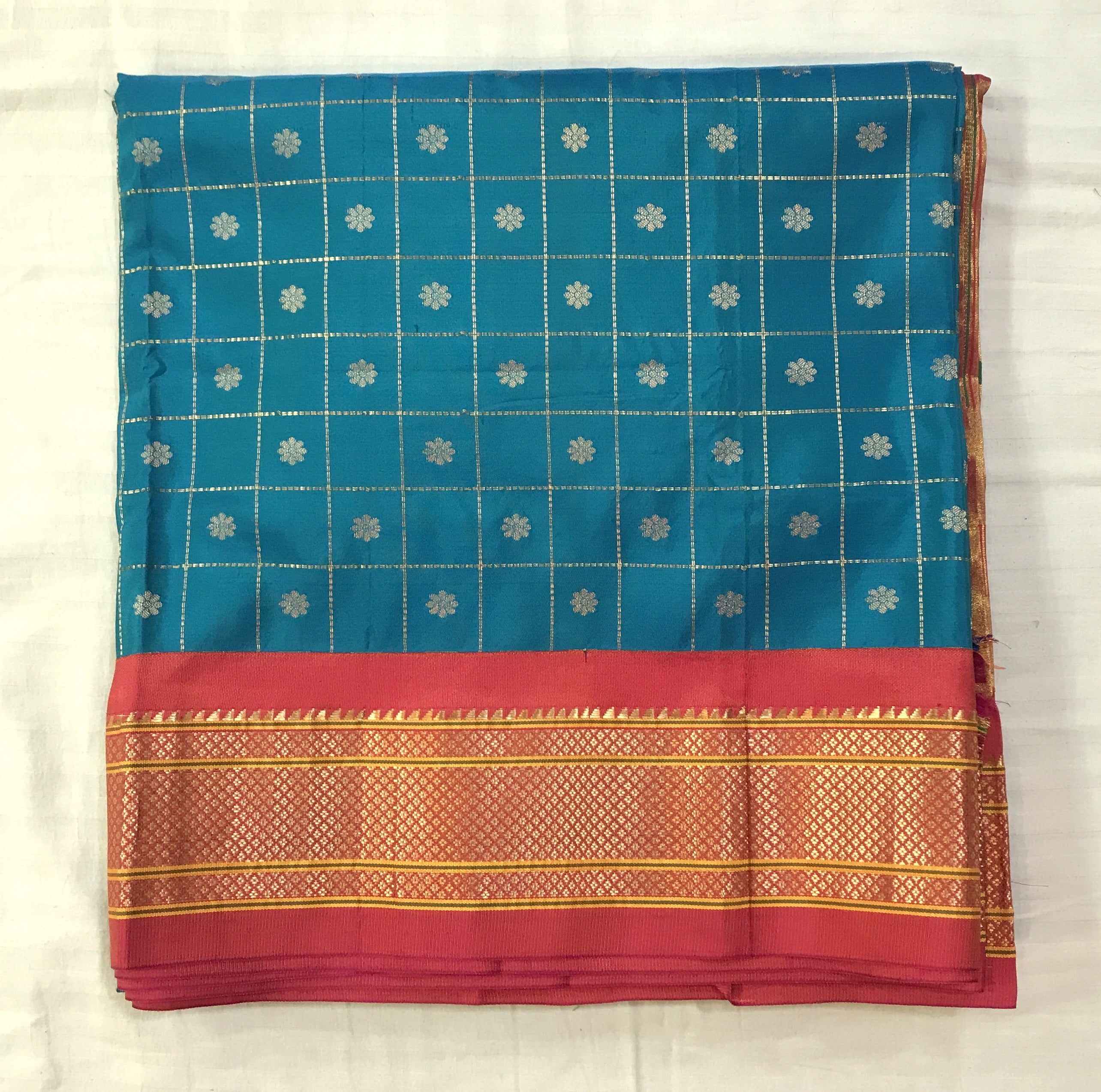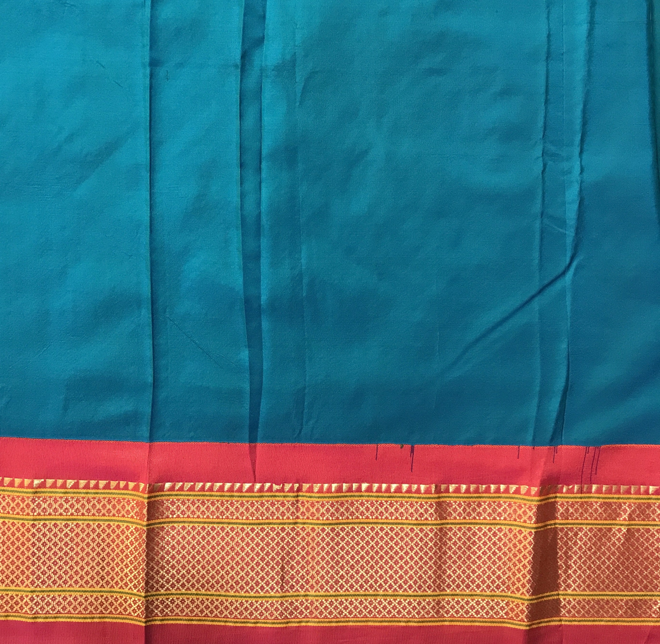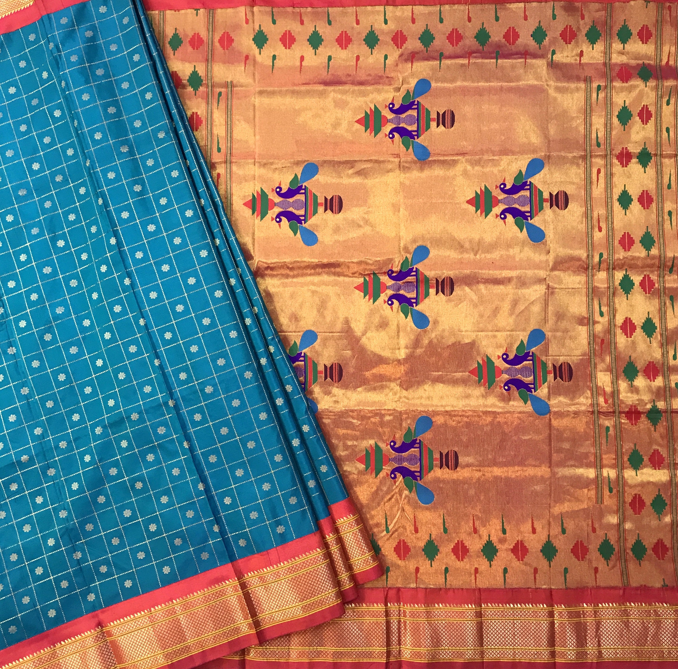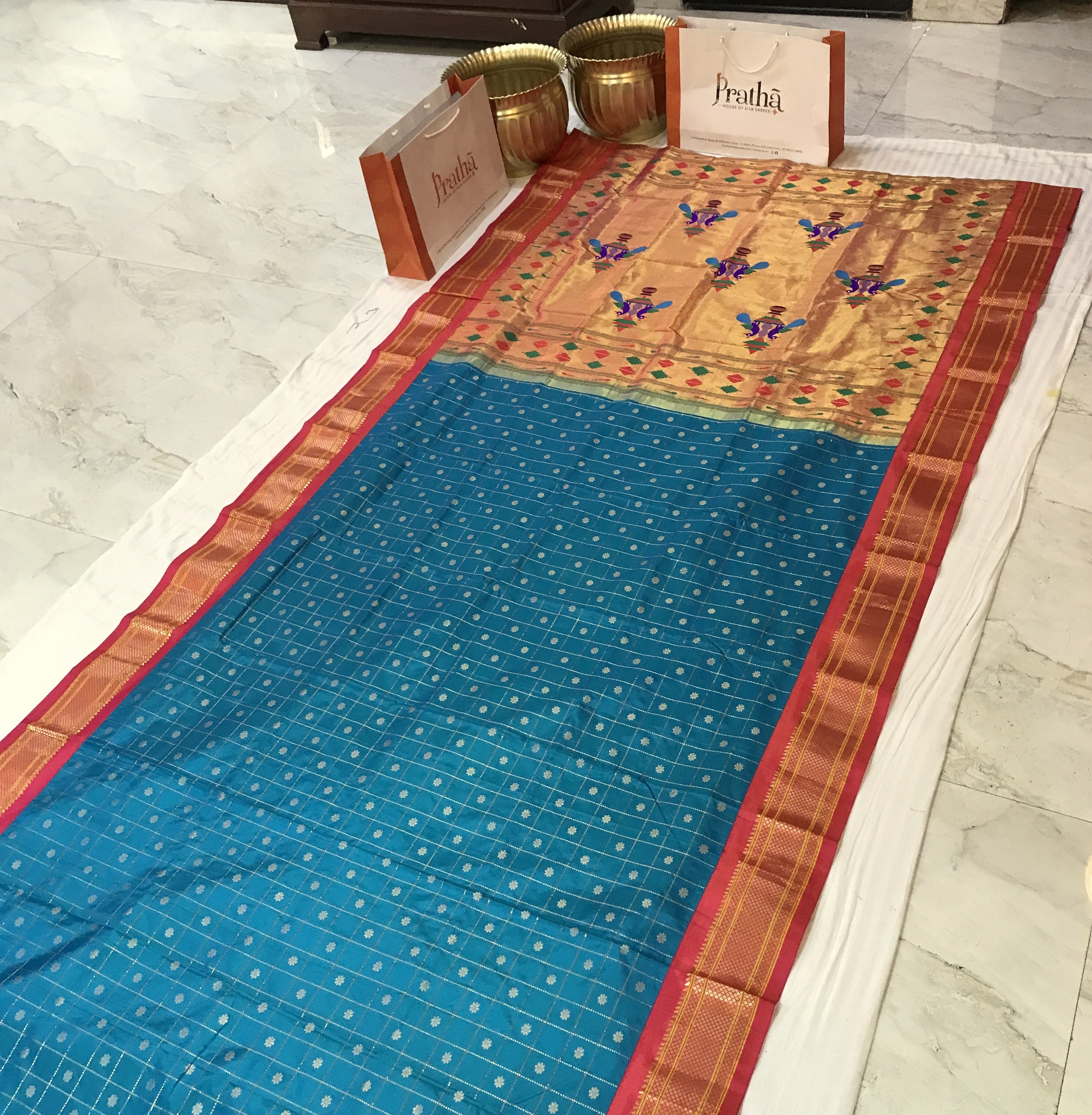 A very gorgeous shade of Peacock blue colour Paithani creates great drama with the high levels. The traditional border and delicate golden-floral butti in checks pattern and classic tissue pallu add an elegance. This vibrant Paithani is perfect for weddings and any other festive occasions!