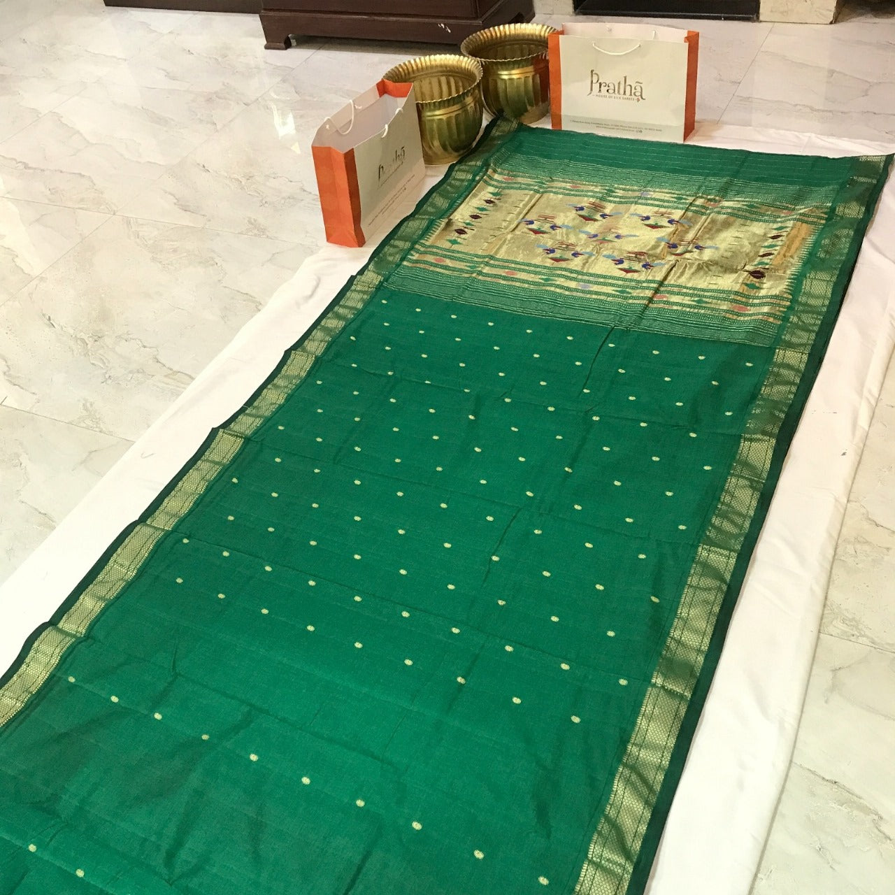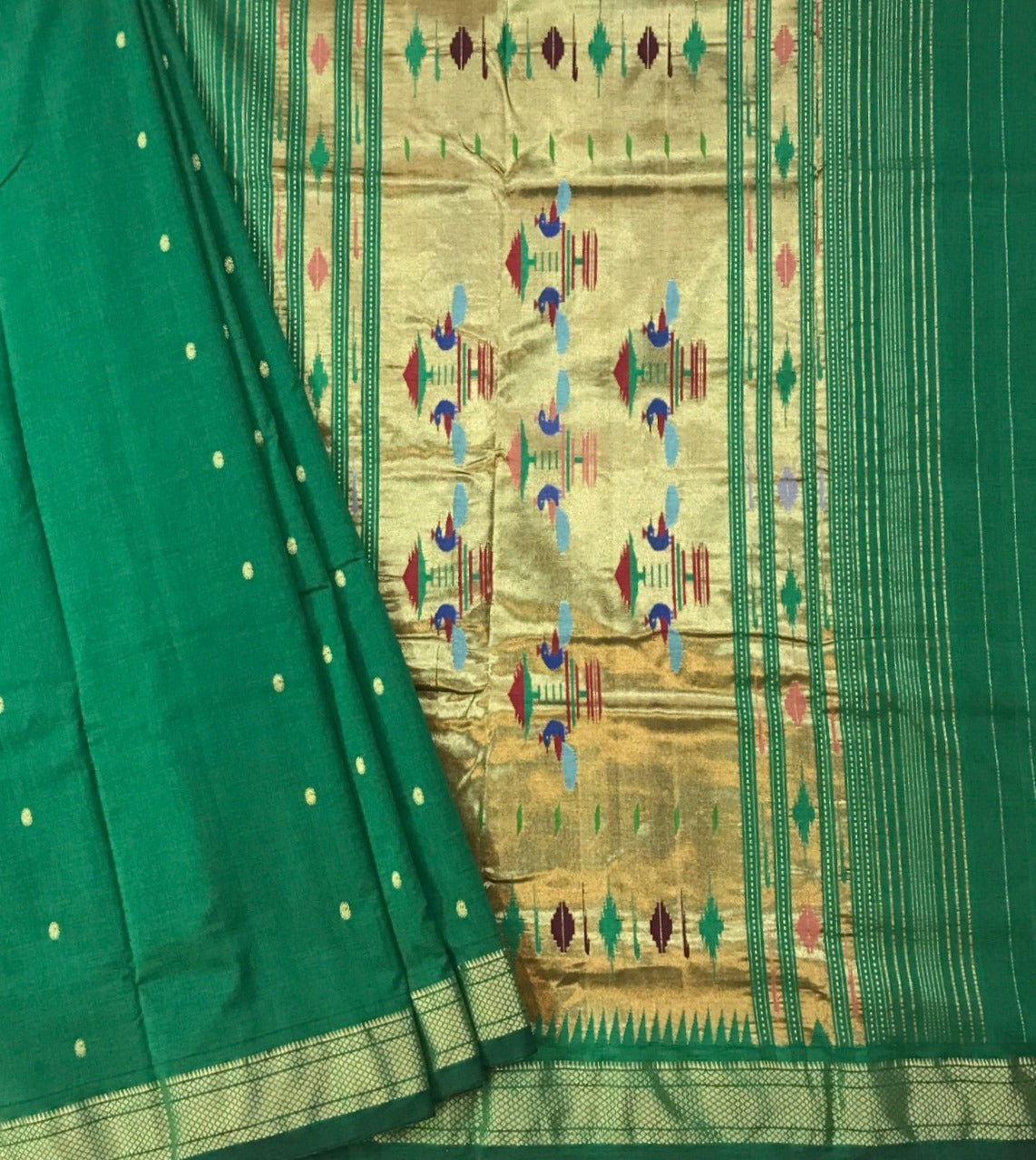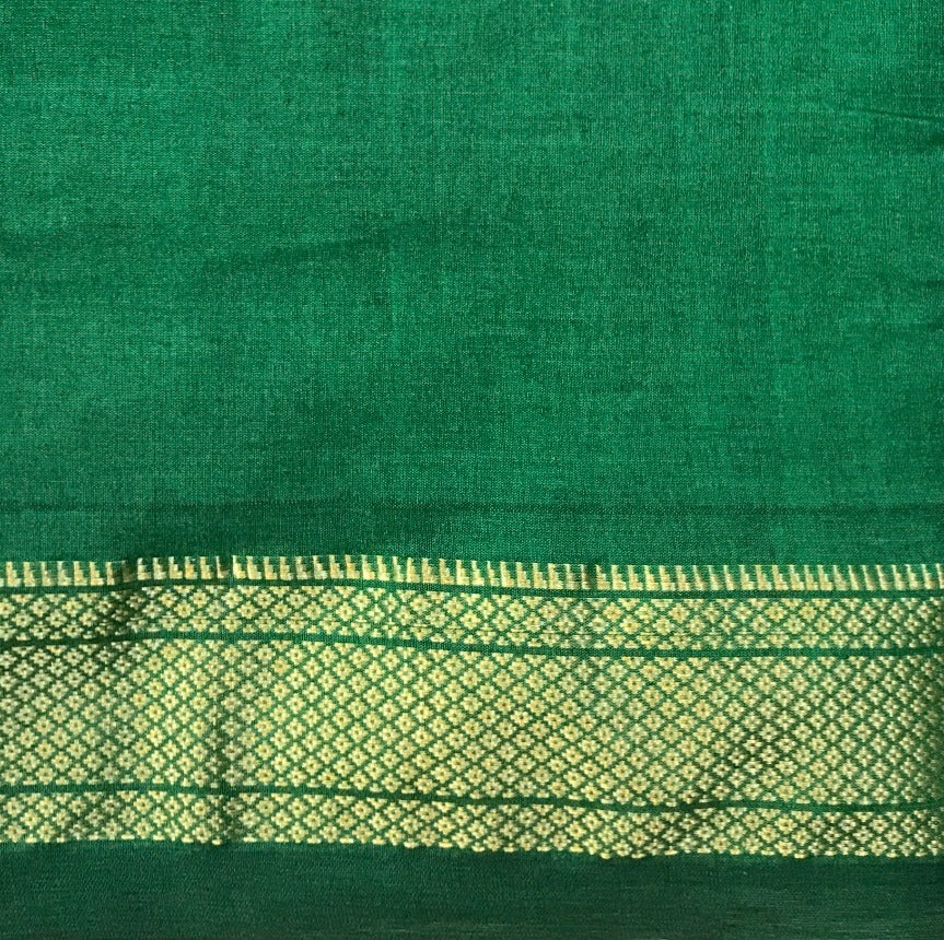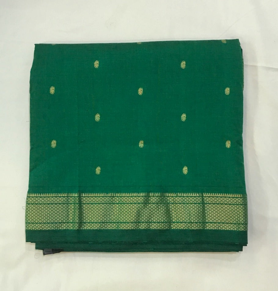 Those who love 'Cotton fabric' will surely love this Cotton Paithani ! This handwoven cotton weave with traditional tissue pallu is incredible. A very beautiful shade of green with a self coloured golden zari traditional border that looks awesome , this definitely going to win your heart. Light in weight and easy to drape, this Cotton Paithani is Casual yet elegant, simple yet graceful one can flaunt this saree at a variety of occasions!