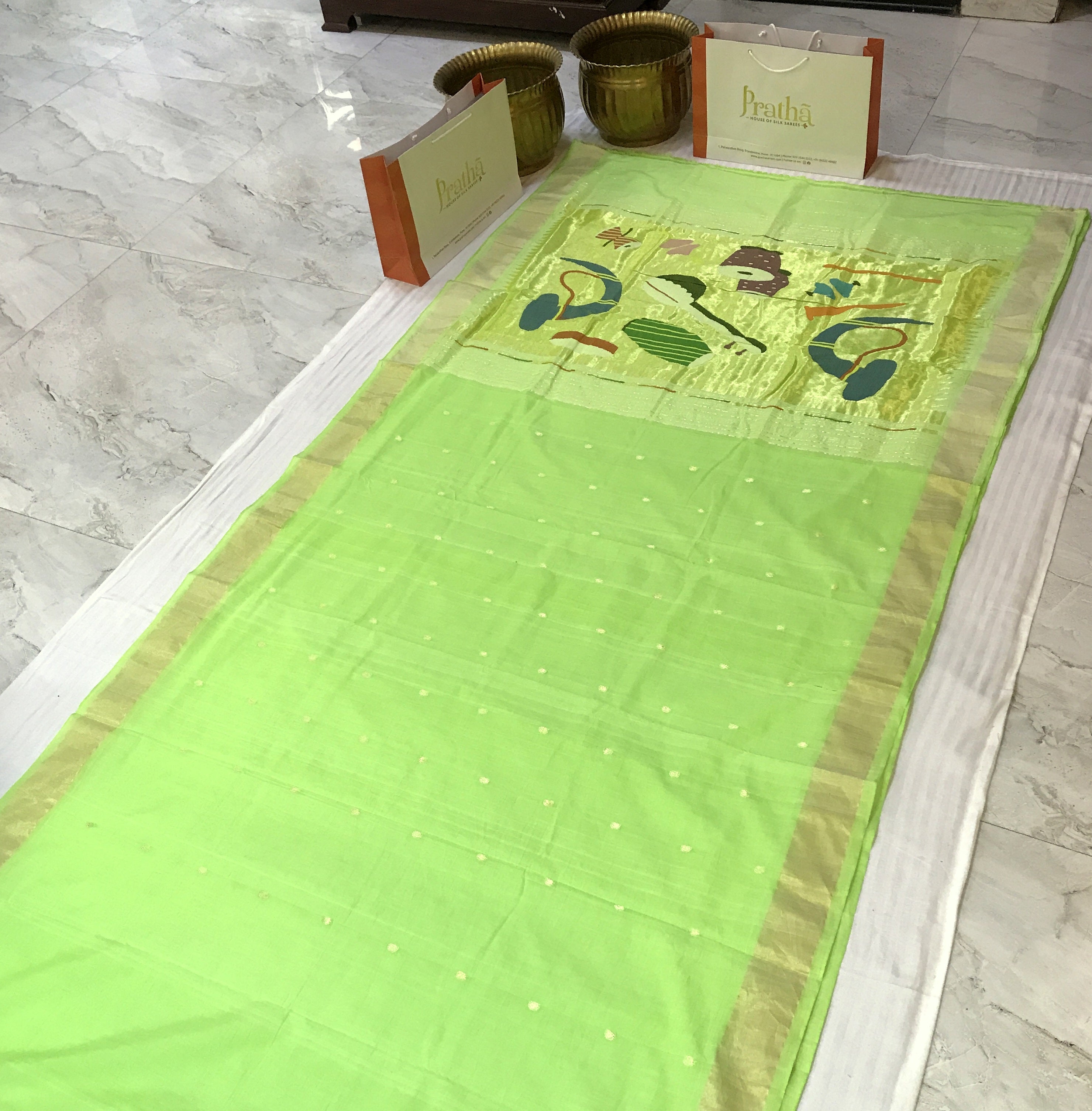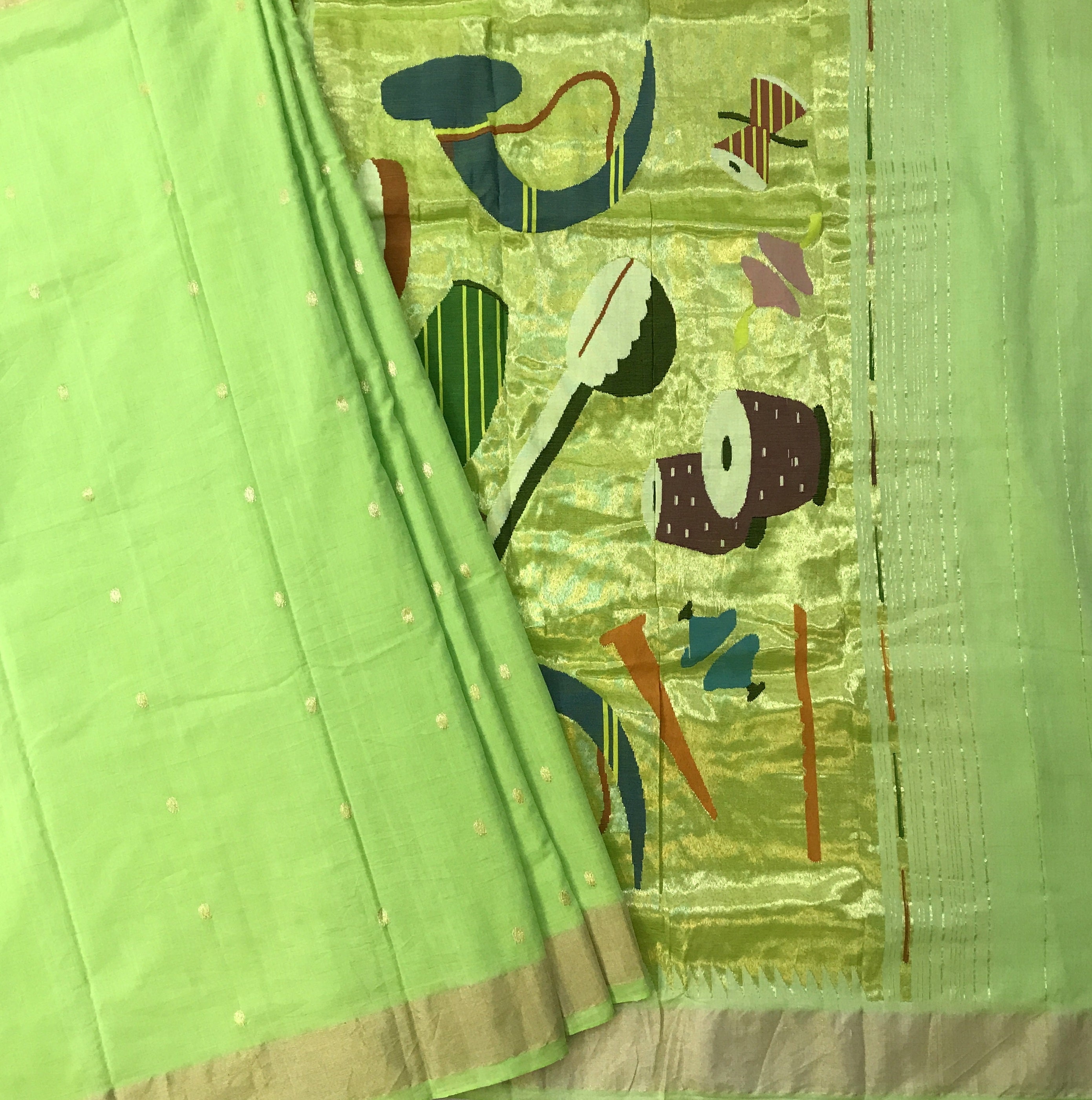 Handwoven with care, this elegant saree features a rich green hue adorned with a self-colored golden zari traditional border, creating a look that's both timeless and graceful. The highlight of this masterpiece is its special tissue pallu adorned with classic Paithani musical instruments—a beautiful nod to heritage artistry. Lightweight and easy to drape, this saree strikes the perfect balance between casual charm and understated elegance. Whether it's a day function, a festive gathering, or a cultural celebration, this cotton weave is designed to make you feel effortlessly graceful.