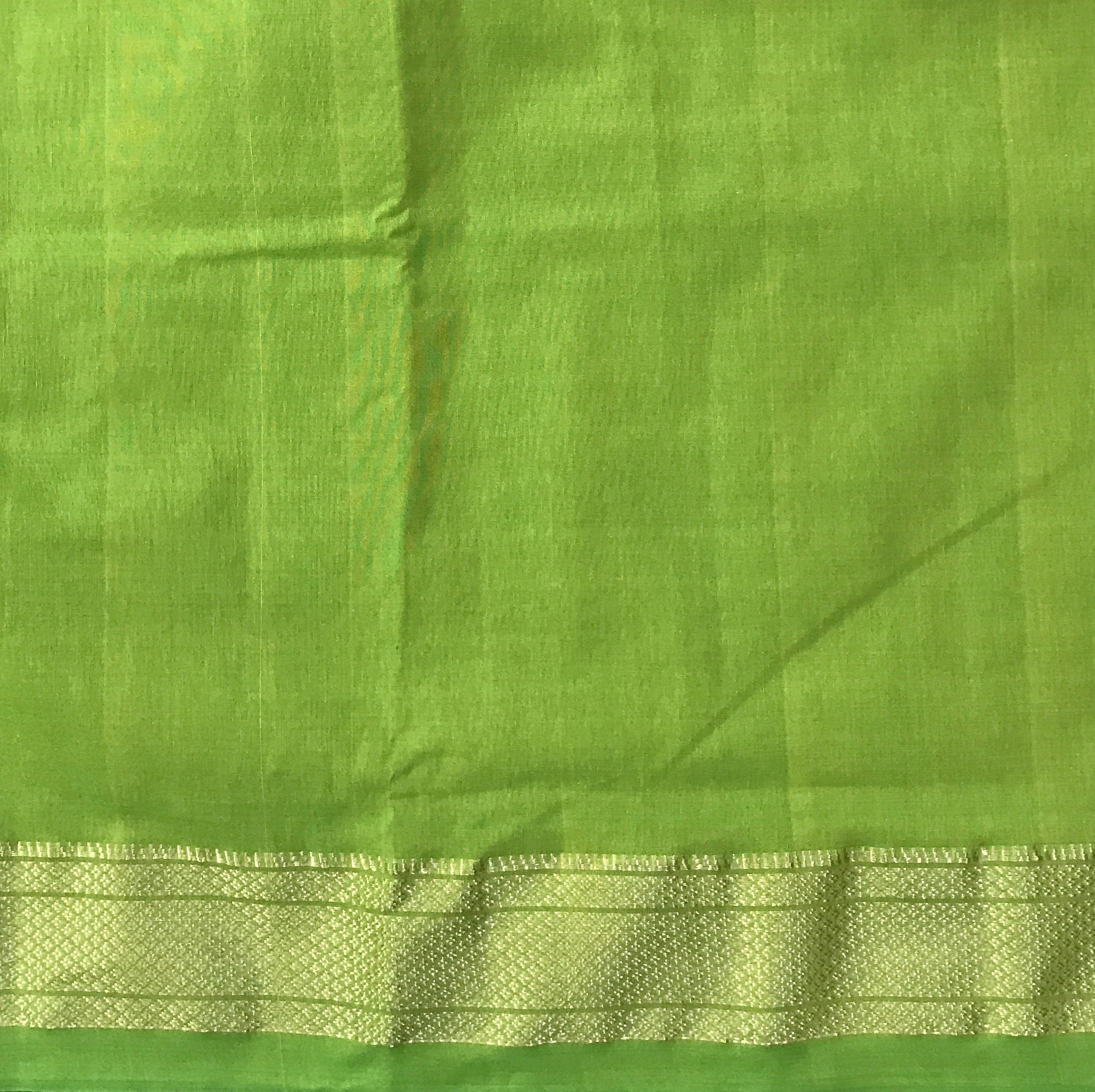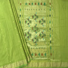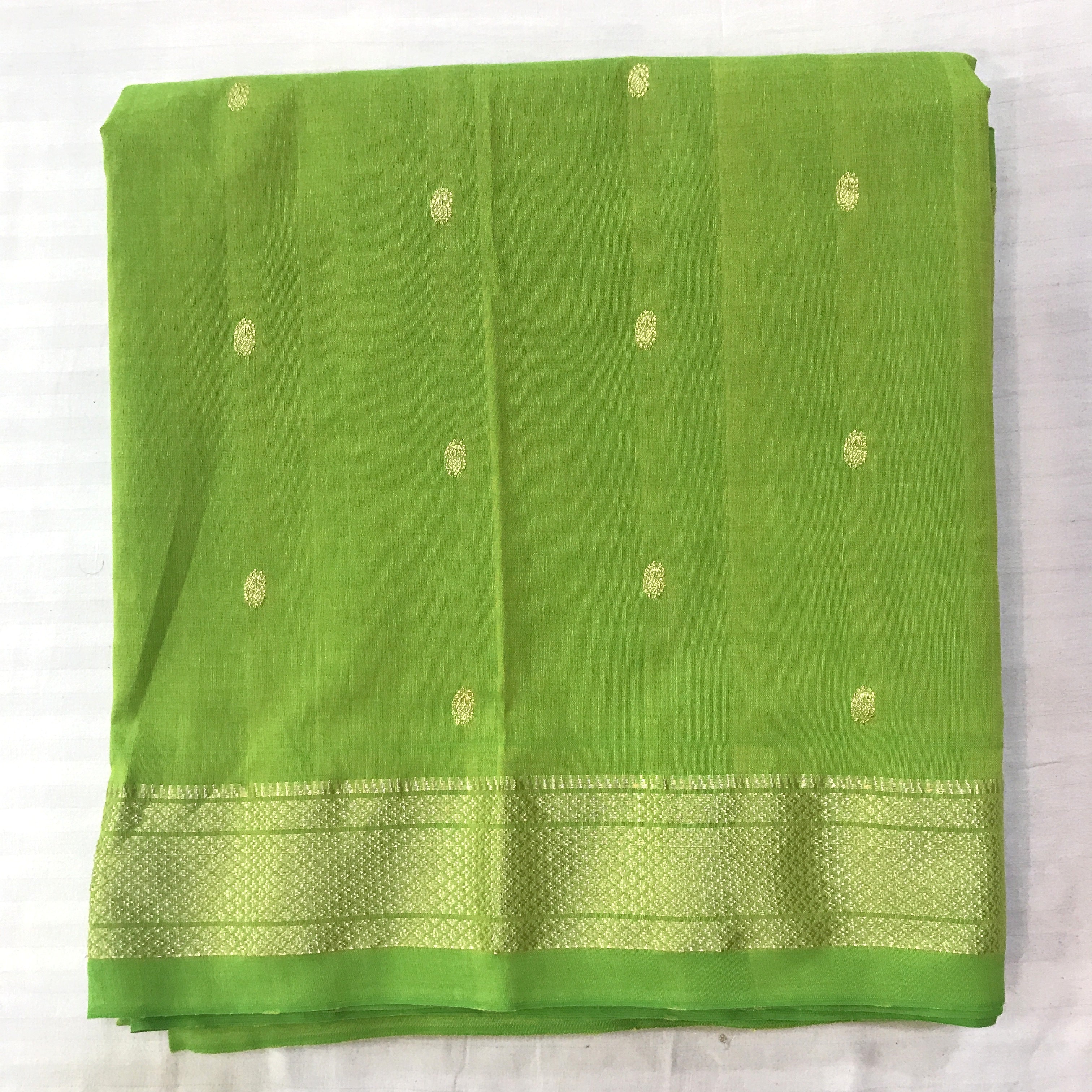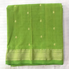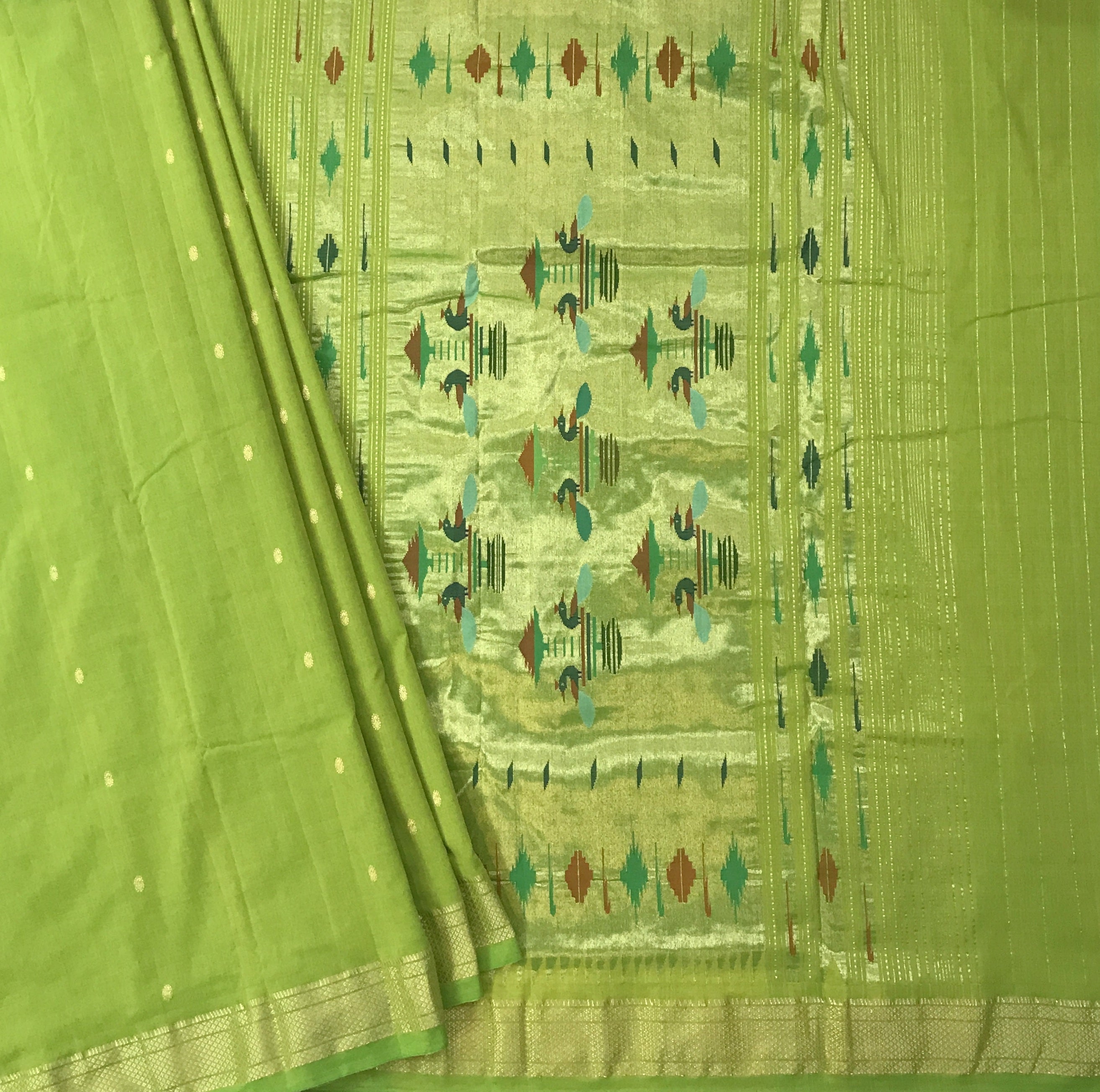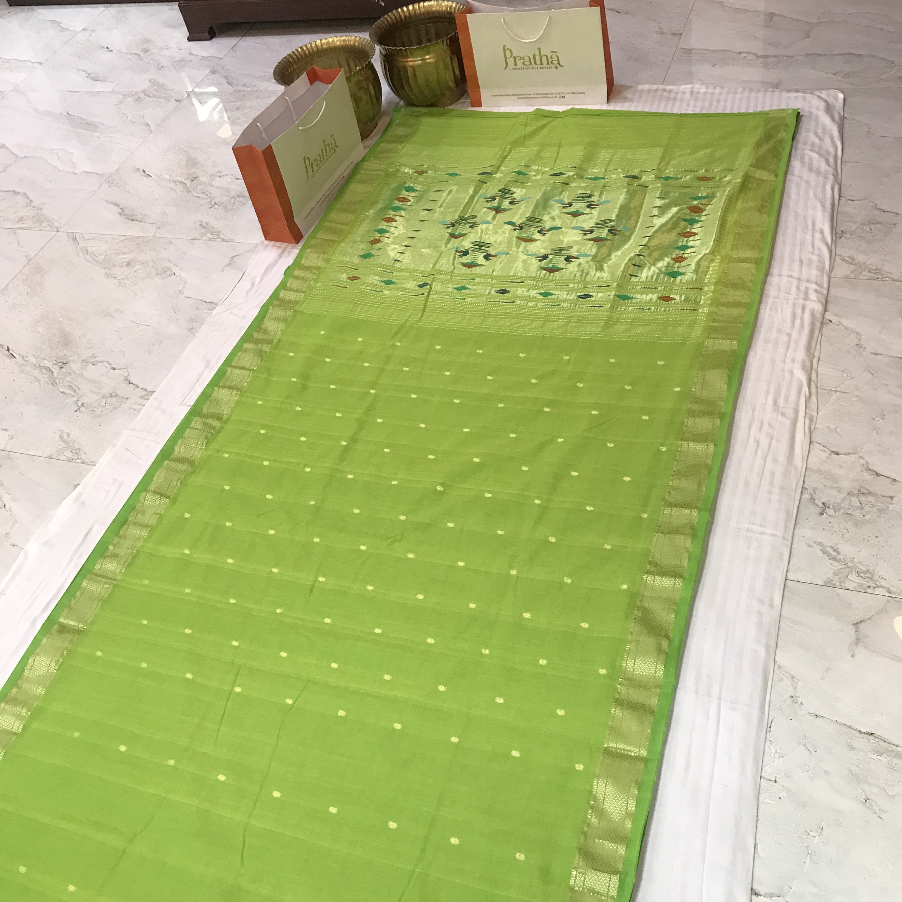 Those who love 'Cotton fabric' will surely love this Cotton Paithani ! This handwoven cotton weave with traditional tissue pallu is incredible. A very beautiful shade of parrot green with a self coloured golden zari traditional border that looks awesome , this definitely going to win your heart. Light in weight and easy to drape, this Cotton Paithani is Casual yet elegant, simple yet graceful one can flaunt this saree at a variety of occasions!