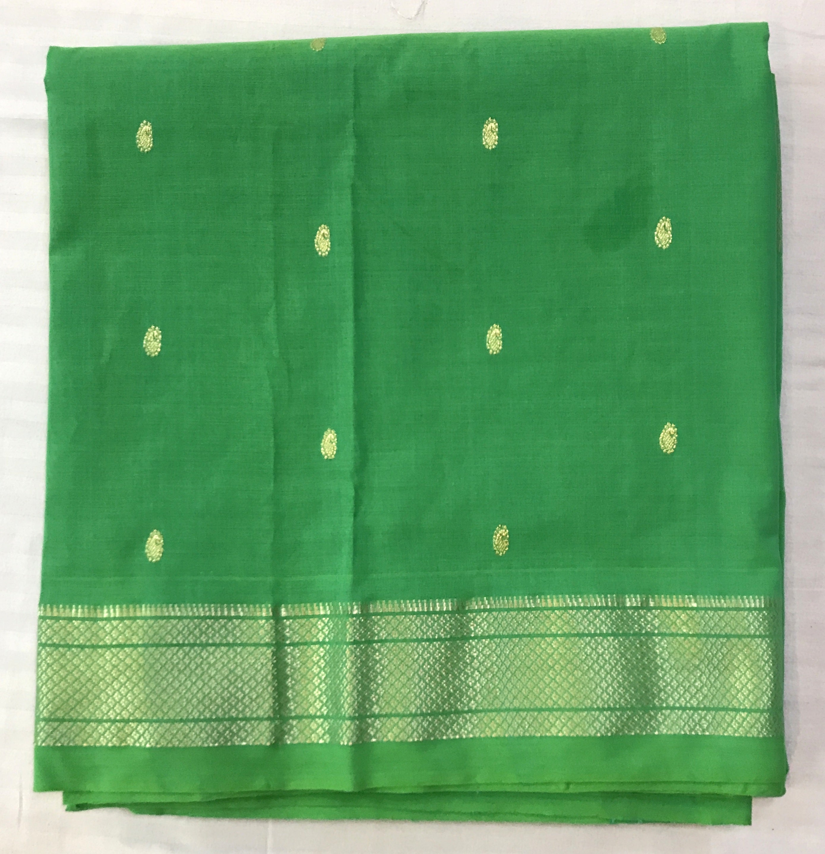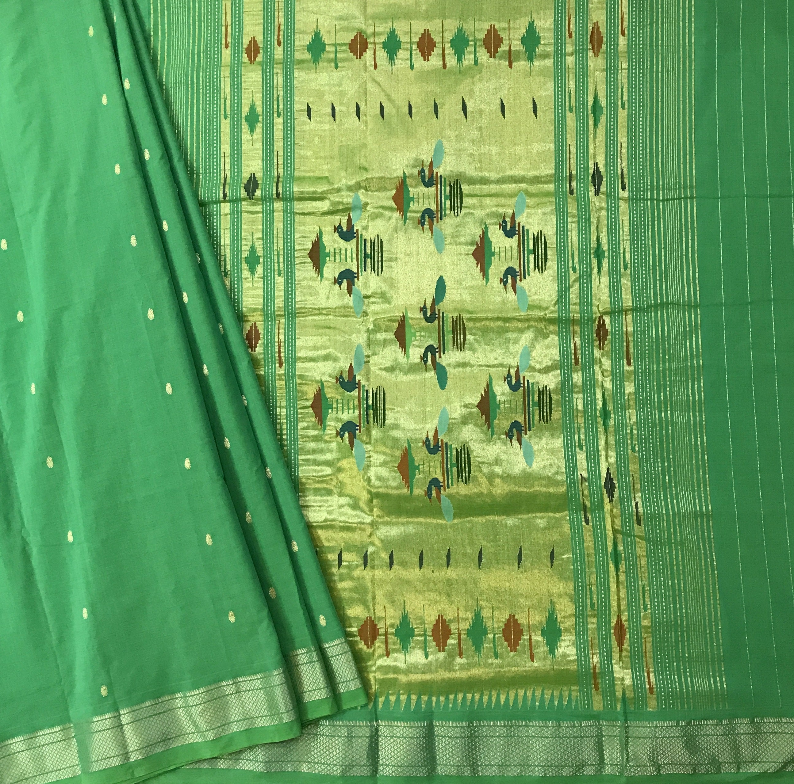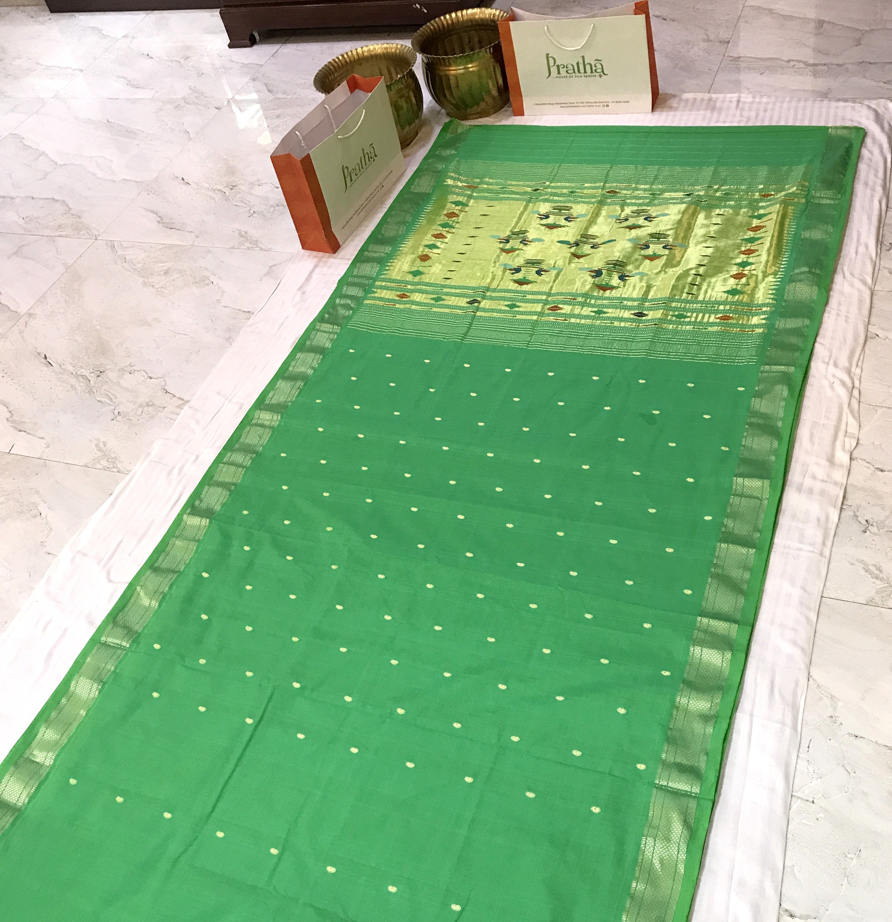 Those who love 'Cotton fabric' will surely love this Cotton Paithani ! This handwoven cotton weave with traditional tissue pallu is incredible. A very beautiful shade of green with a self coloured golden zari traditional border that looks awesome , this definitely going to win your heart. Light in weight and easy to drape, this Cotton Paithani is Casual yet elegant, simple yet graceful one can flaunt this saree at a variety of occasions!